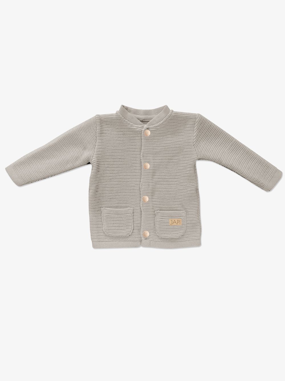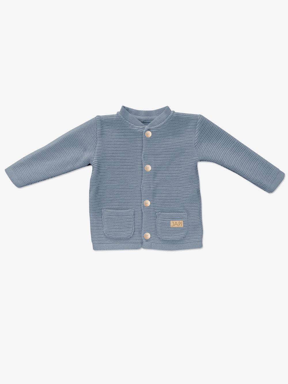 Pleasant children's sweater knitted with a delicate pattern. Completed with small front pockets. The children's sweater is fastened with wooden buttons, thanks to which it looks stylish. You can find it in brown and blue colors, which match the clothes from this collection. Create a kit for a little boy.