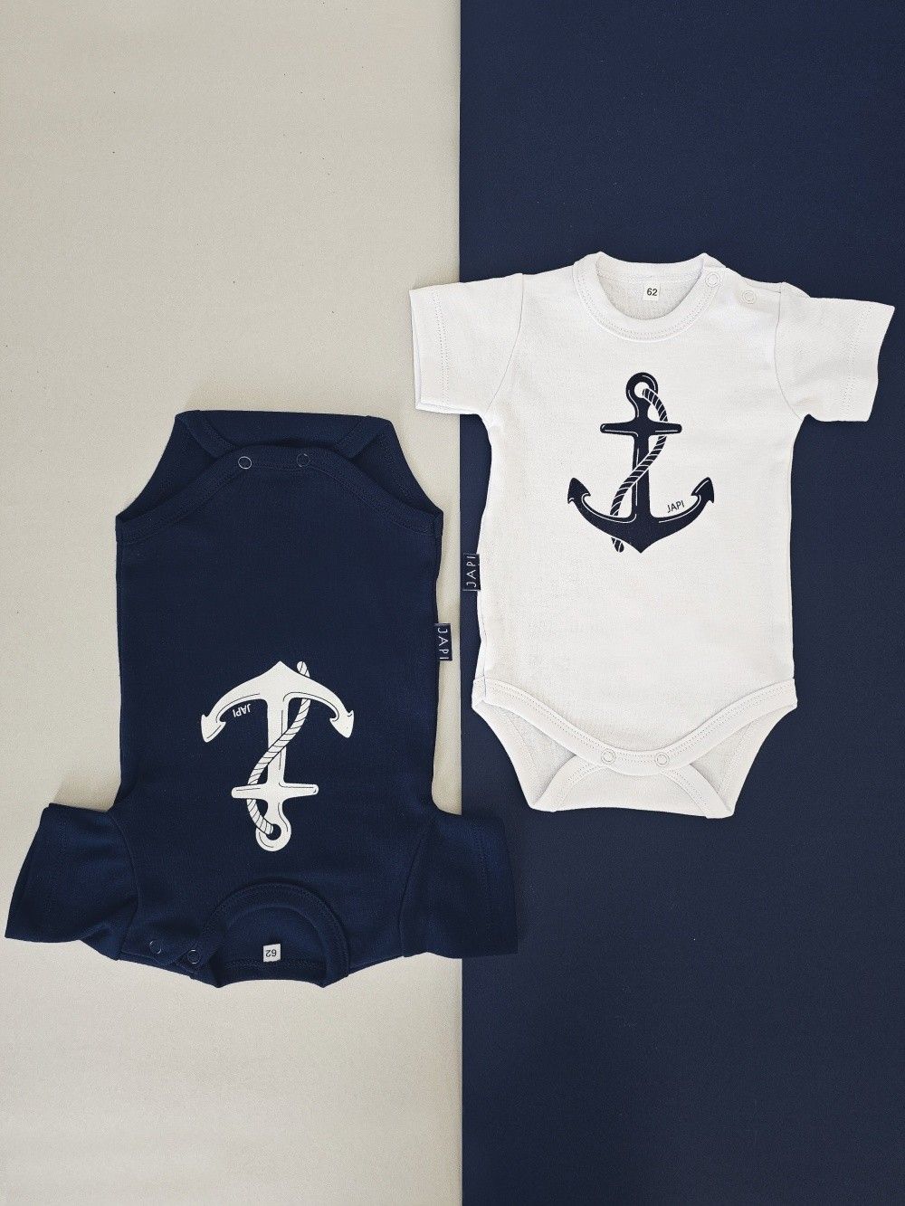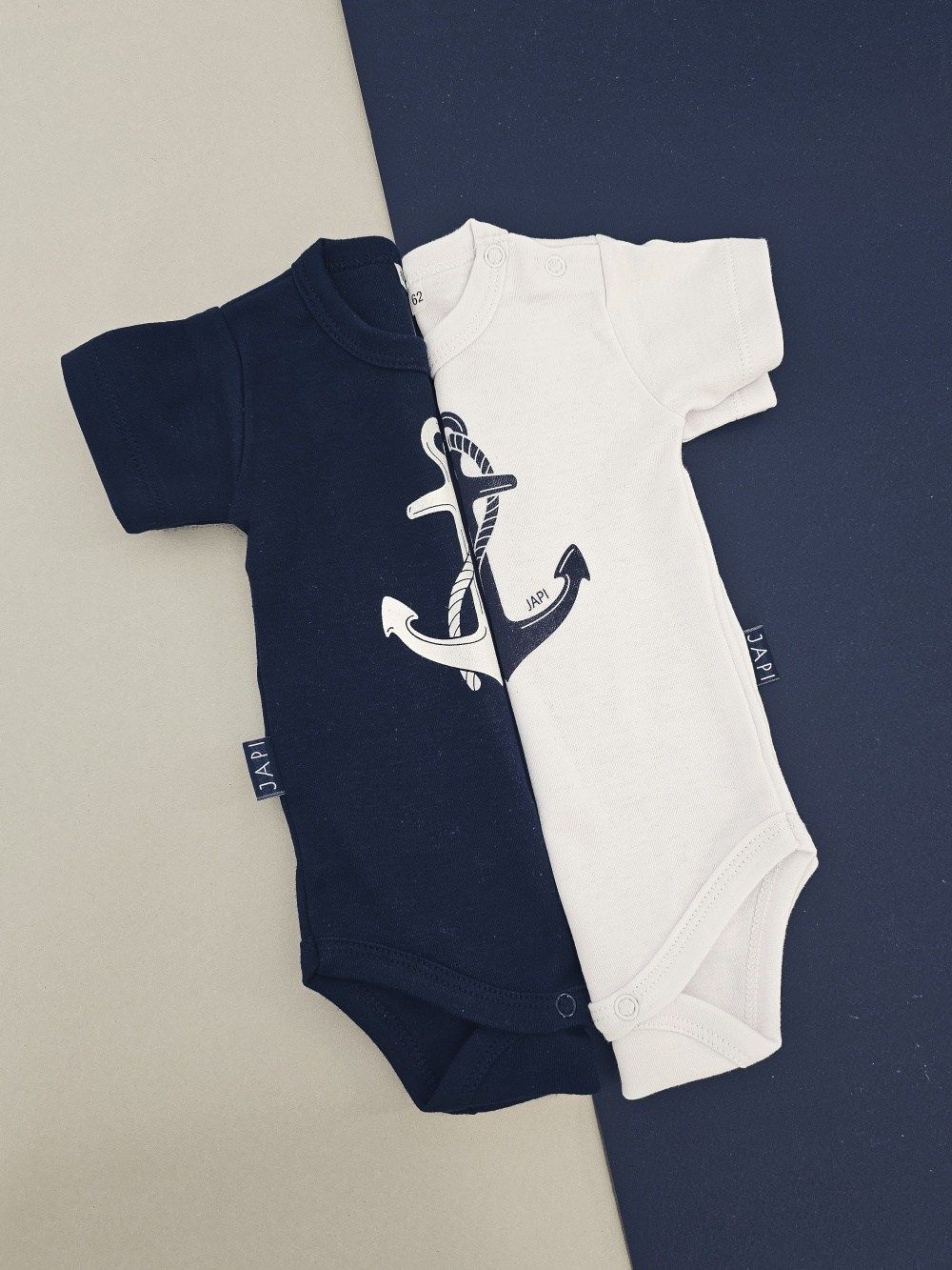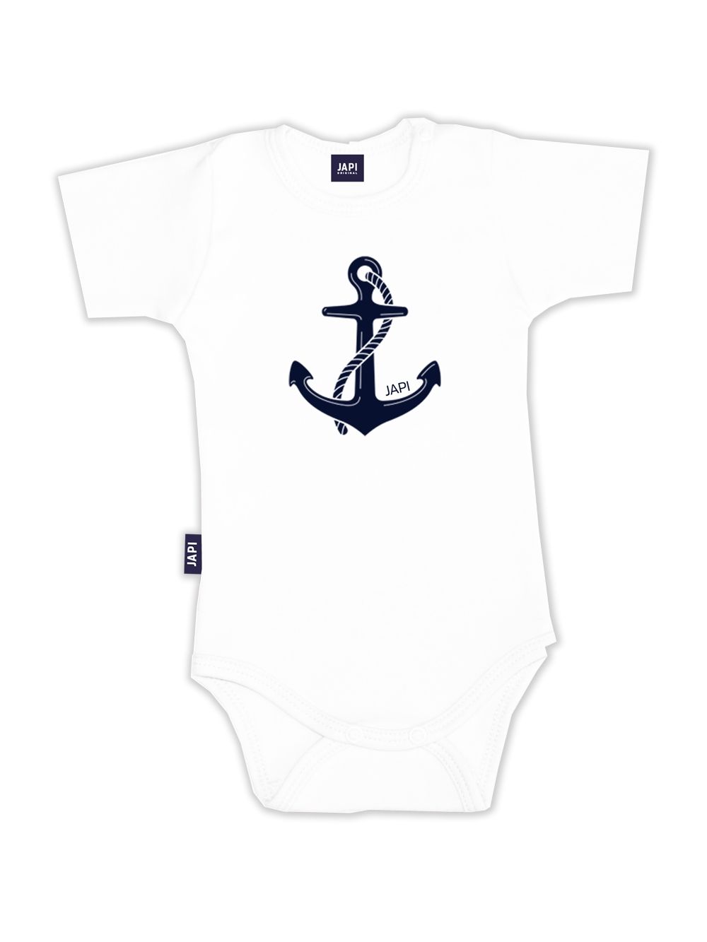 The short sleeve baby bodysuit is a great choice for warmer days. Made from soft cotton with a beautiful anchor motif. Practical snap closures make dressing and changing easier. Available in white and navy blue.