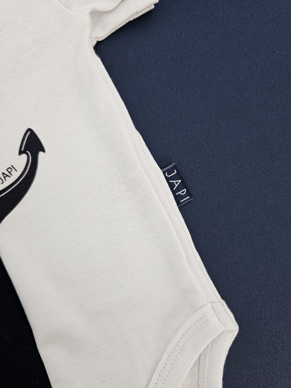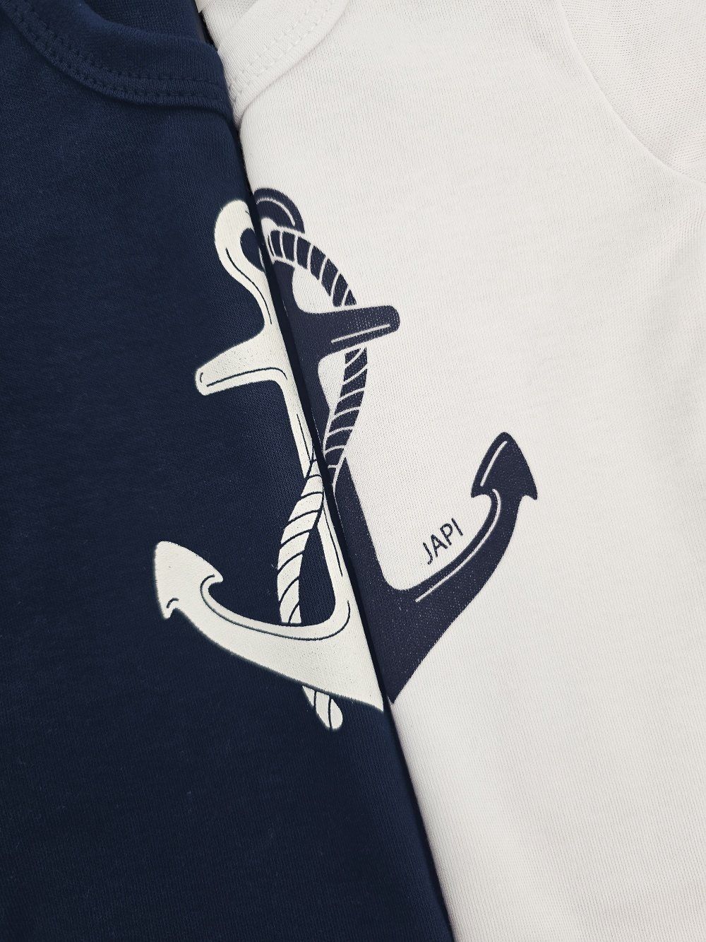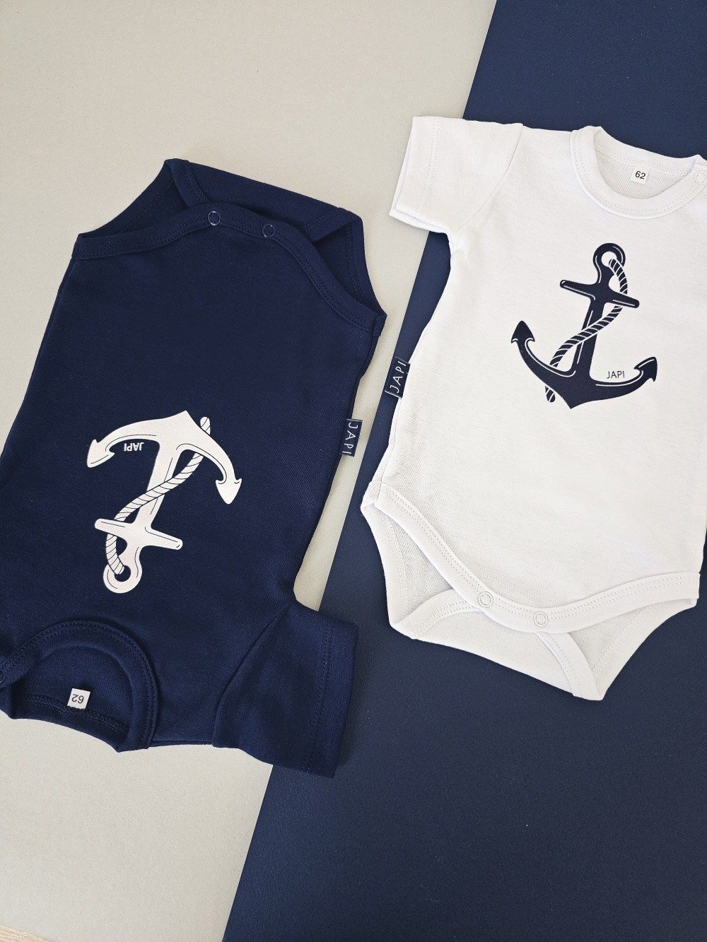The short sleeve baby bodysuit is a great choice for warmer days. Made from soft cotton with a beautiful anchor motif. Practical snap closures make dressing and changing easier. Available in white and navy blue.