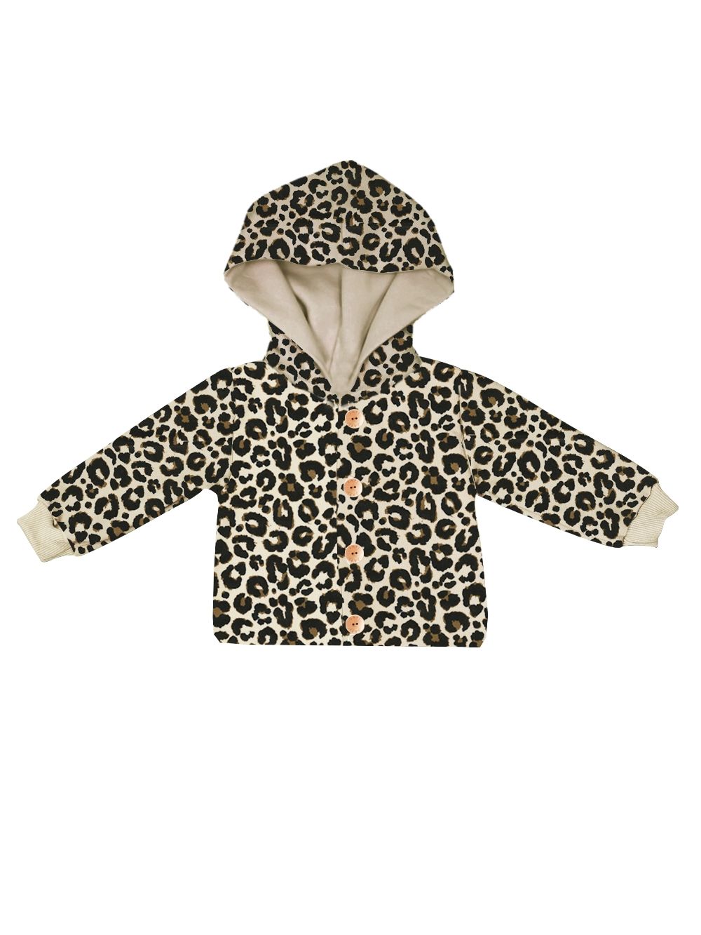 This stylish kids’ hoodie with a leopard print is perfect for little adventurers. The hoodie is made from a soft and breathable fabric that ensures all-day comfort. The lined hood provides extra protection from wind and cold, while the practical wooden button closure makes dressing easier. Elastic cuffs on the sleeves ensure the hoodie stays in place and doesn’t ride up. The bold leopard print adds a playful and original touch to the outfit. A great choice for autumn walks, outings, or simply for everyday wear with a bold style.