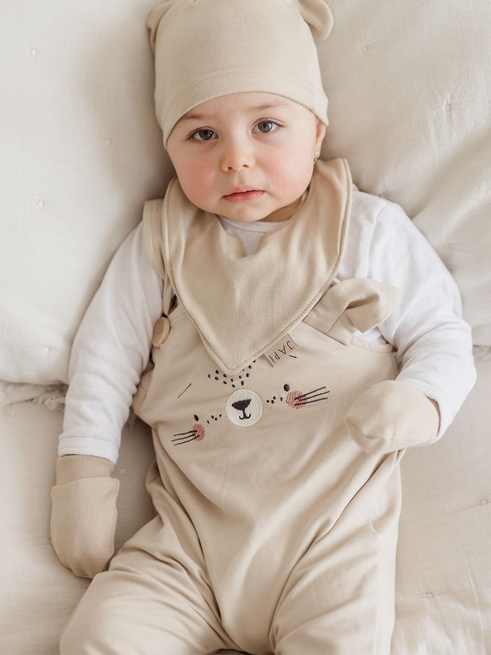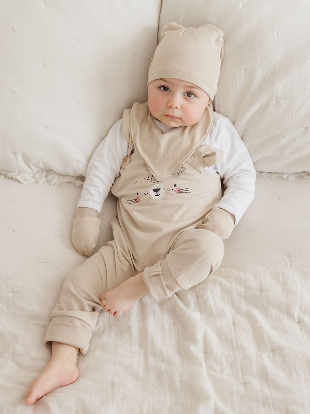 The gloves have a comfortable cut and are made of 100% cotton knit. You can find them in pink and beige and you can complete them with a hat with ears or a bib.