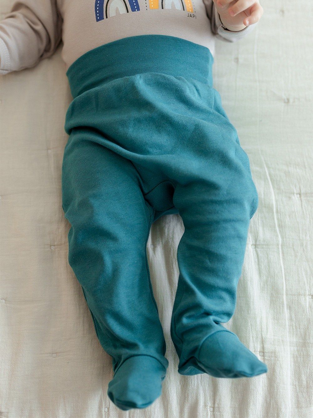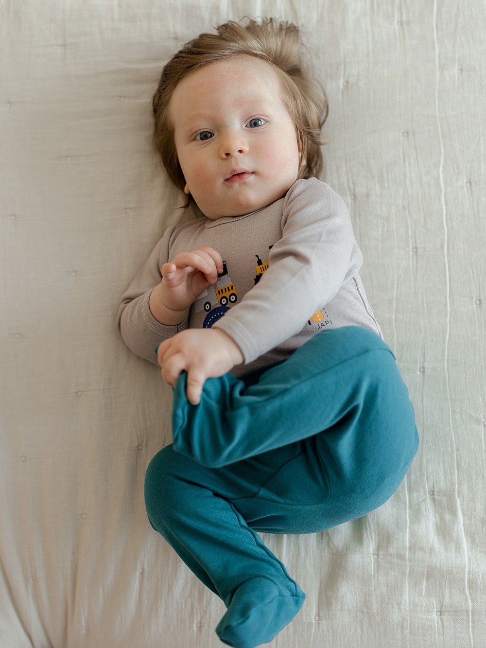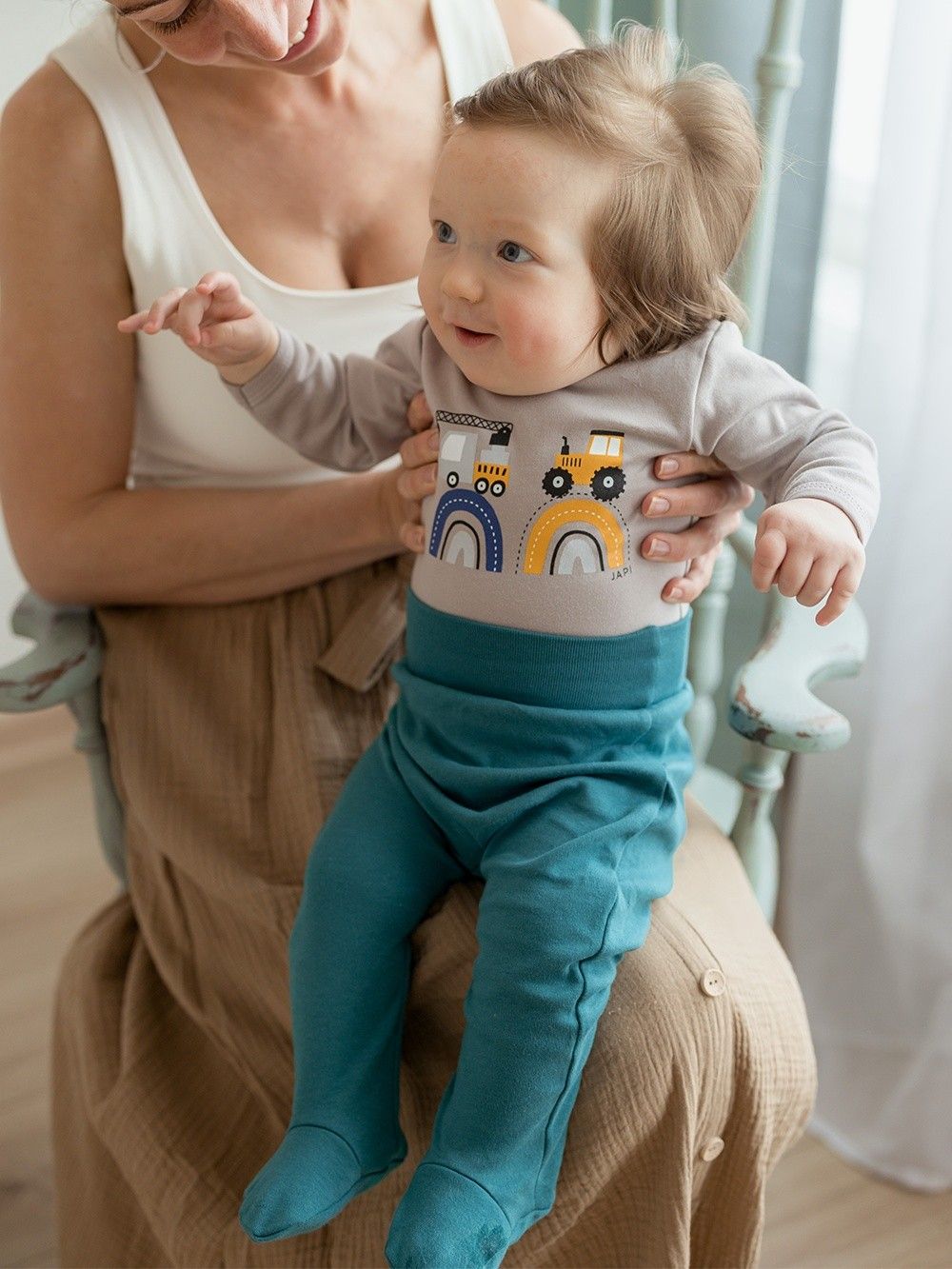A practical piece of children's wardrobe that you will certainly appreciate. Footie trousers protect the baby's legs altogether. The comfortable wider waistband with elastic does not press the baby. The print on the bottom with working machines is a nice addition that makes this clothing original.