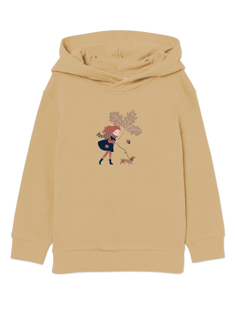 This girls' hoodie is made for chilly autumn days full of adventure. The front features an illustration of a girl walking her dog under falling leaves, creating a fairytale and playful design. Made from soft fabric, it offers cozy warmth and comfort all day long. The hood adds practicality and protects against wind. Long sleeves and the hem are finished with ribbed cuffs, ensuring a snug fit. The brown, pink, and green tones reflect the colors of autumn and easily match with trousers or sweatpants.
