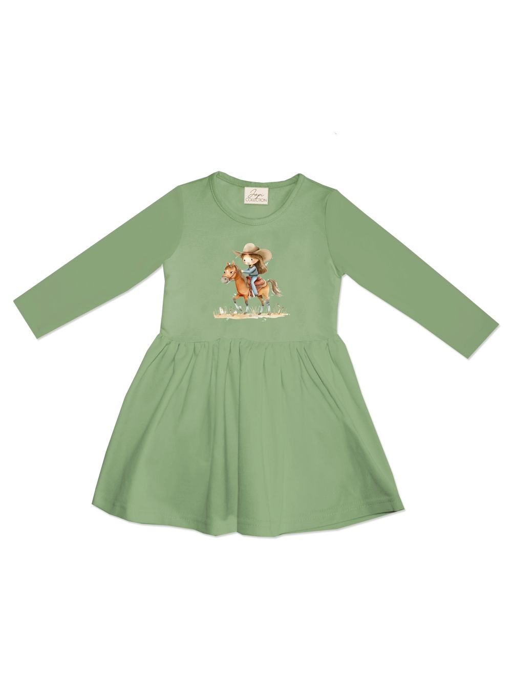 The WESTERN girls' dress with long sleeves is a cute and comfortable piece that every little cowgirl will love. The front is decorated with an original illustration of a girl on a horse, giving the dress a playful and western-inspired touch. The dress has a classic cut with long sleeves and a slightly gathered skirt, allowing freedom of movement while looking girly and romantic. It is made from soft and pleasant fabric, ensuring all-day comfort and gentleness on children's skin. Available in three beautiful shades – light brown, powder pink, and fresh green – easy to pair with leggings, tights, or a hoodie. A perfect choice for school days, parties, family trips, or everyday wear.