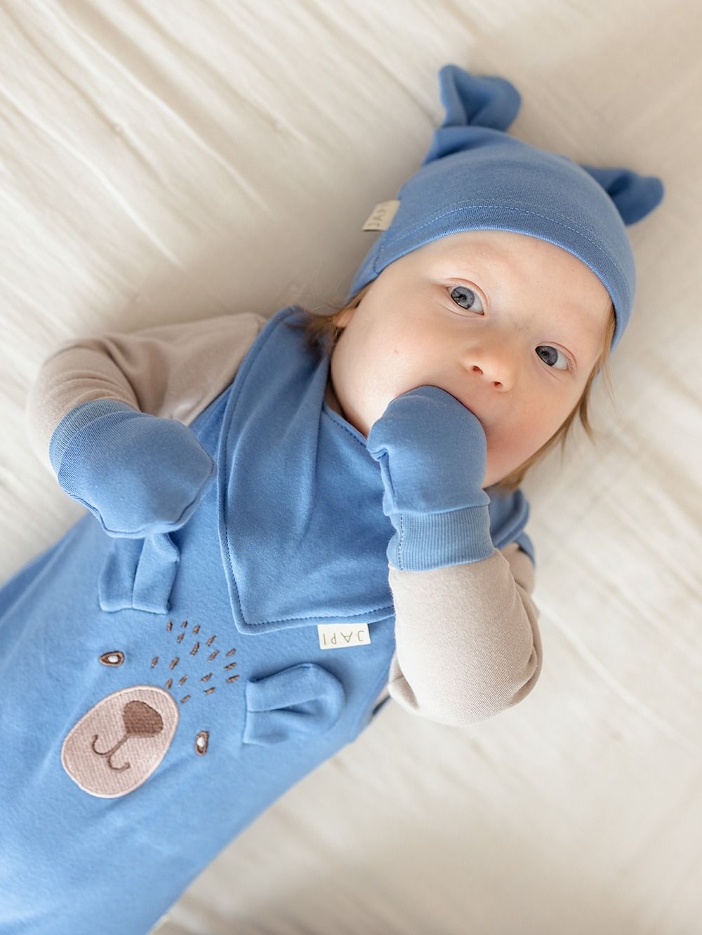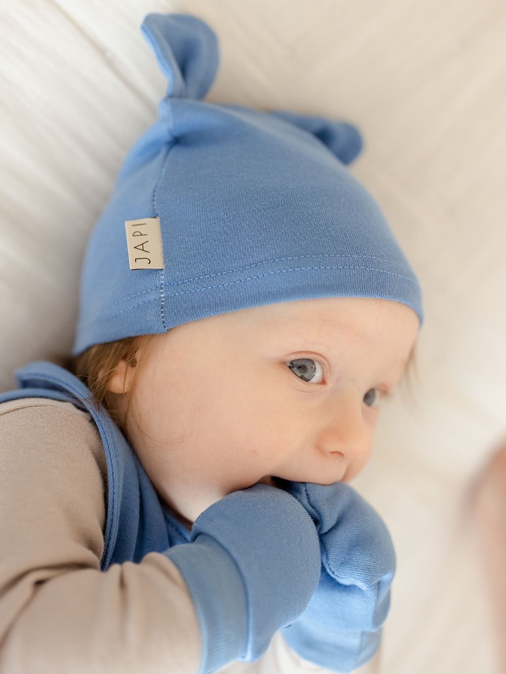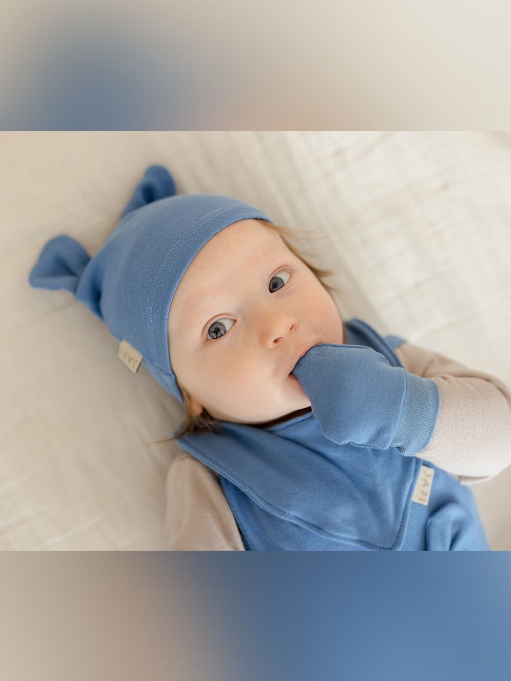 The hat covers the head and ears and thus protects the baby from cold and wind. Together with gloves and a bib, you can create a matching set.