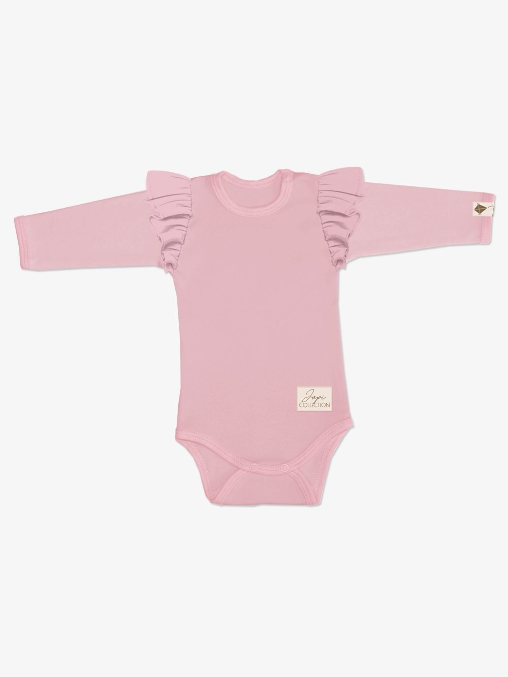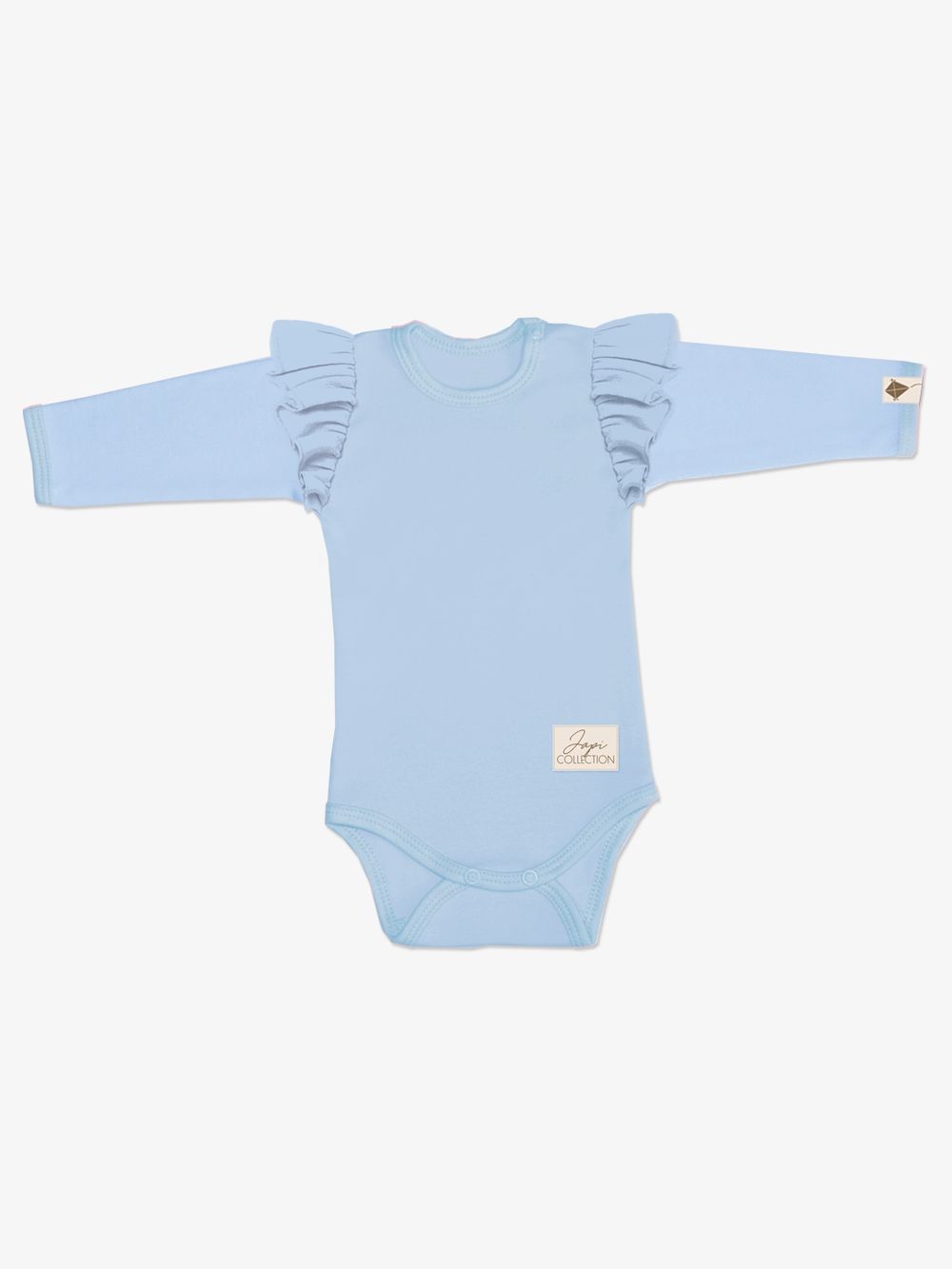 Children's one-colour bodysuit with long sleeves Bodysuit for girls in pastel colours with long sleeves. The one-colour pieces are easy to combine. The ruffles on the straps look very nice. Quality certified materials are also suitable for new-borns.