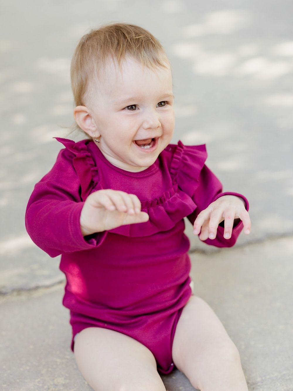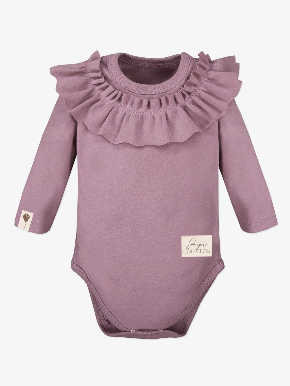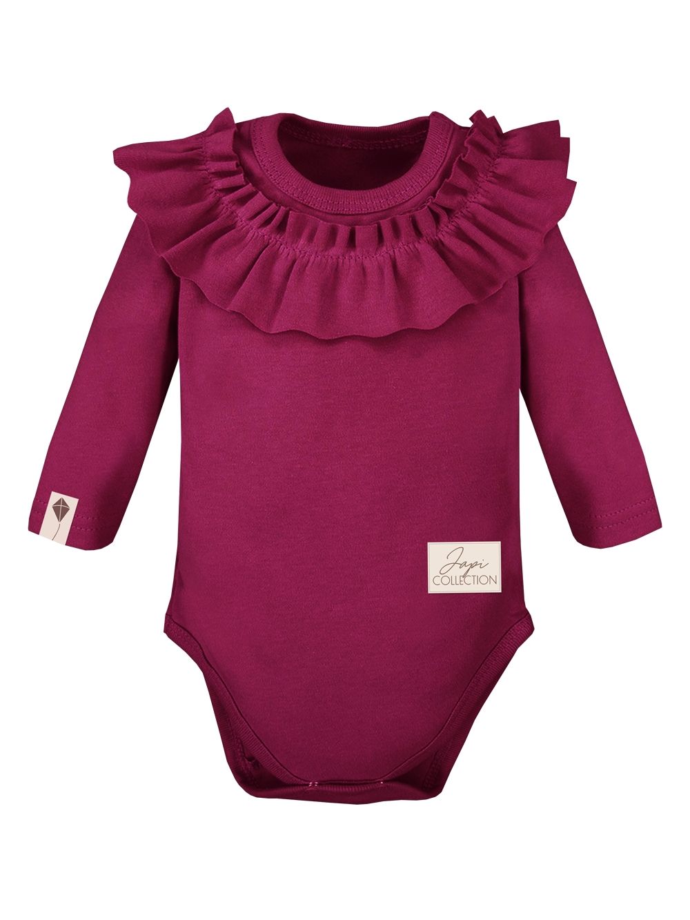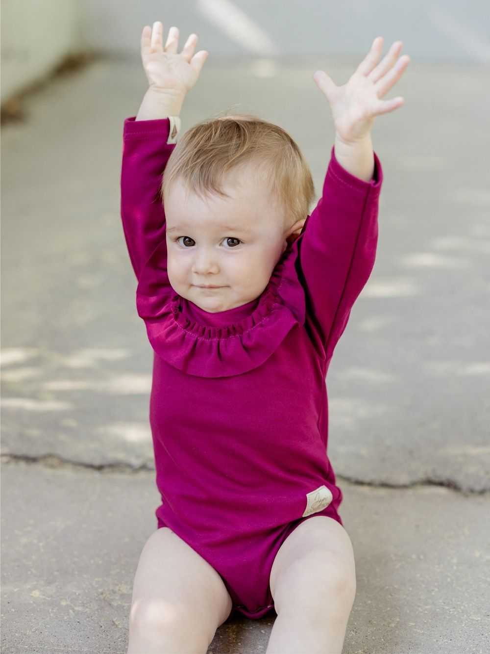 Girl's children's bodysuit with long sleeves. One-color cotton material, a comfortable cut and a beautiful ruffle around the neck that will make them special. You can find us in two girl's colours in sizes from 56 to 104. A practical one-color piece that can be easily combined. A ruffle makes them clothes for festive occasions, for family celebrations.