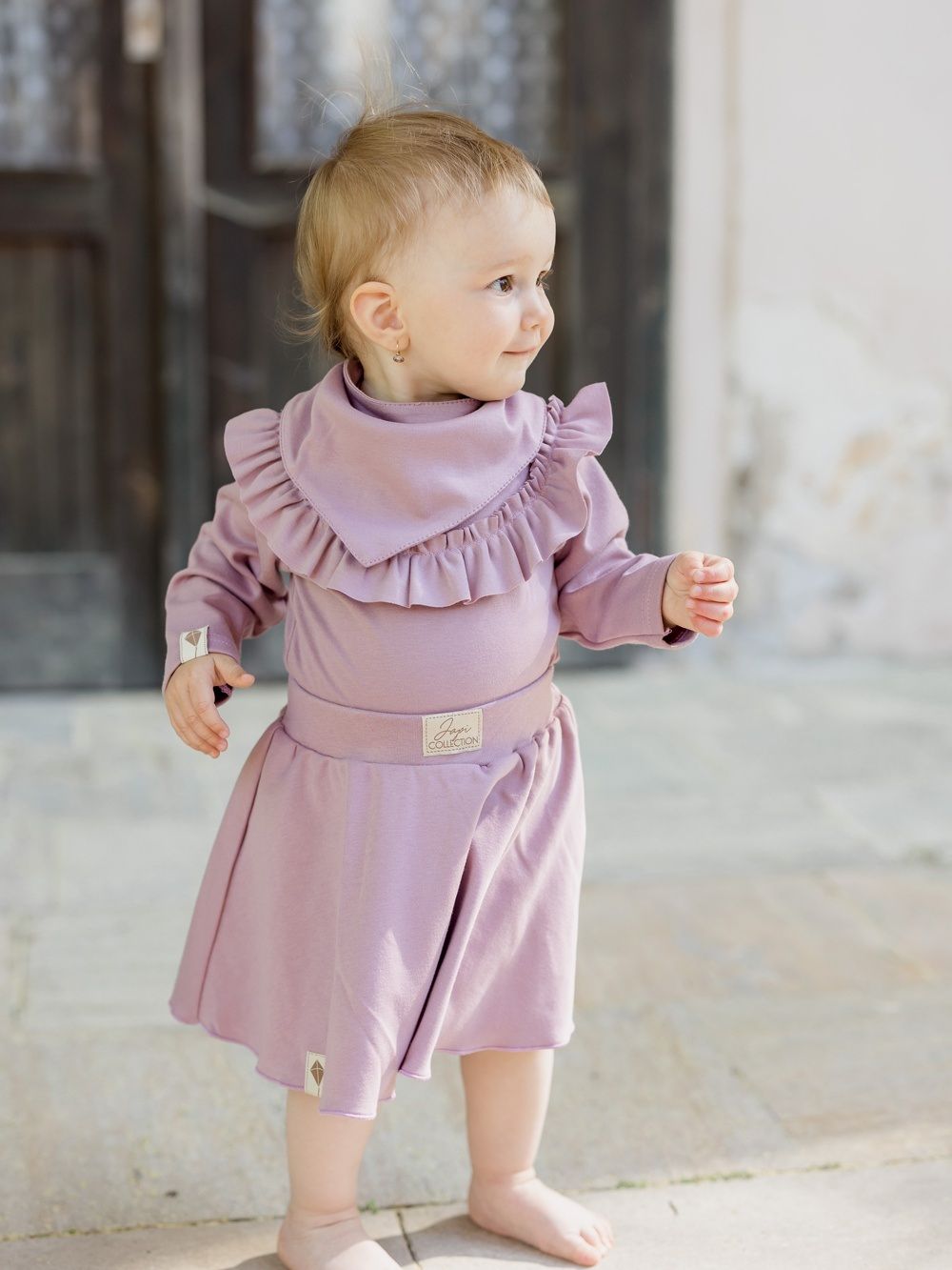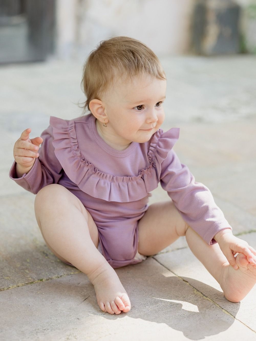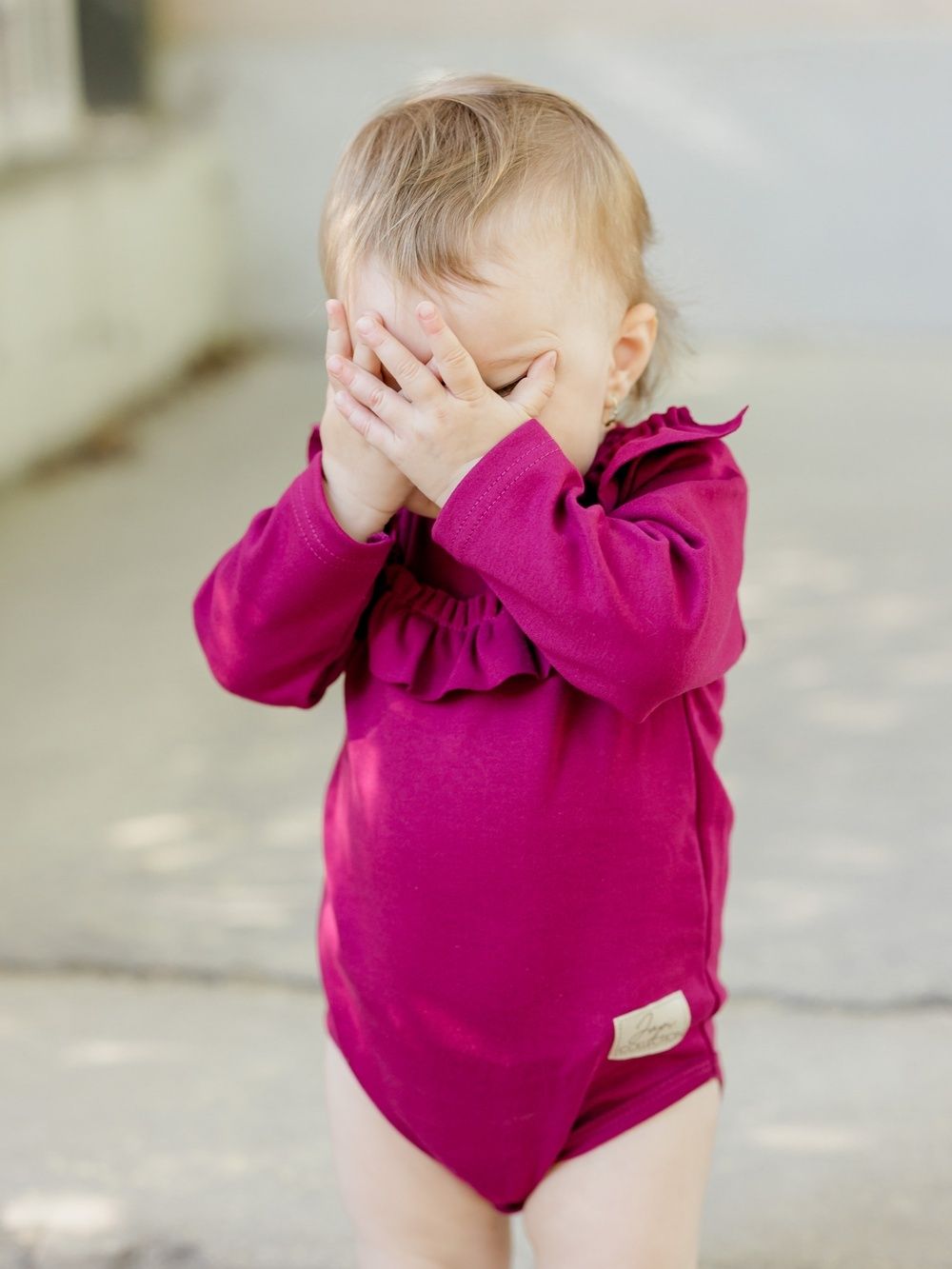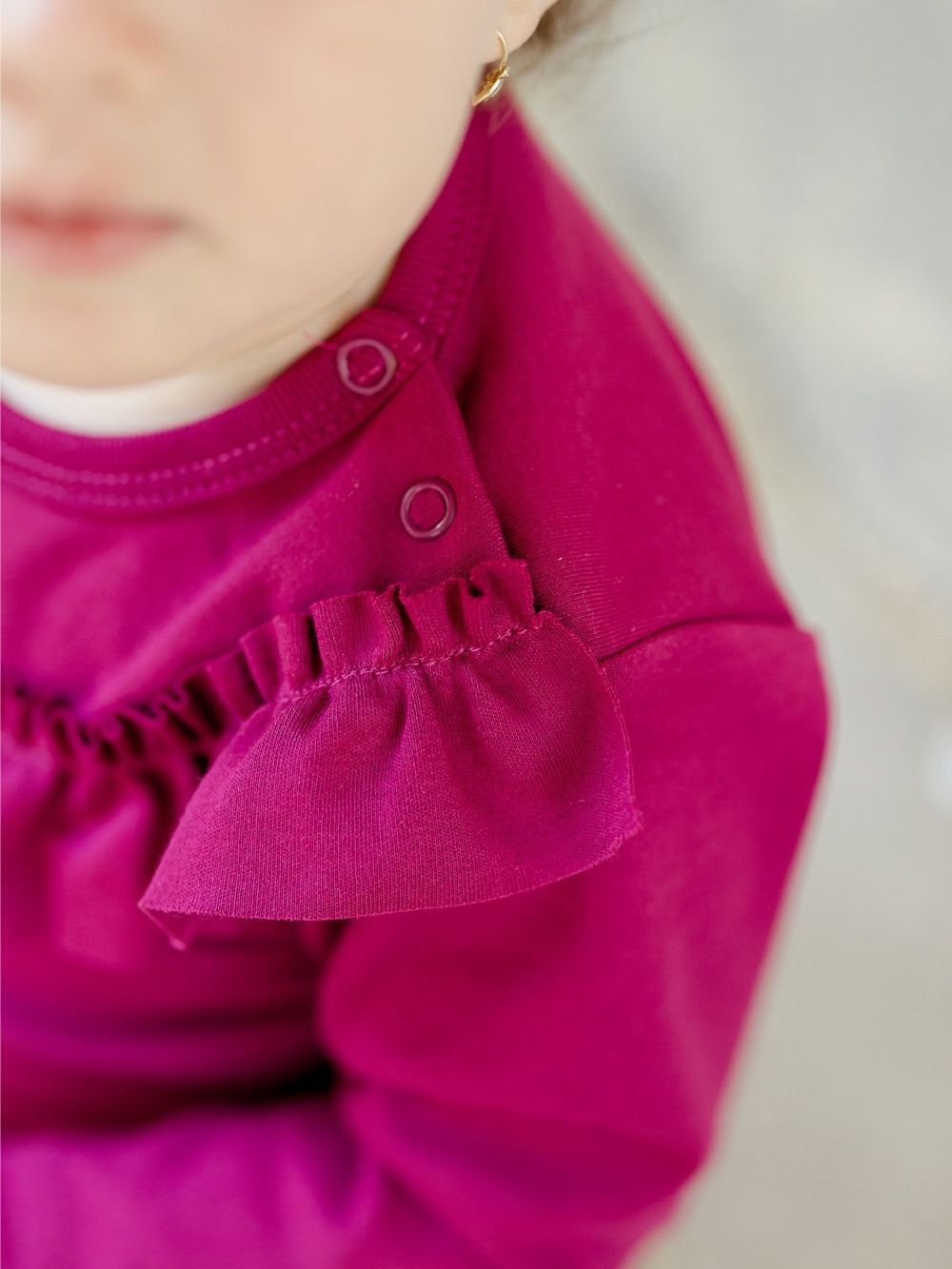 Girl's children's bodysuit with long sleeves. One-color cotton material, a comfortable cut and a beautiful ruffle around the neck that will make them special. You can find us in two girl's colours in sizes from 56 to 104. A practical one-color piece that can be easily combined. A ruffle makes them clothes for festive occasions, for family celebrations.