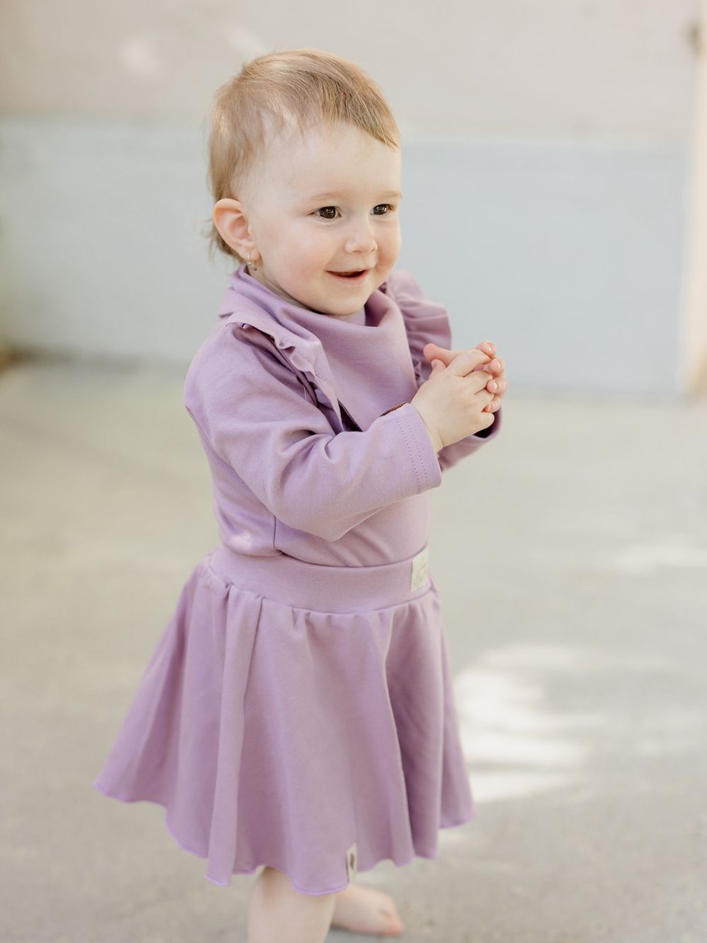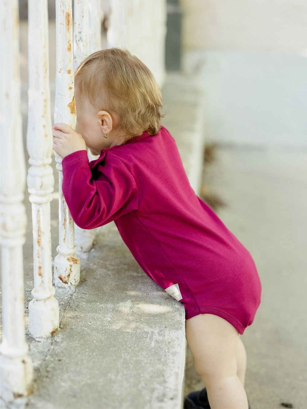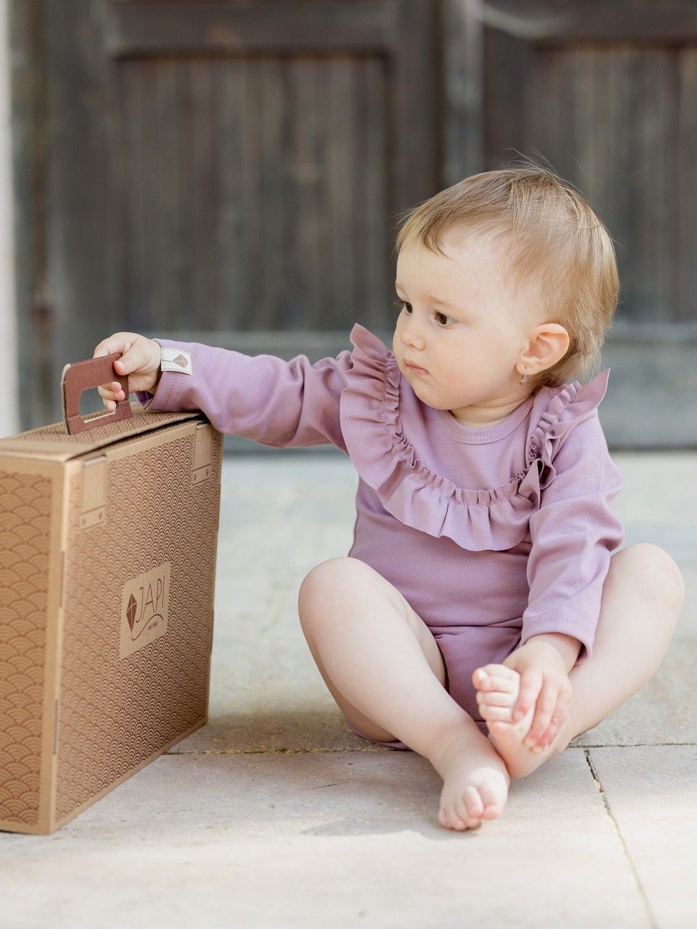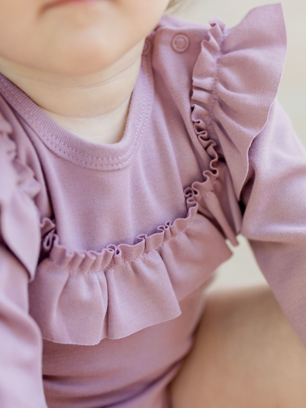 Girl's children's bodysuit with long sleeves. One-color cotton material, a comfortable cut and a beautiful ruffle around the neck that will make them special. You can find us in two girl's colours in sizes from 56 to 104. A practical one-color piece that can be easily combined. A ruffle makes them clothes for festive occasions, for family celebrations.