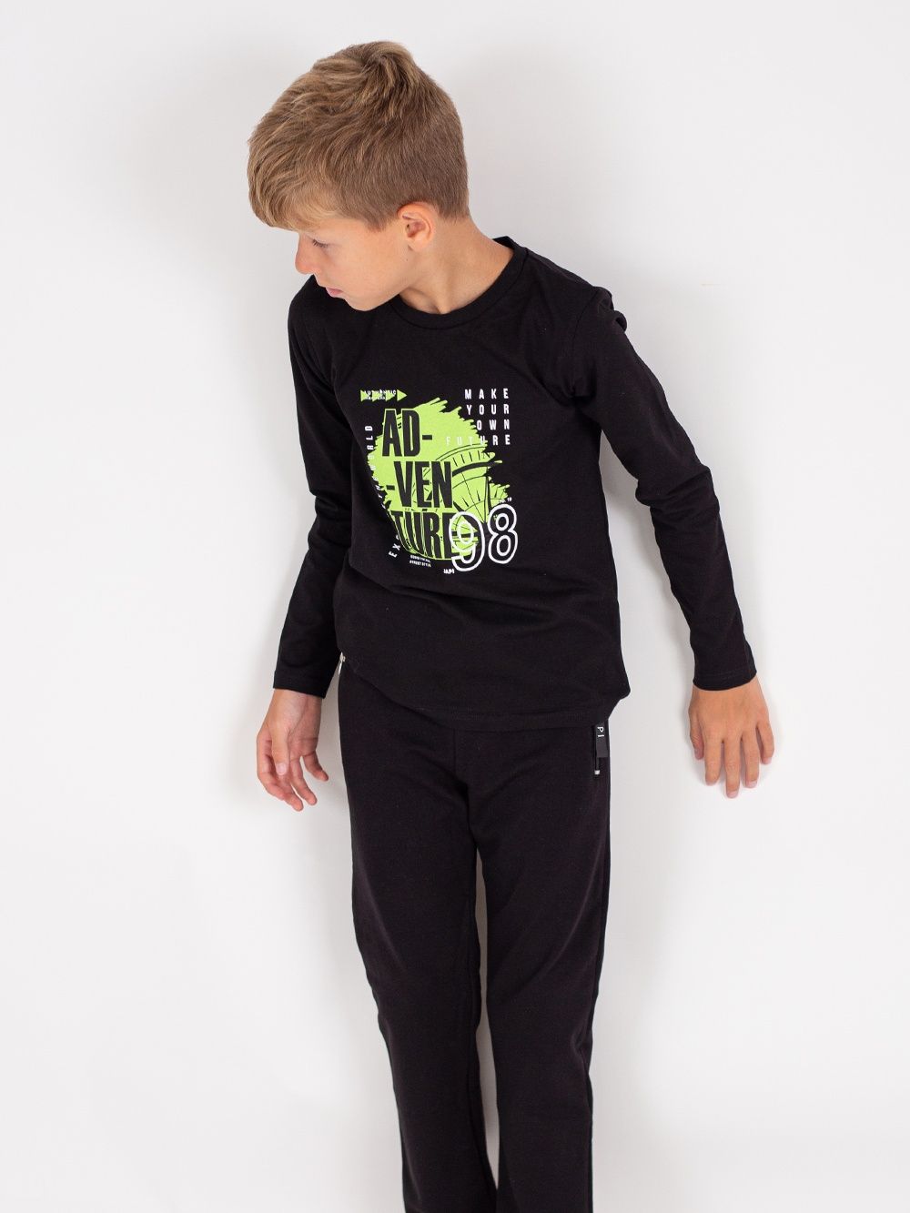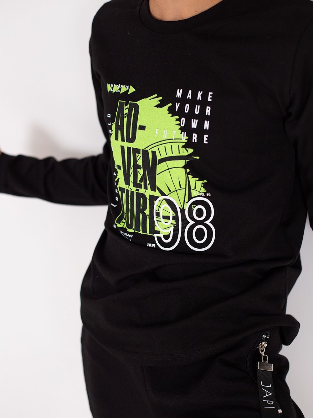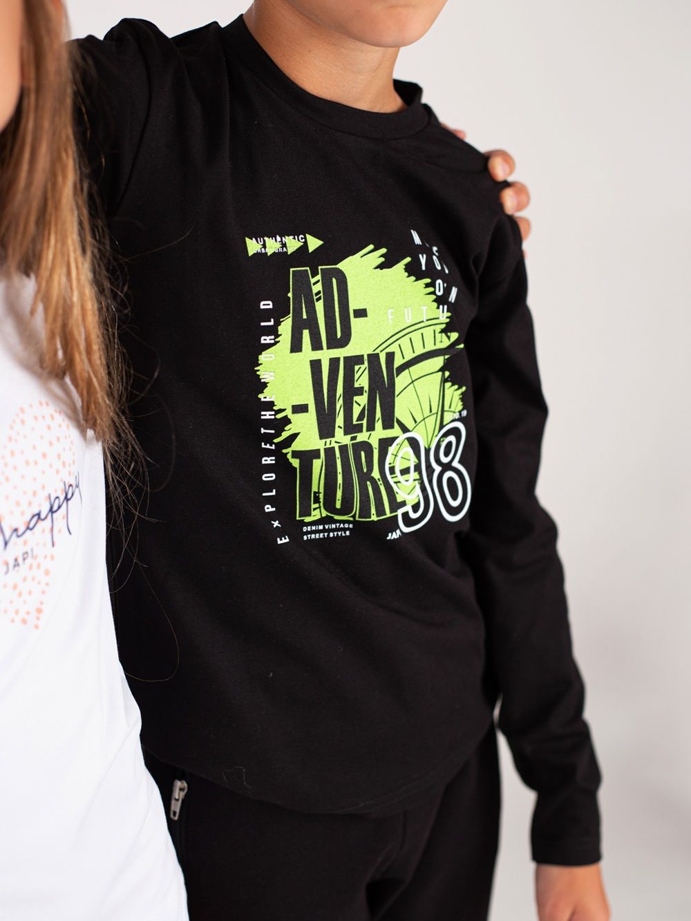 Modern boy's long sleeve t-shirt, perfect for little adventurers. The t-shirt is available in three colors - black, blue, and green. On the front, there is a stylish "Adventure" print, adding to the t-shirt's appeal. Made from high-quality and comfortable material, ensuring comfort throughout the day. Great for everyday wear and special occasions. A perfect piece for active boys.