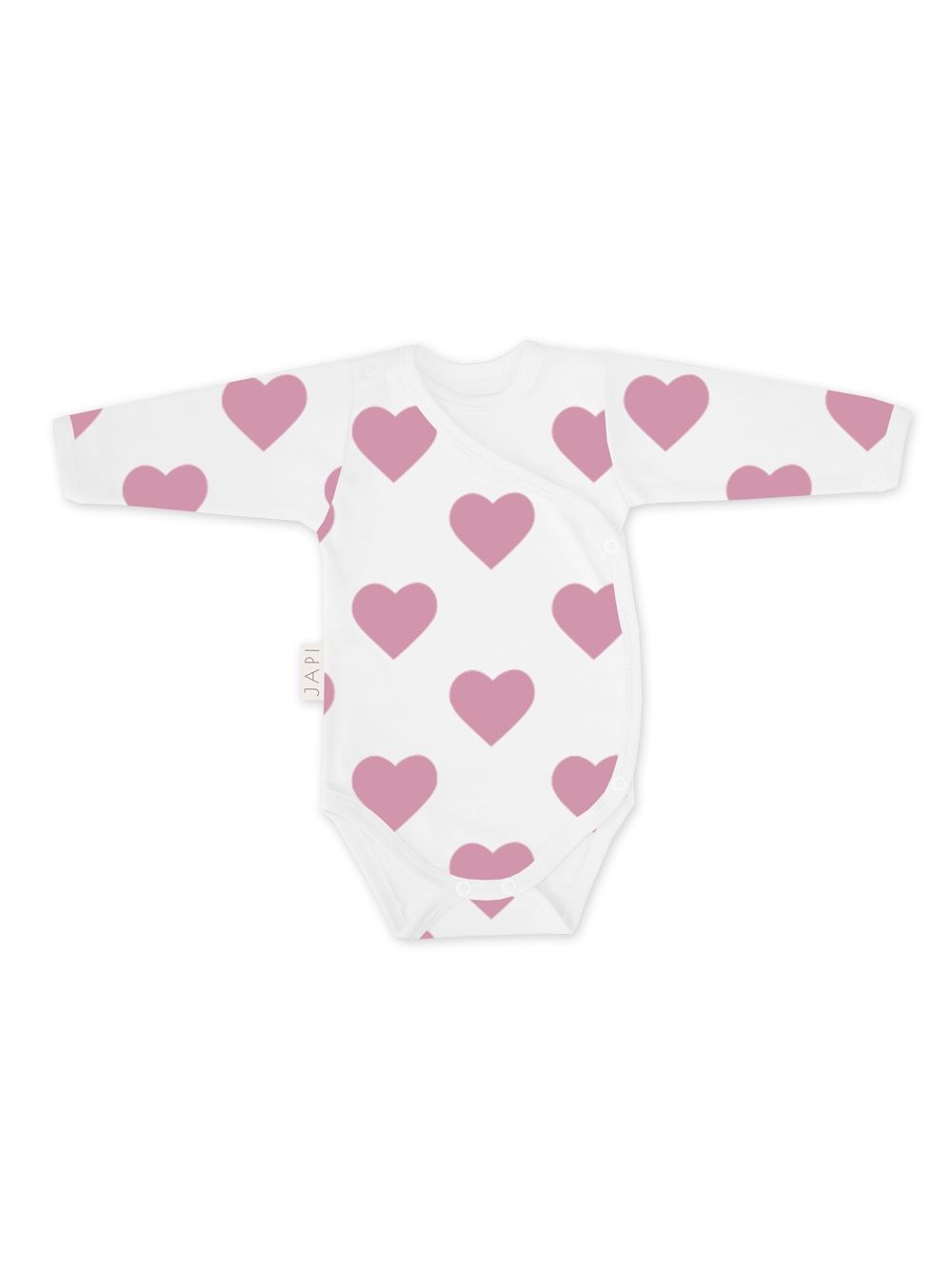 This crossbody baby bodysuit is very practical thanks to the crossbody design, which allows for easy dressing and undressing. With a beautiful heart pattern and soft material, it is ideal for everyday wear. Available in three colors: white, purple, and pink.