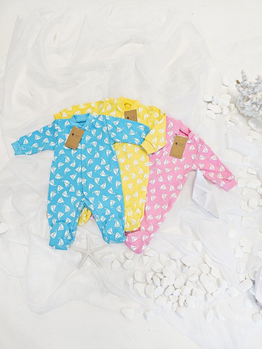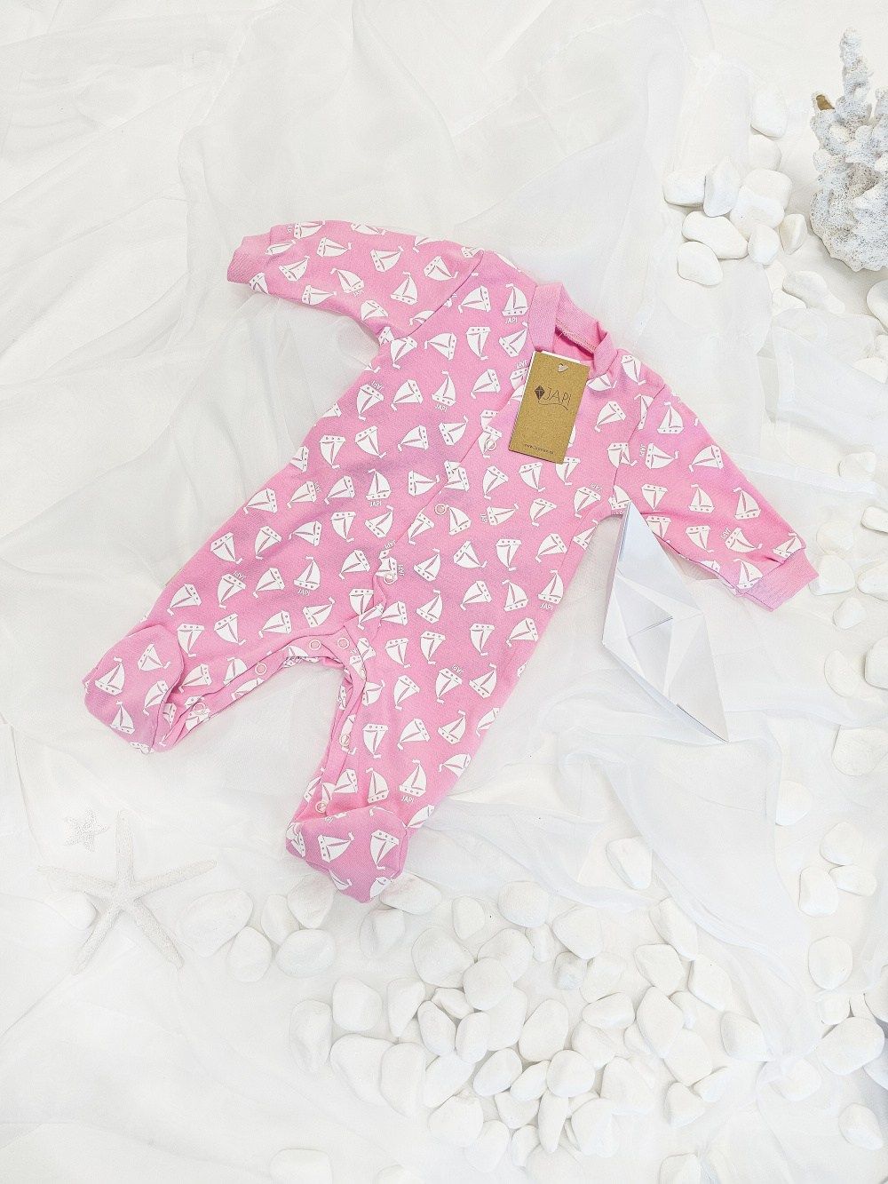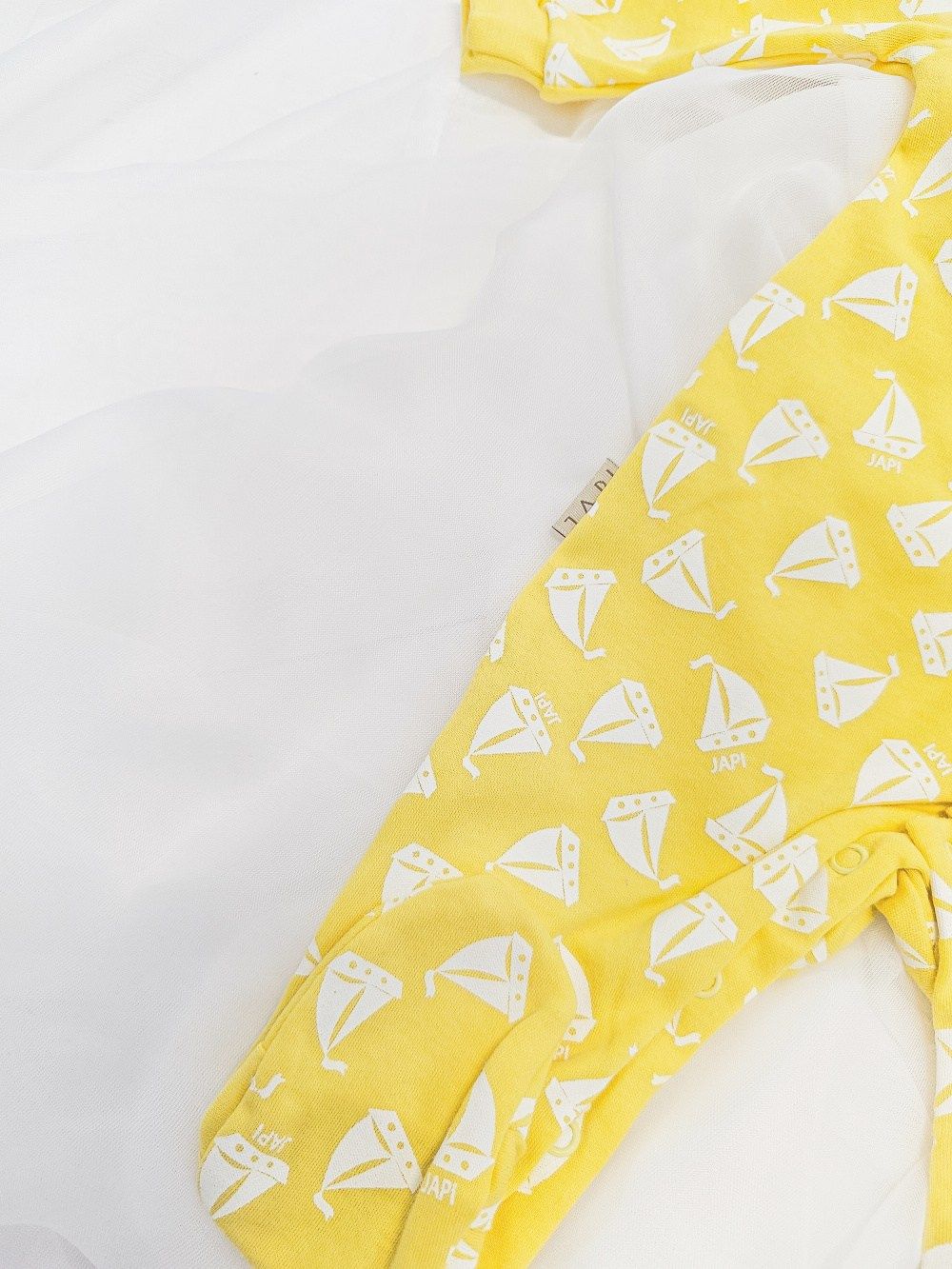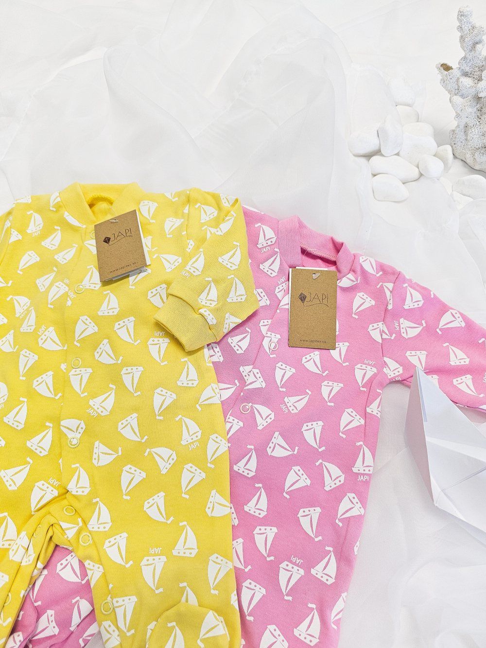 The baby overall with boats SAILBOAT is ideal for cooler days. Made from soft cotton, it provides warmth and comfort. Simple snap closures make for quick dressing. Available in blue, pink, and yellow. Ideal for everyday wear and sleep. A great addition to every child's wardrobe, combining quality and style.