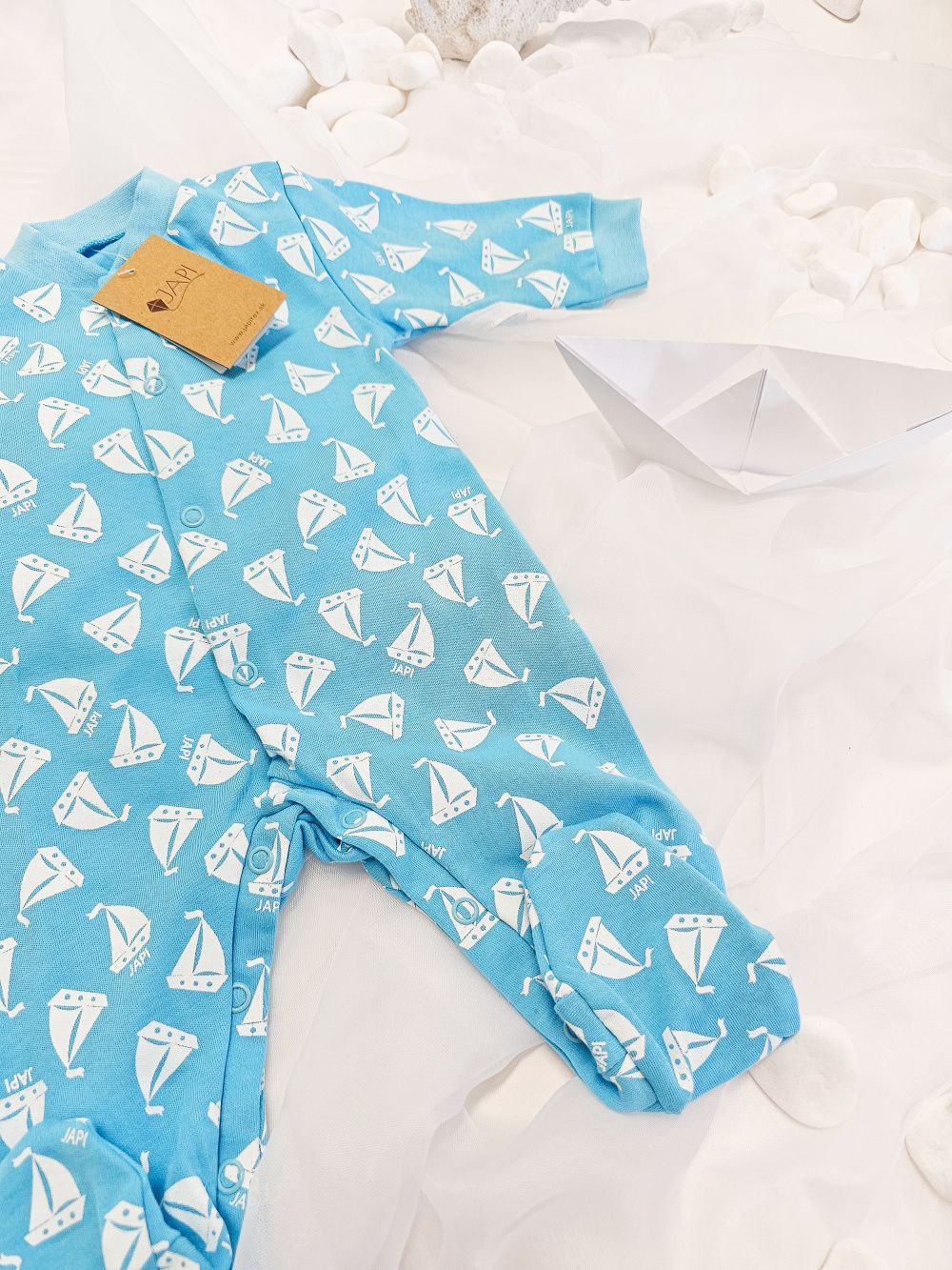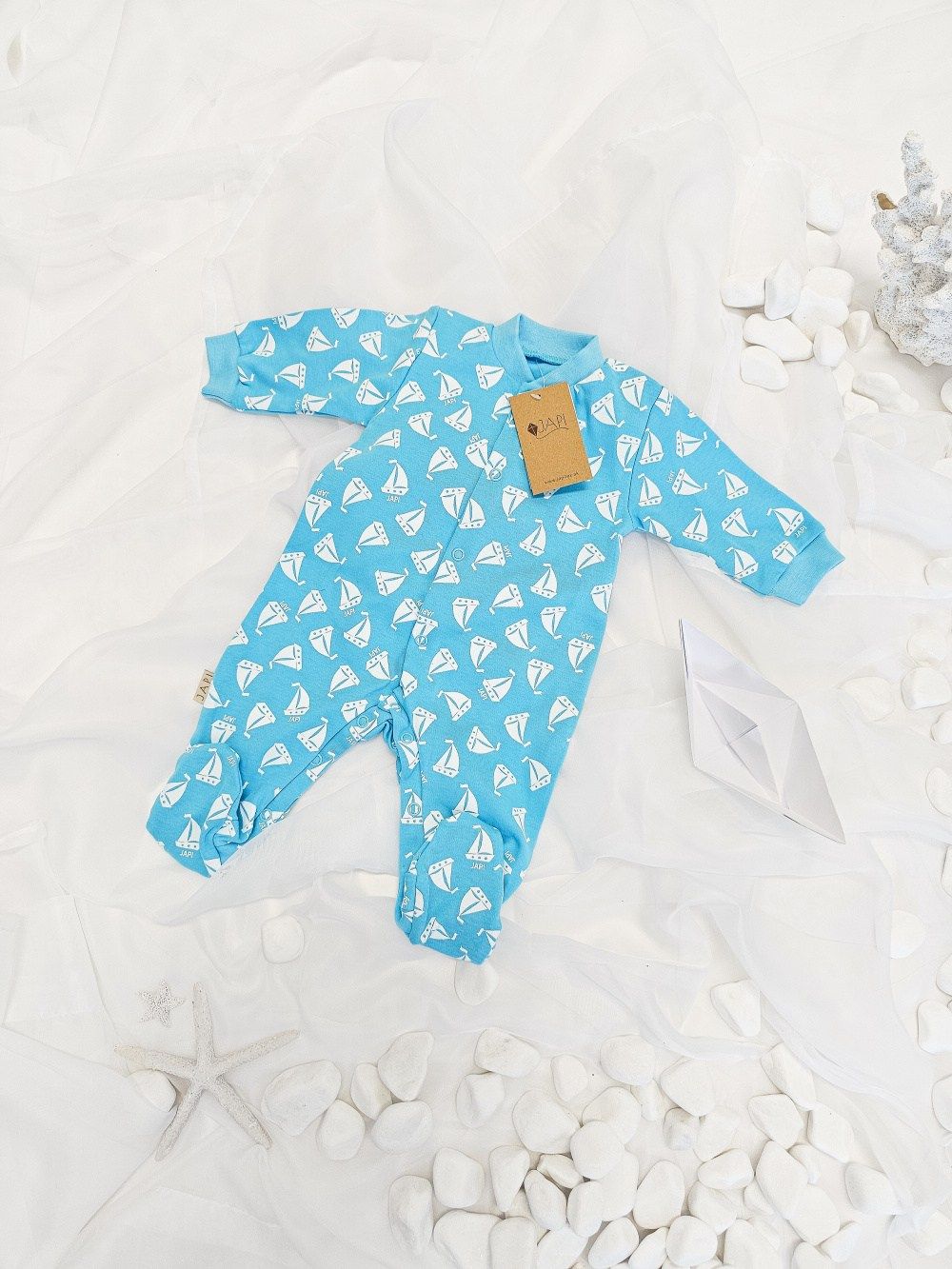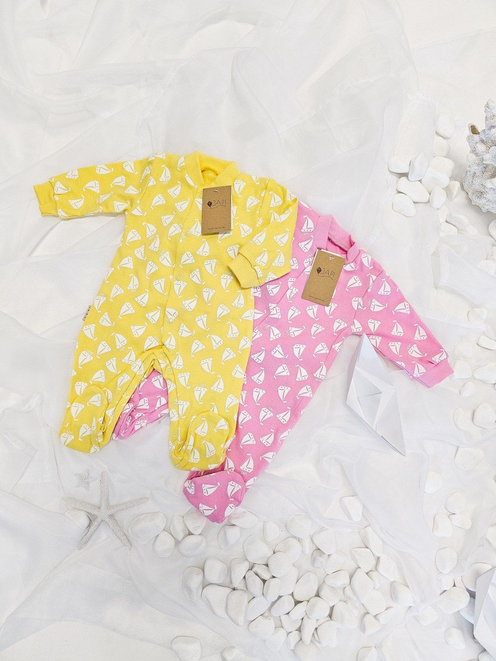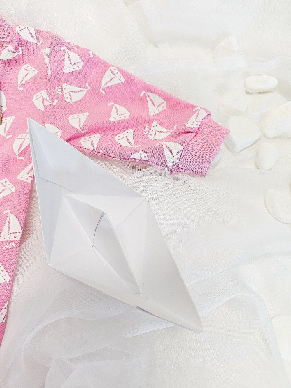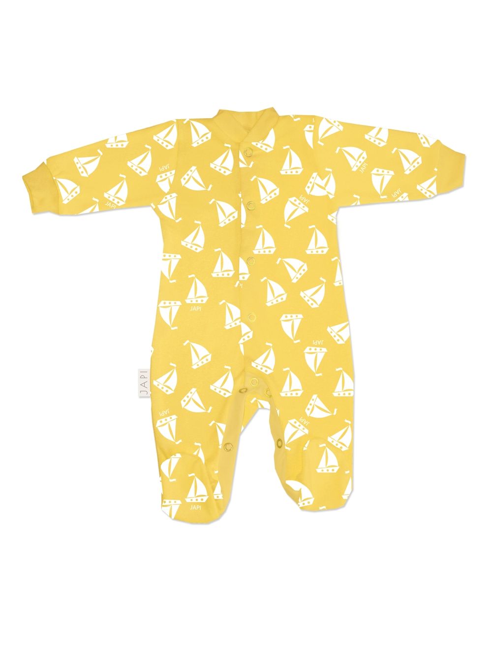 The baby overall with boats SAILBOAT is ideal for cooler days. Made from soft cotton, it provides warmth and comfort. Simple snap closures make for quick dressing. Available in blue, pink, and yellow. Ideal for everyday wear and sleep. A great addition to every child's wardrobe, combining quality and style.