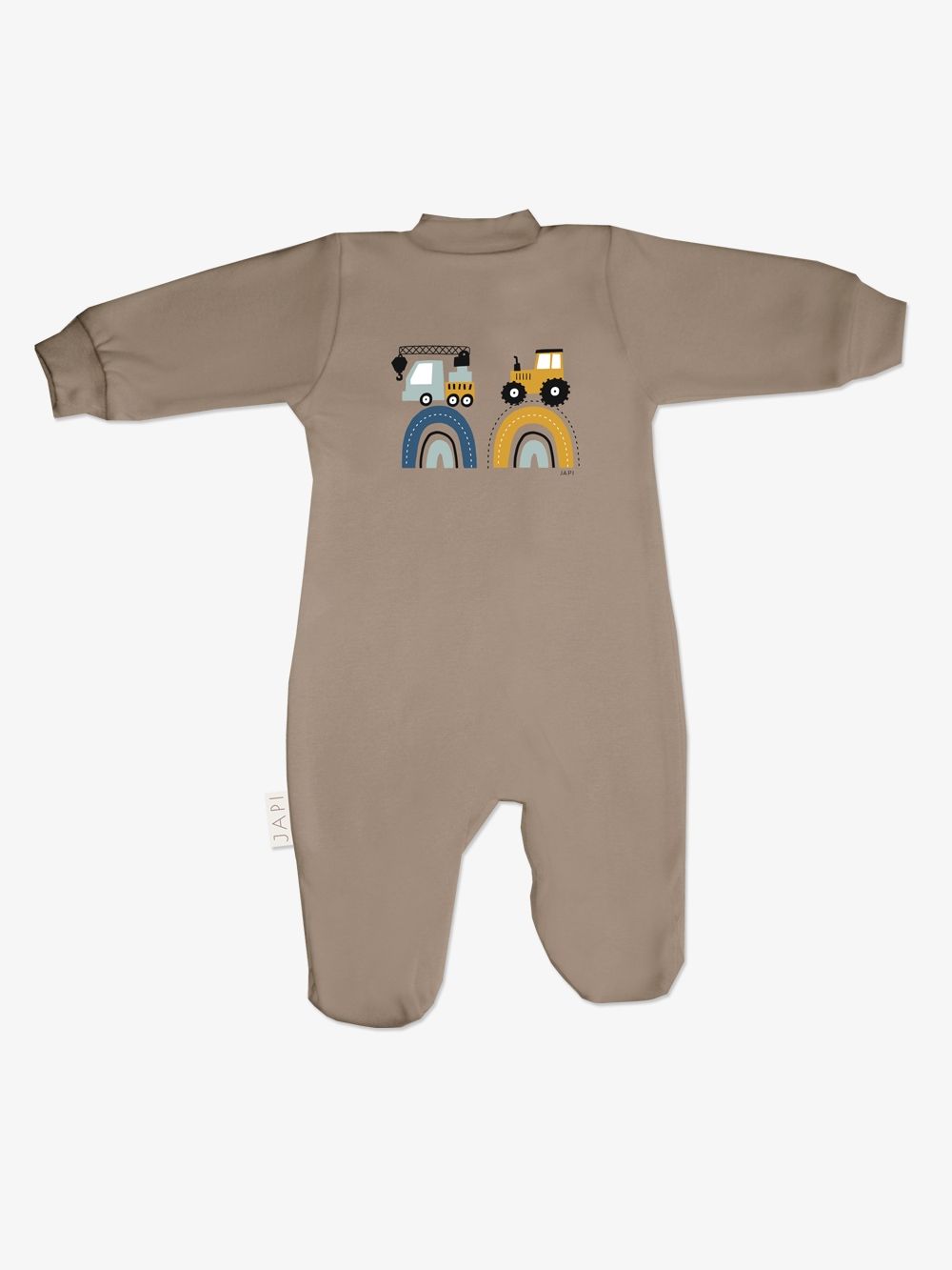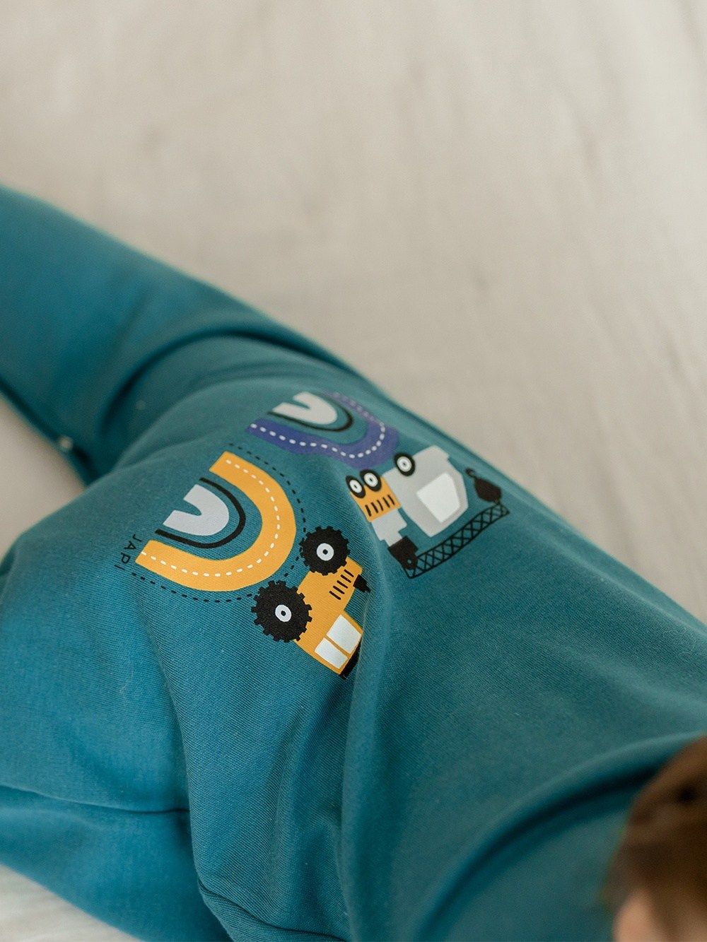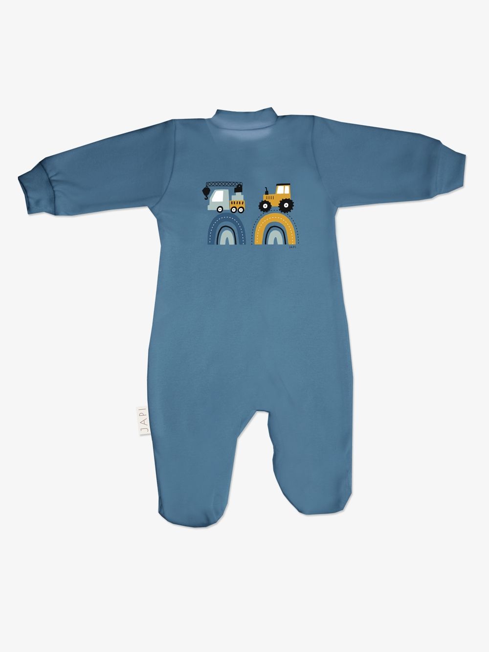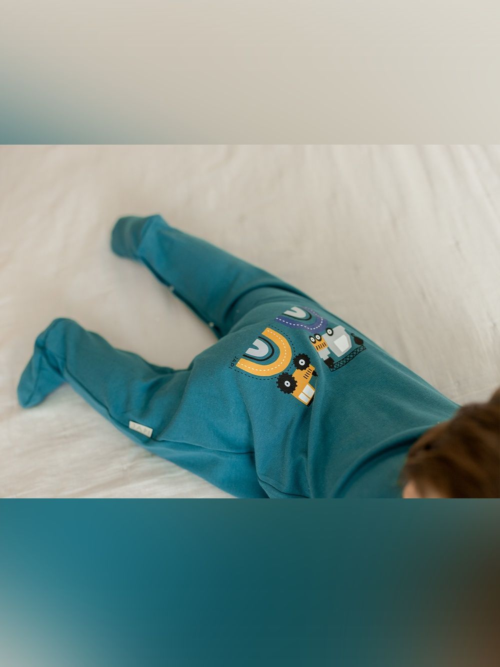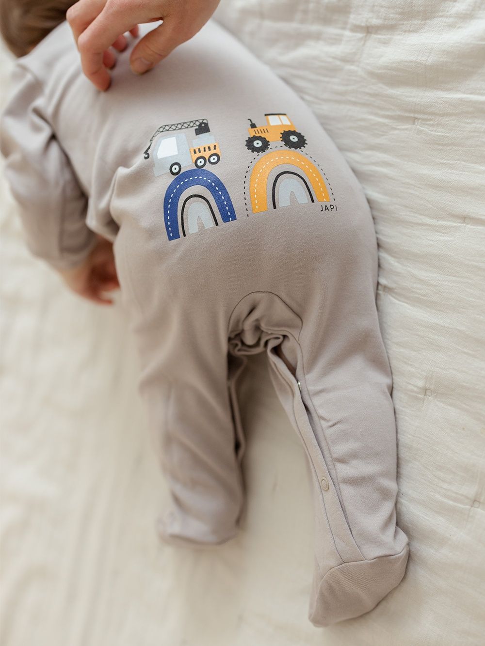A favorite overall that can be used for daytime play with the baby as well as for sleeping. The comfortable cut and practical fastenings all along the length and between the legs make it easy to dress and change. The overall has a quality hem that prevents it from stretching out. The print of work machines is suitable for little helpers and is placed on the back side.