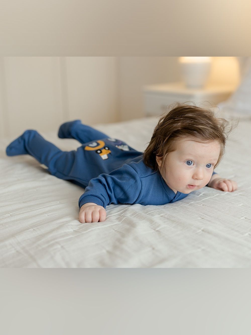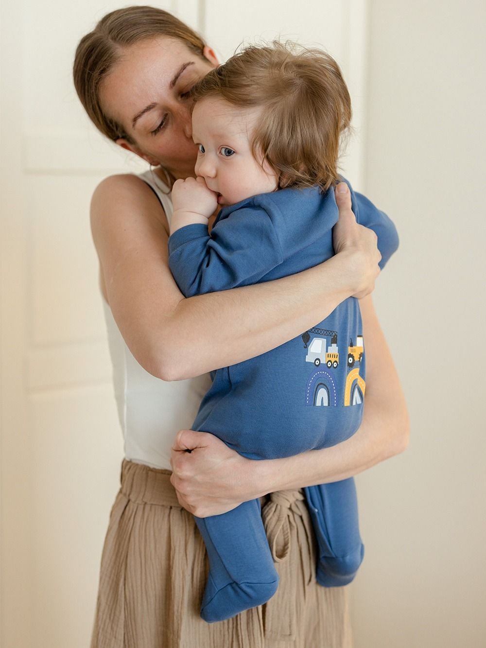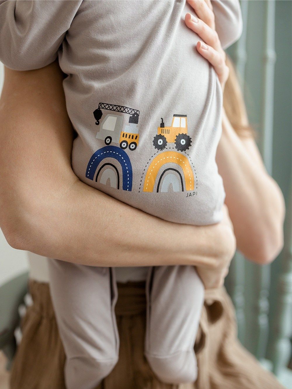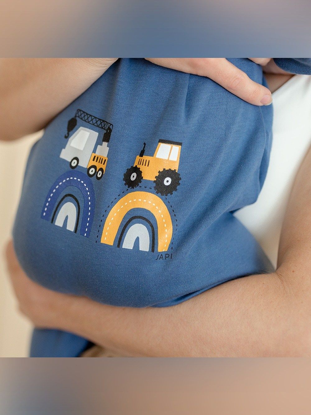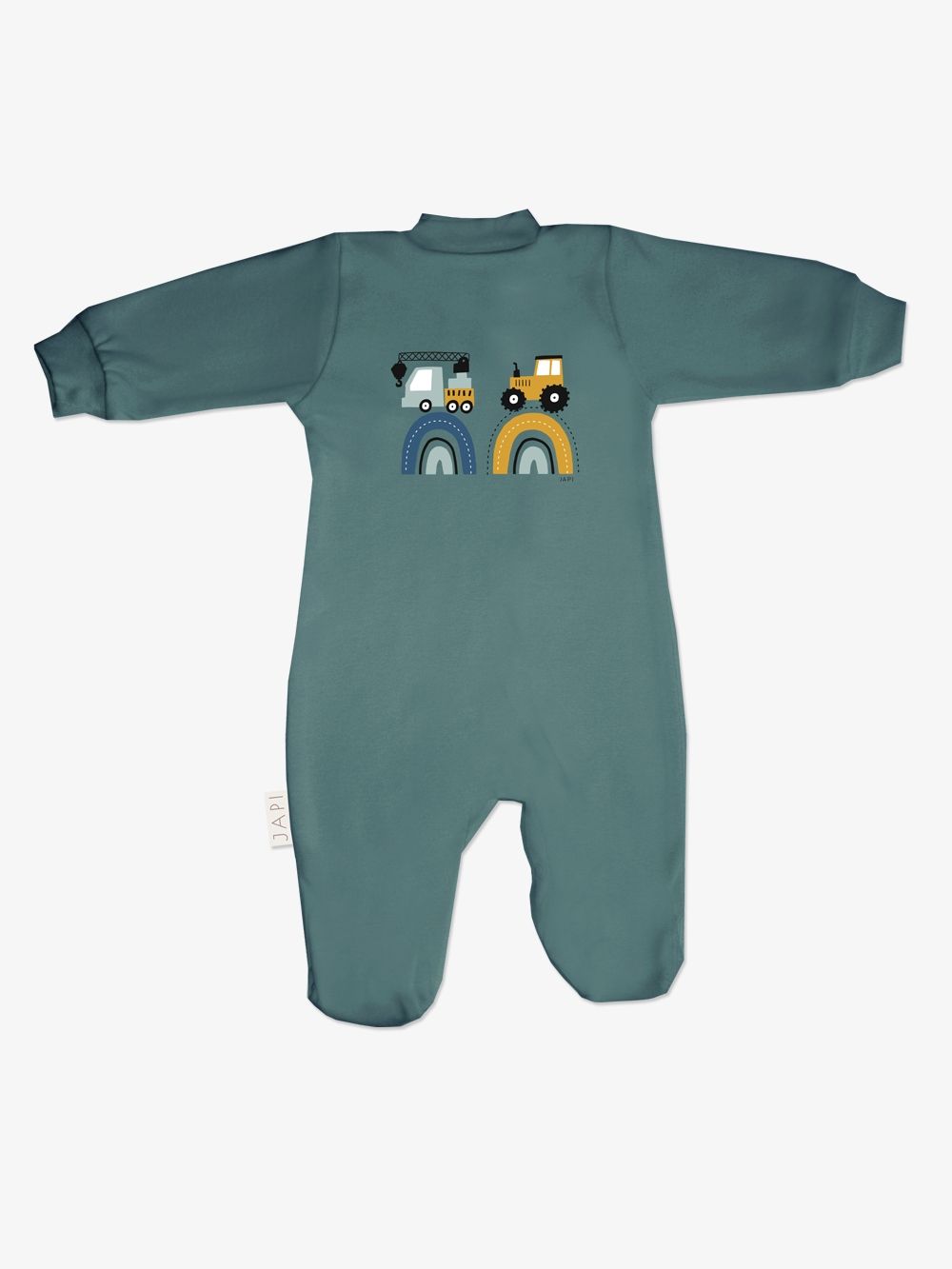 A favorite overall that can be used for daytime play with the baby as well as for sleeping. The comfortable cut and practical fastenings all along the length and between the legs make it easy to dress and change. The overall has a quality hem that prevents it from stretching out. The print of work machines is suitable for little helpers and is placed on the back side.