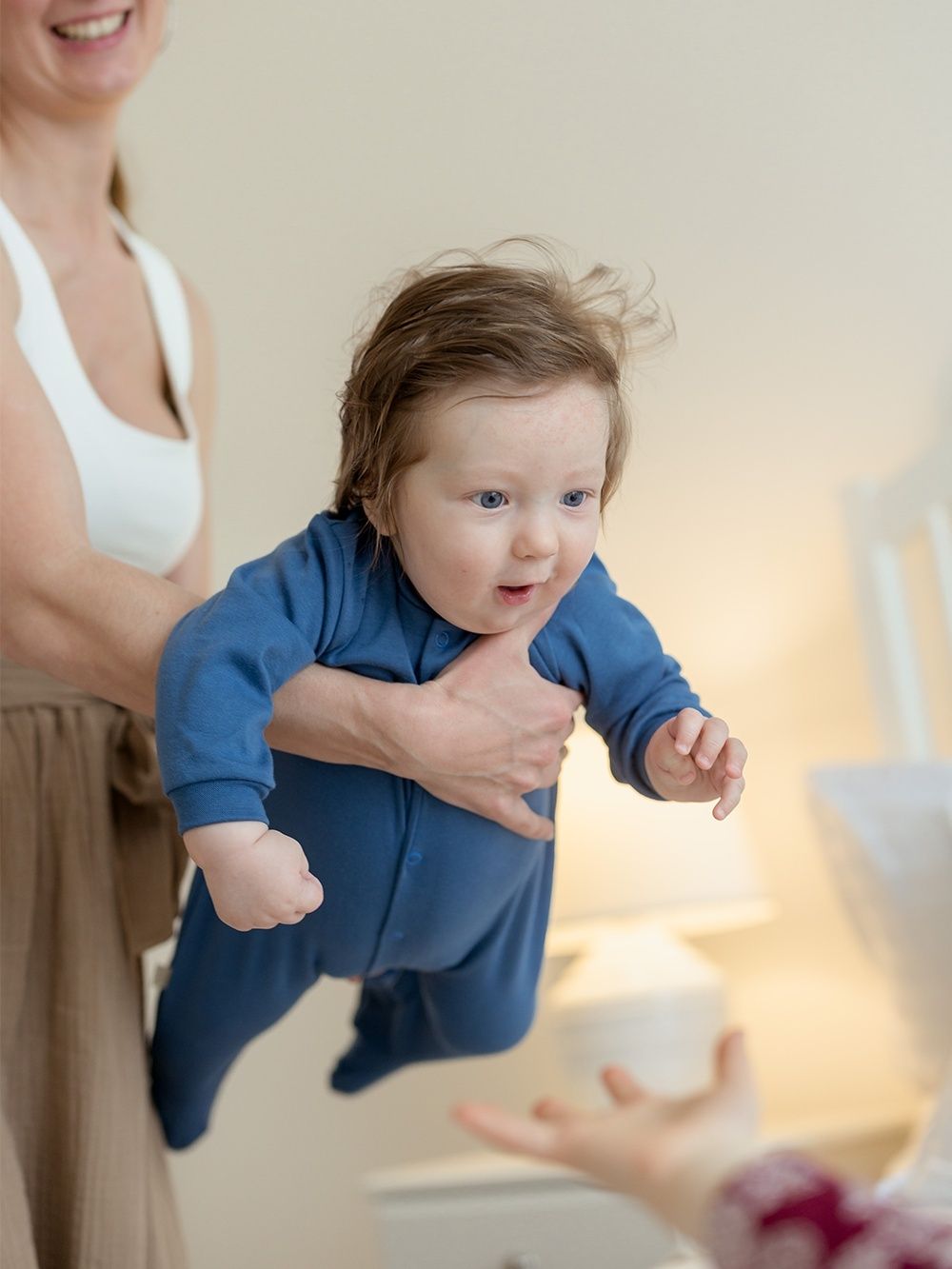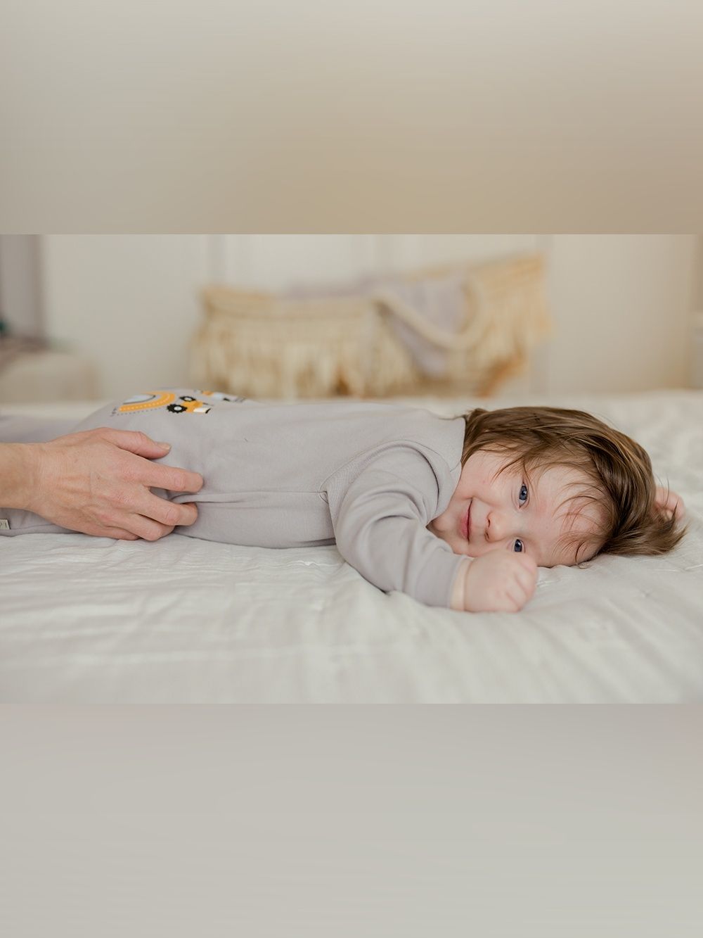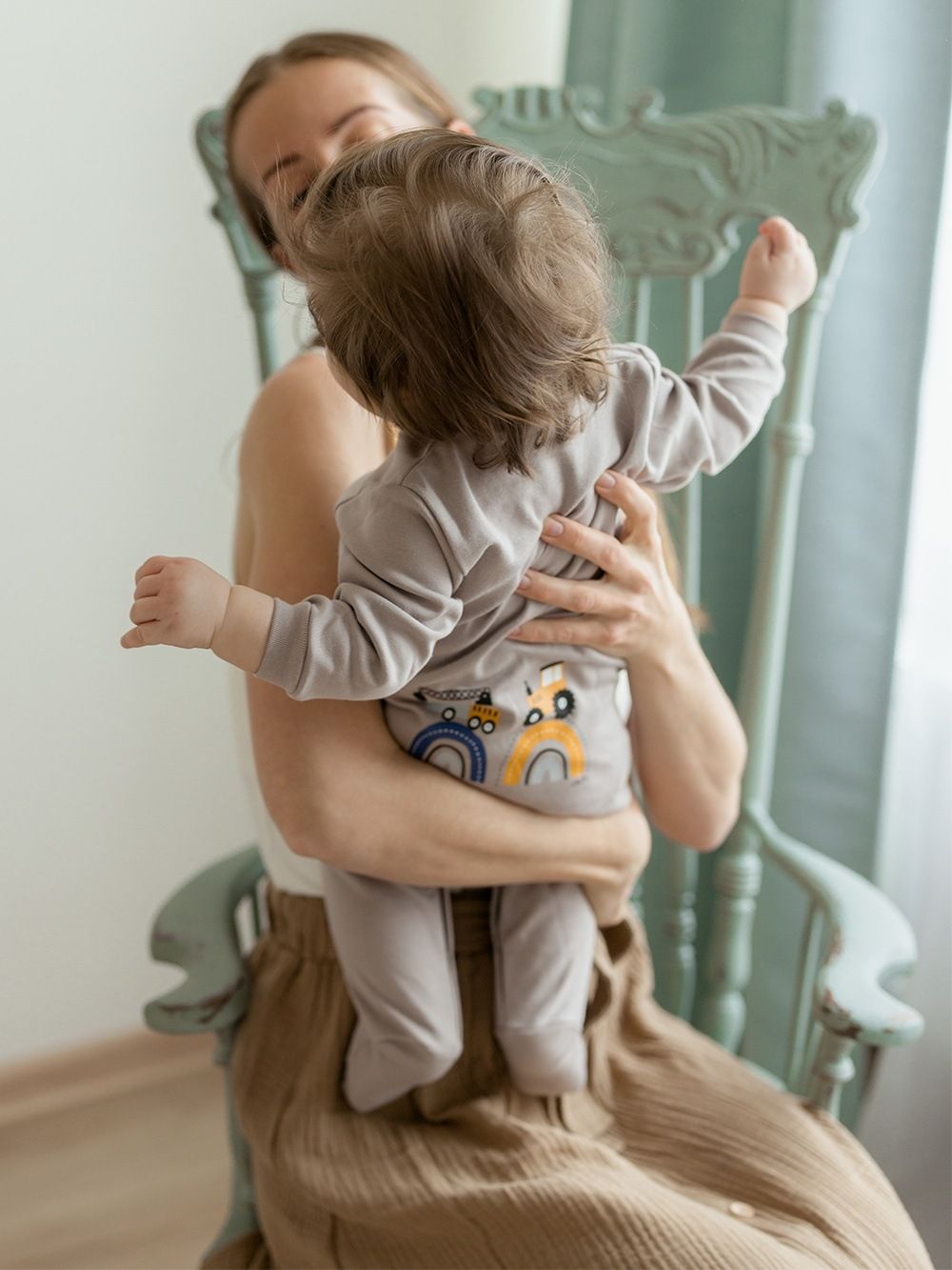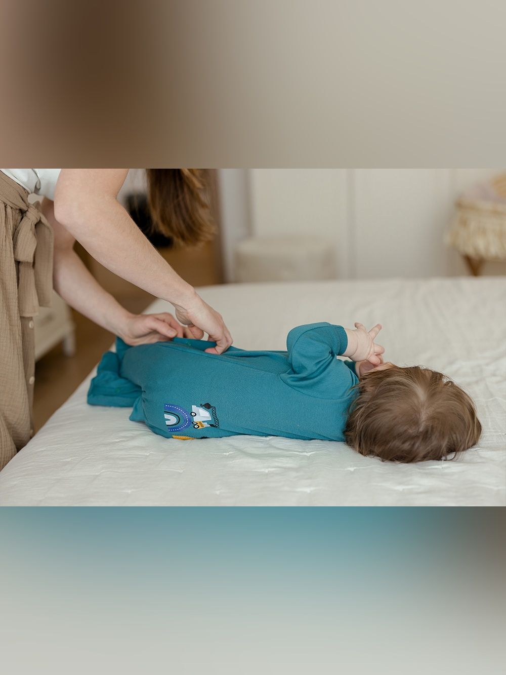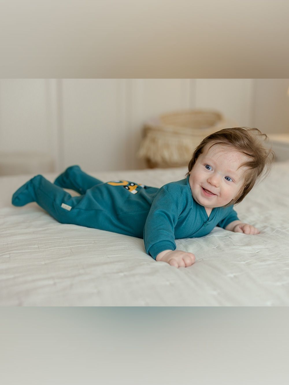A favorite overall that can be used for daytime play with the baby as well as for sleeping. The comfortable cut and practical fastenings all along the length and between the legs make it easy to dress and change. The overall has a quality hem that prevents it from stretching out. The print of work machines is suitable for little helpers and is placed on the back side.