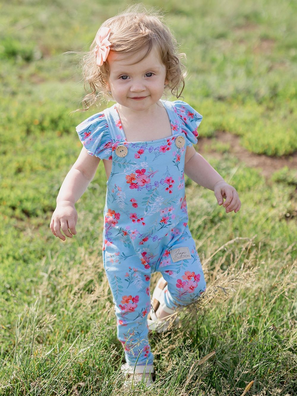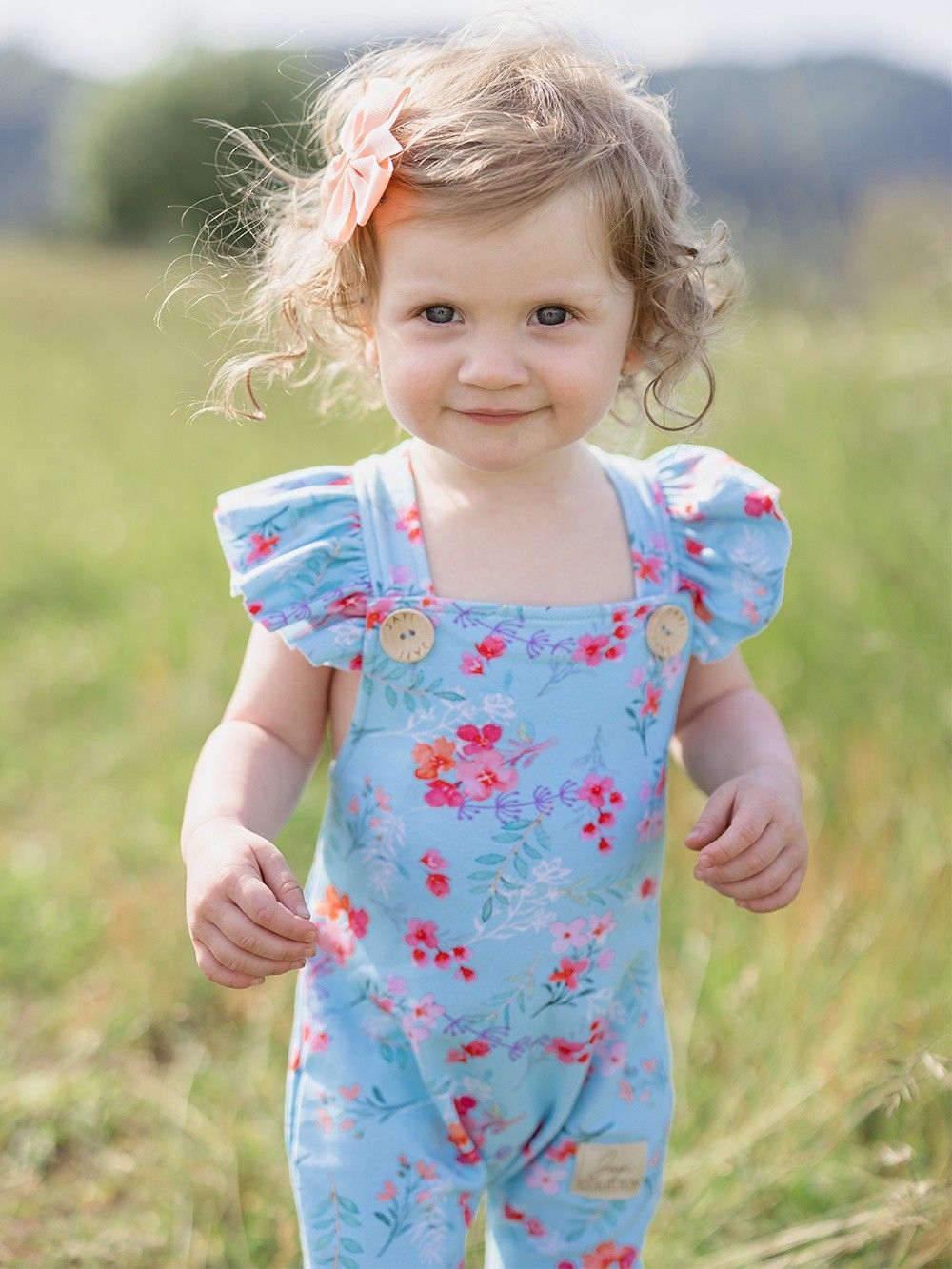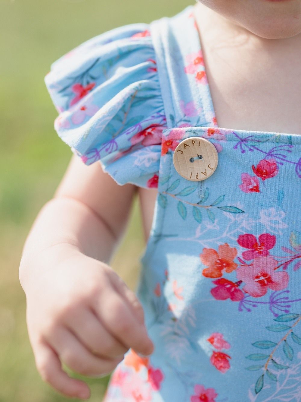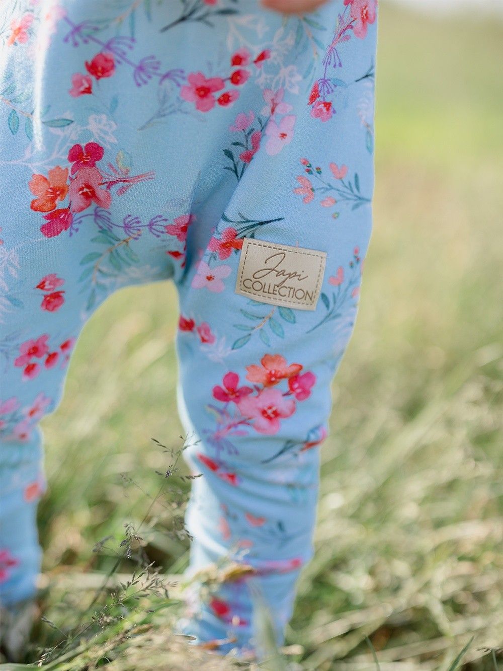 Comfortable sweatpants with braces that you can use for every day and for festive occasions. We made the sweatpants from pleasant cotton fabric with a certificate, so they are suitable for children from birth. The cut is also adapted to babies in diapers. Switching on is with braces, on the front thanks to the wooden buttons that give this piece a unique look. Delicate flowers are printed on a light blue background. The sweatpants have wider elastic bands on the bottom, so they are not too tight for children but they still keep in place.