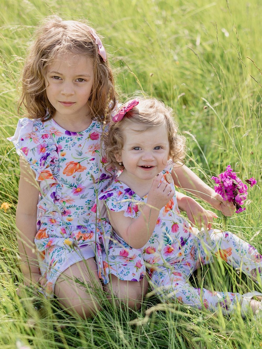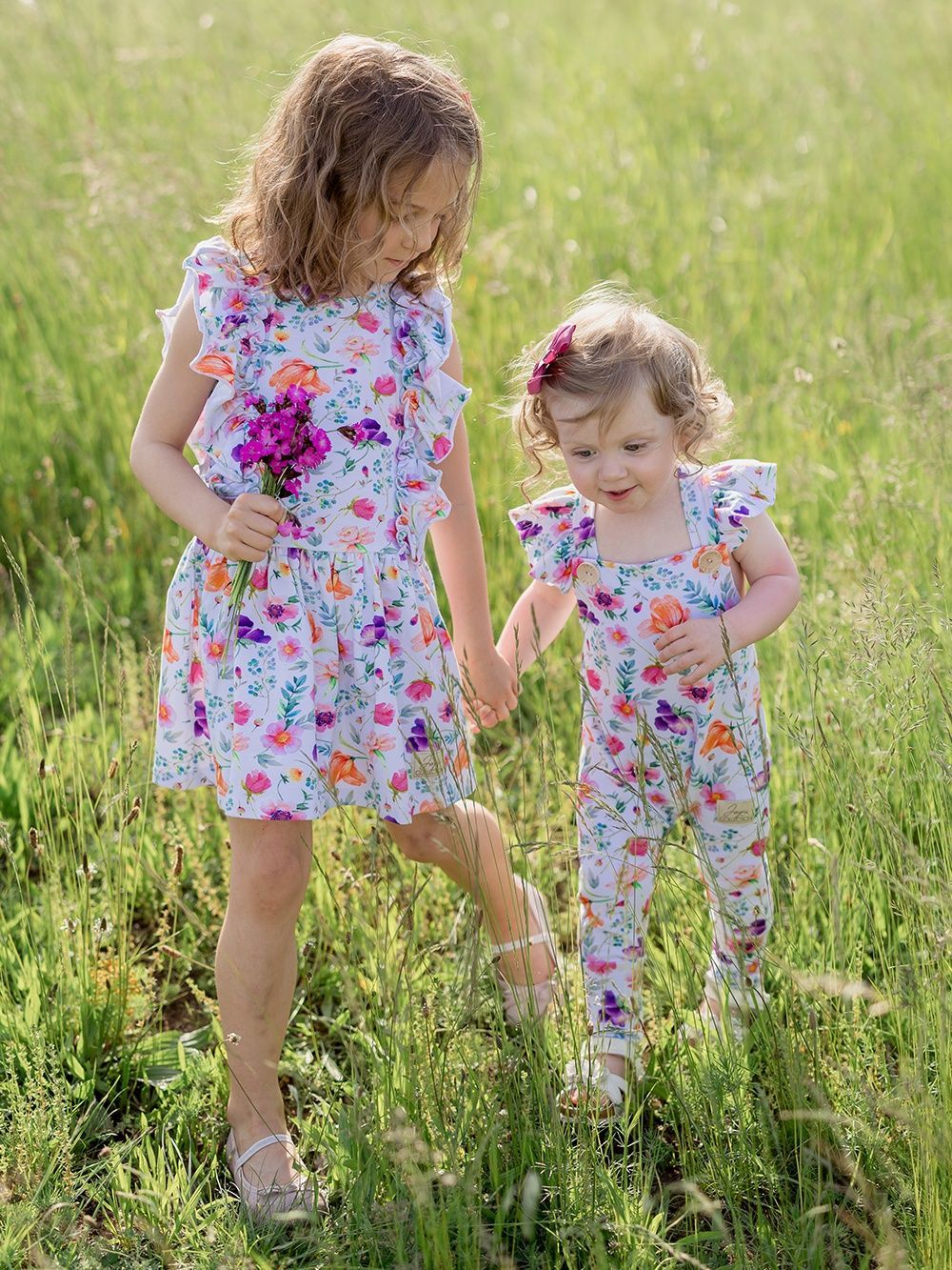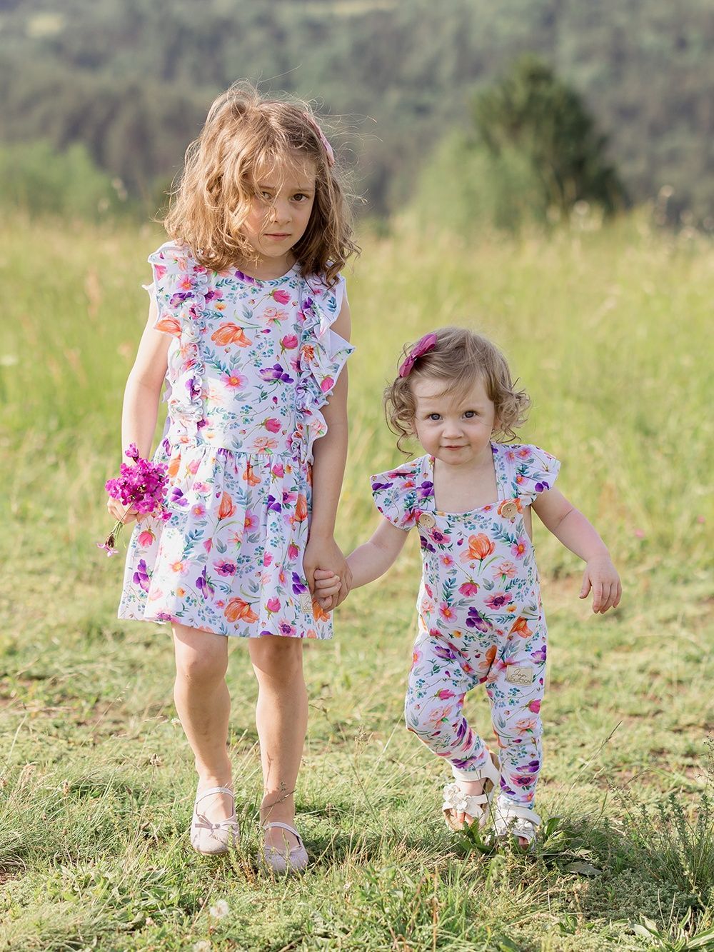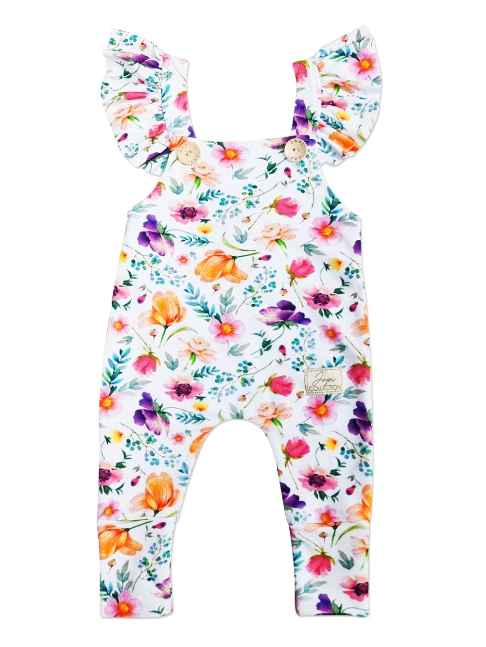 A popular piece of clothes in the children's wardrobe - sweatpants with braces . These are also very beautiful. A flower pattern is printed on the white cotton base fabric.