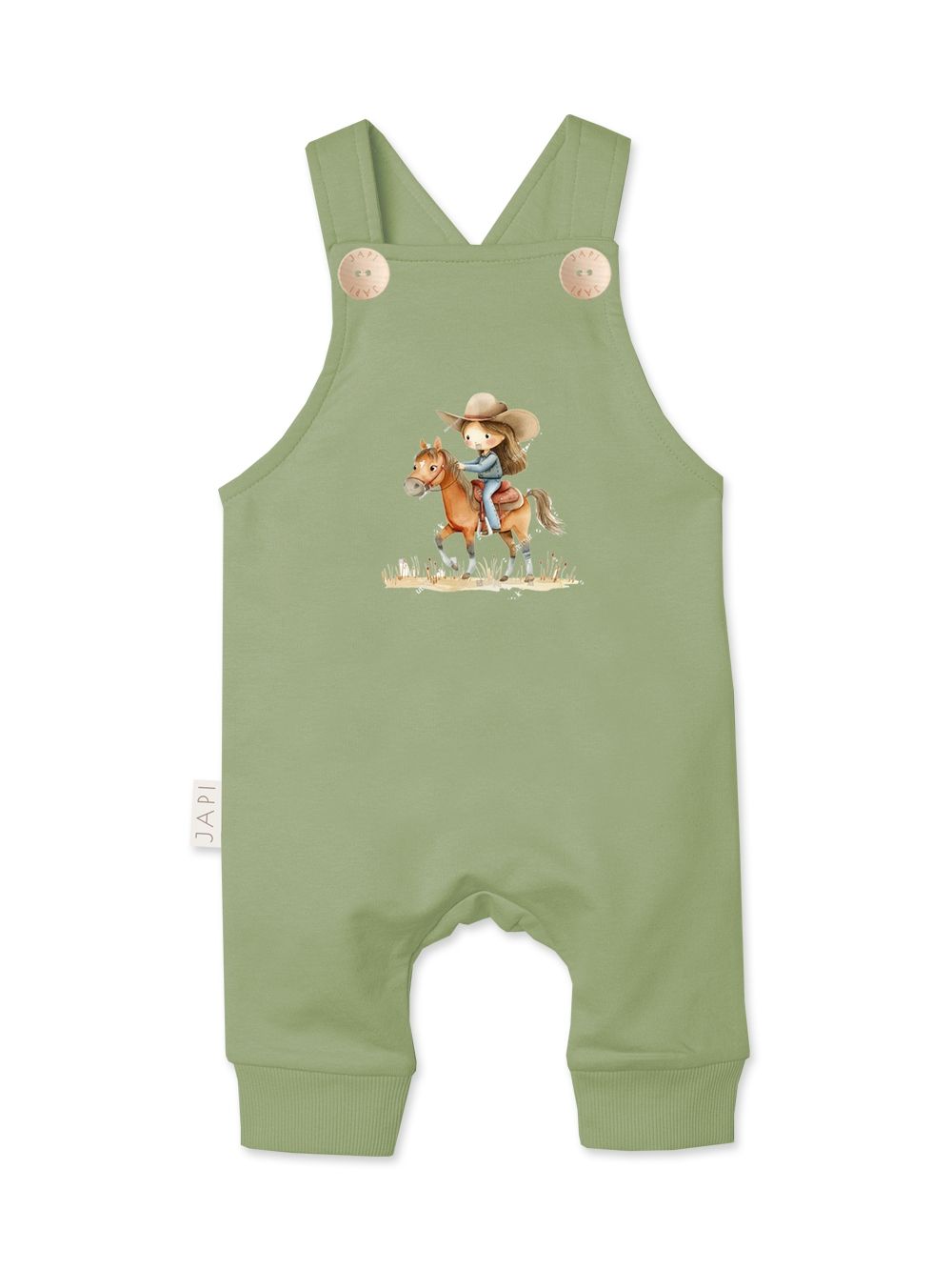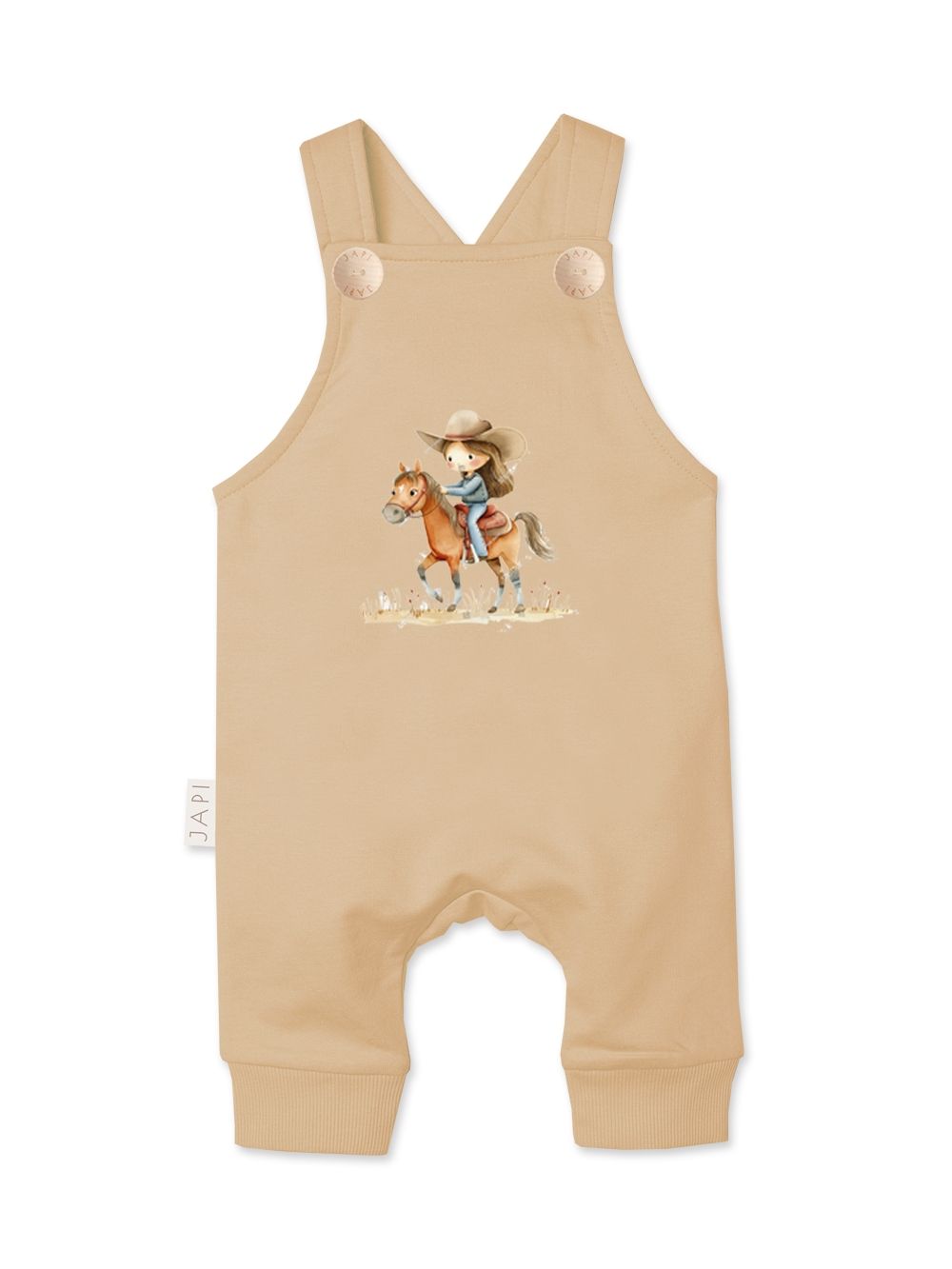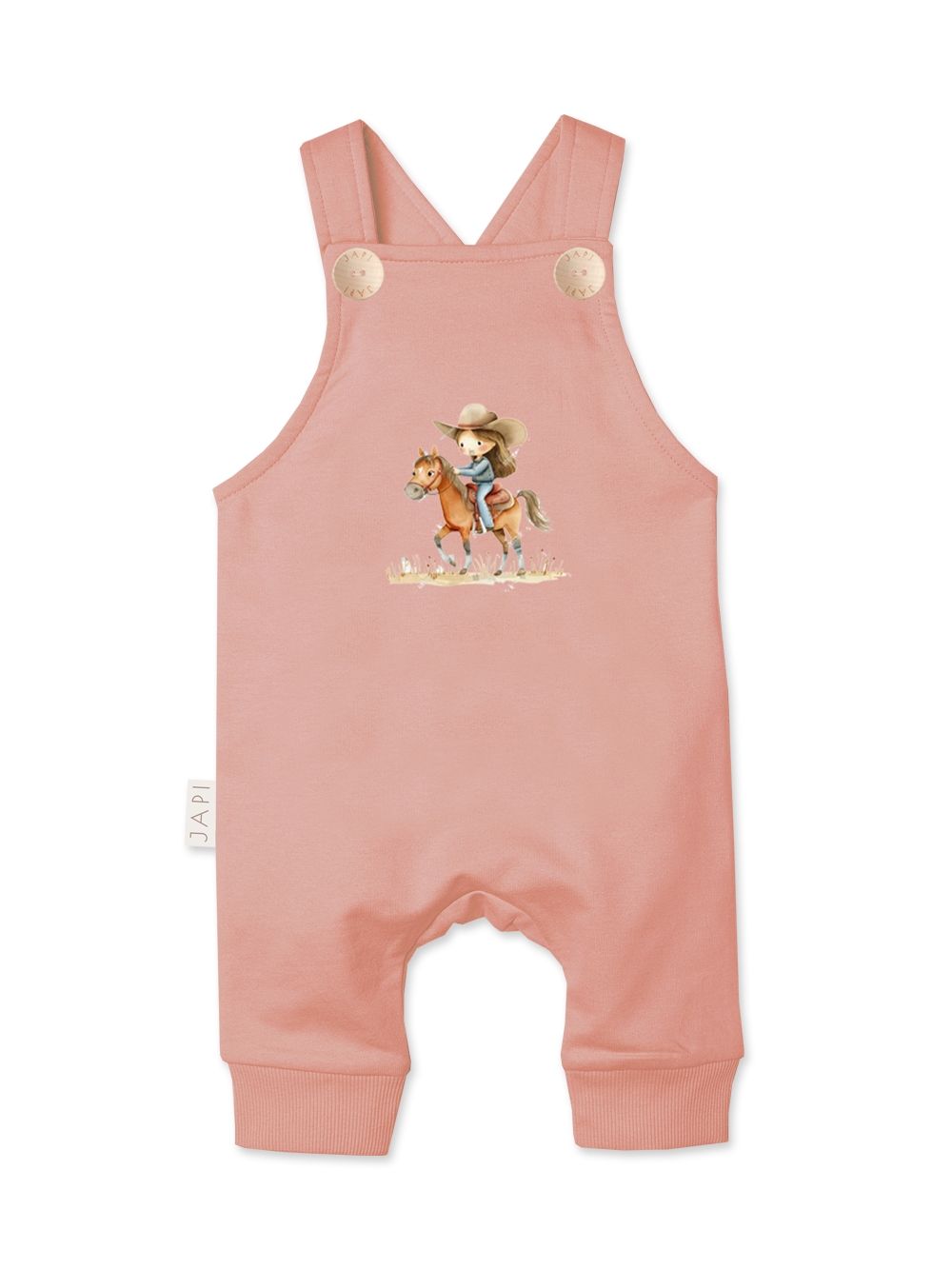 The WESTERN dungaree sweatpants for kids are a playful and practical piece that will stand out in every little adventurer’s wardrobe. The front features an original illustration of a girl on a horse, giving the pants a unique western charm. The straps with buttons make dressing and undressing easier while keeping the garment secure and comfortable all day long. The relaxed fit provides maximum freedom of movement, while the elastic cuffs at the ankles ensure the pants stay in place and protect against the cold. Made from a soft and gentle material, they are kind to sensitive children’s skin. Available in three modern shades – light brown, powder pink, and fresh green – making them easy to mix and match with bodysuits, T-shirts, or hoodies. An ideal choice for everyday wear, playtime, and family moments in comfort.