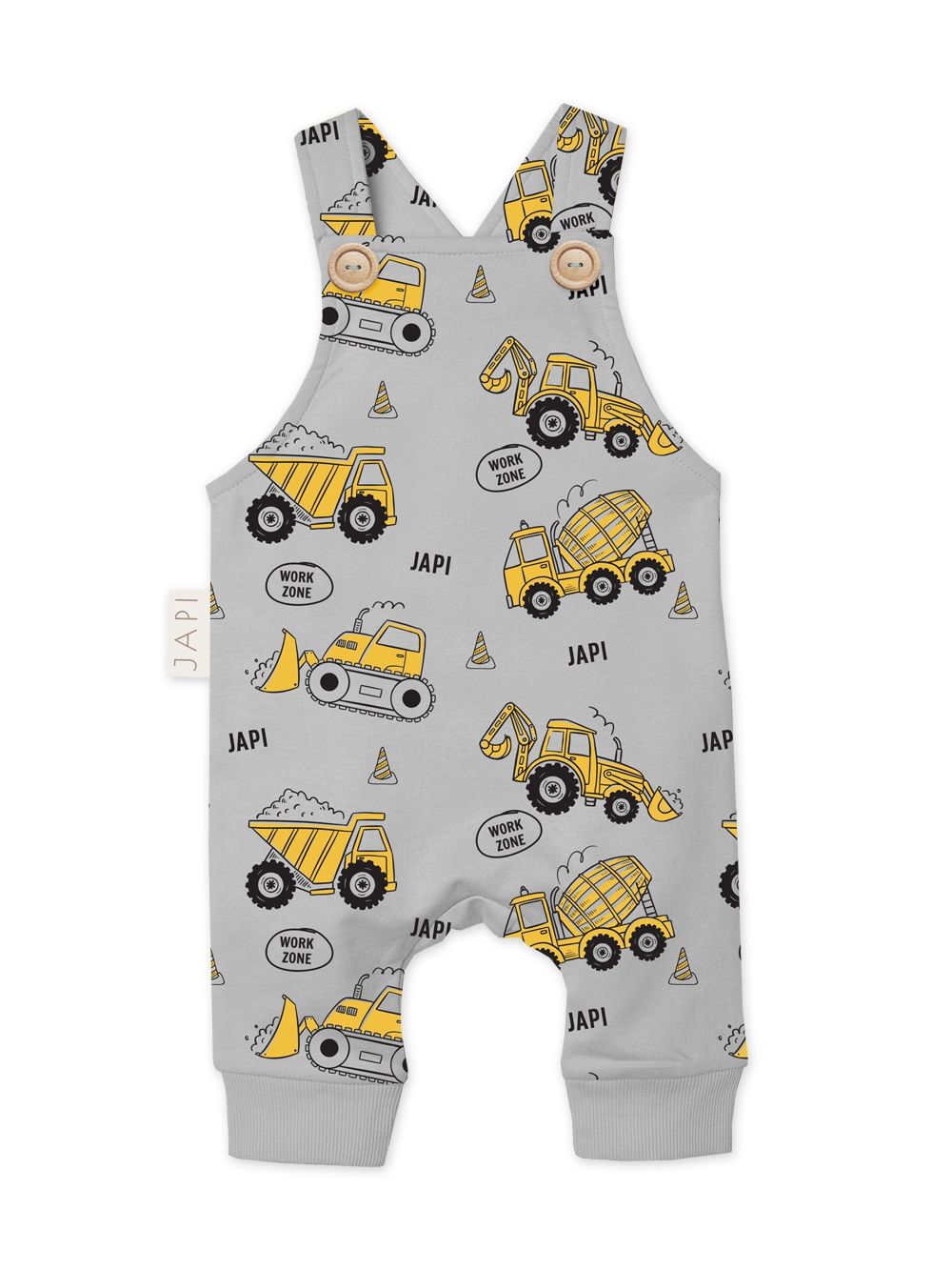 We've added a popular print with work vehicles to your favorite pants with braces for kids. The pants have a comfortable looser cut that allows kids to move around easily and doesn't hinder them in play. They fasten with wooden buttons on the front side through the pants. The wider cuffs on the legs keep them in place.