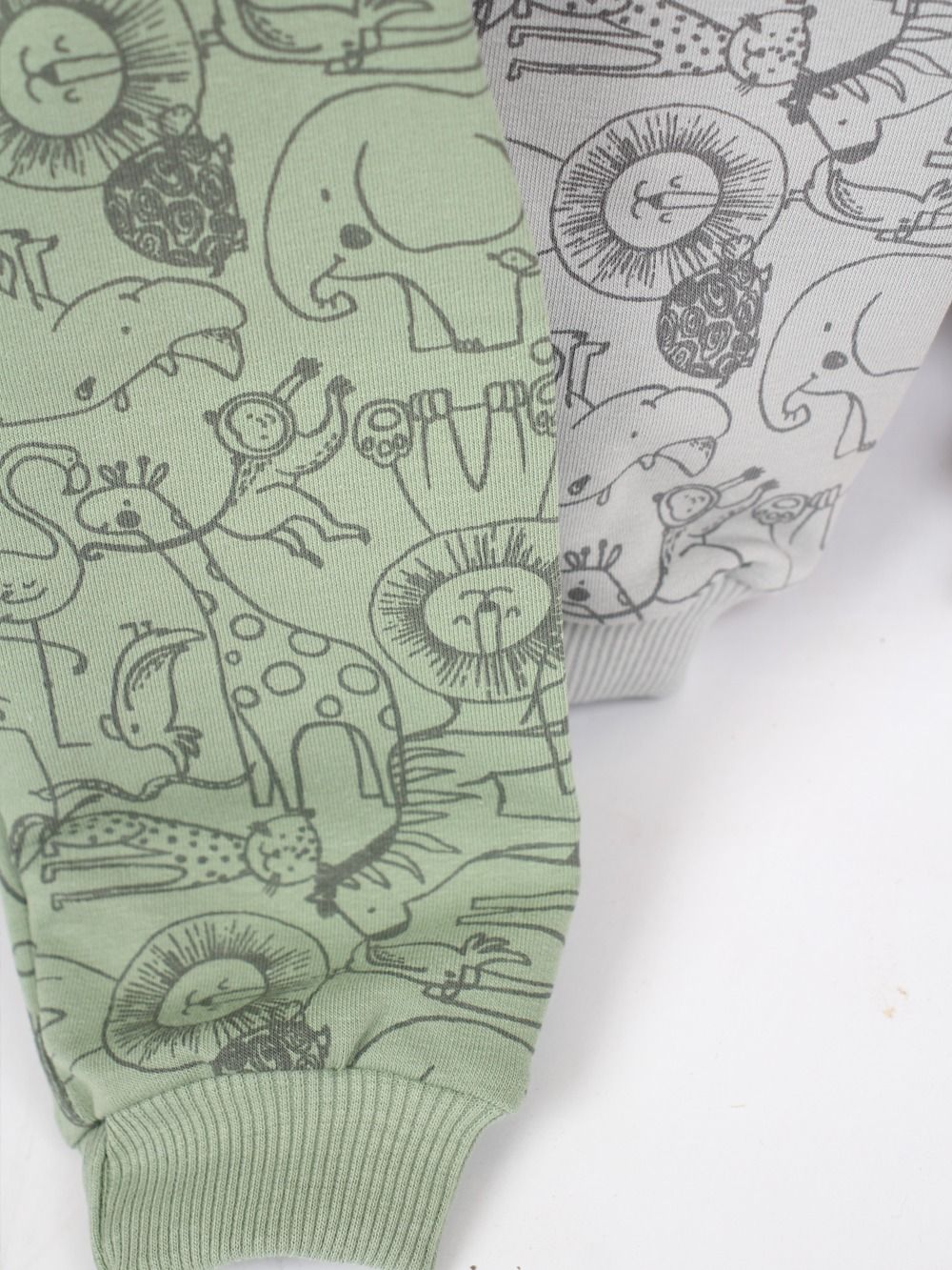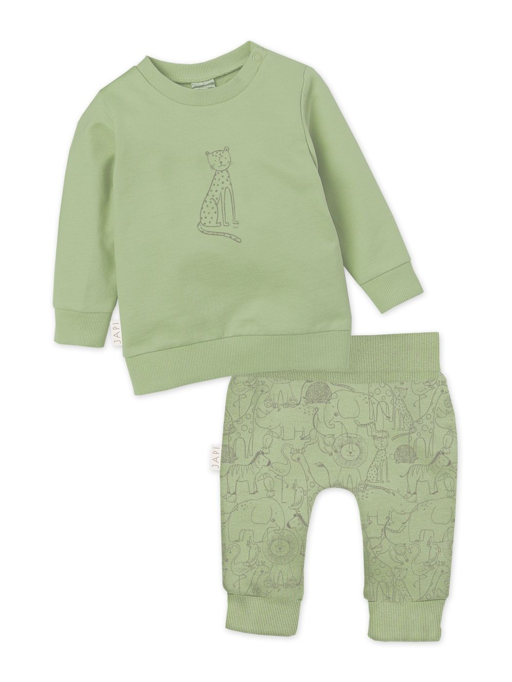 This practical tracksuit combines comfort and style for active kids. The set includes a sweatshirt featuring a leopard print and soft trousers with a safari animal pattern. Made from soft cotton, it’s perfect for cooler days or relaxing at home. Elastic cuffs and waistband ensure a snug fit without restricting movement. Three color variations – beige, gray, and green – offer flexibility for every little adventurer.
