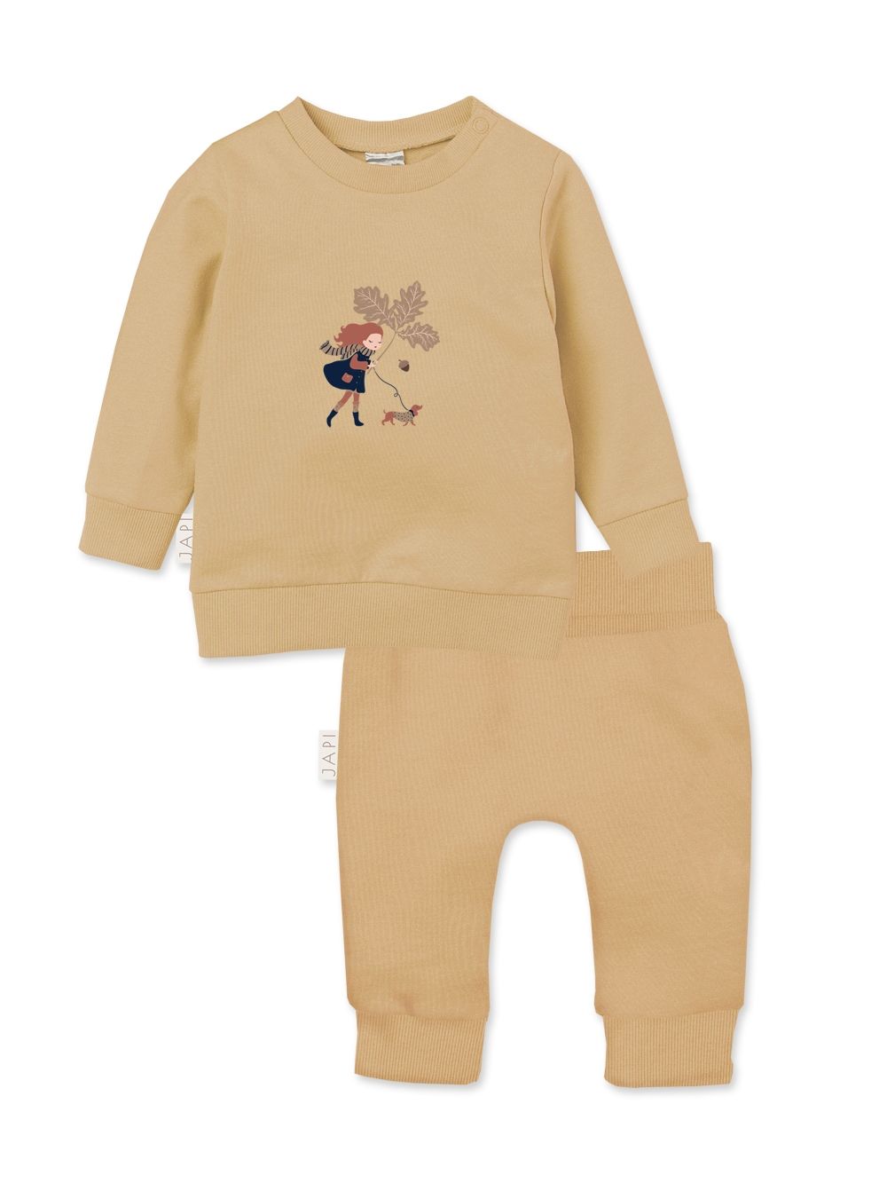 This adorable kids' set, consisting of a sweatshirt and pants, is perfect for colder days. The front of the sweatshirt features a playful illustration of a girl walking her dog under falling autumn leaves, creating a cozy seasonal vibe. Made from soft and comfortable fabric, the set ensures maximum comfort during play and rest. Elastic cuffs on the sleeves, pants, and neckline provide a snug fit and make dressing easy. Available in three beautiful autumn-inspired colors – brown, dusty pink, and light green. A practical and stylish outfit for everyday wear, walks, and visits.