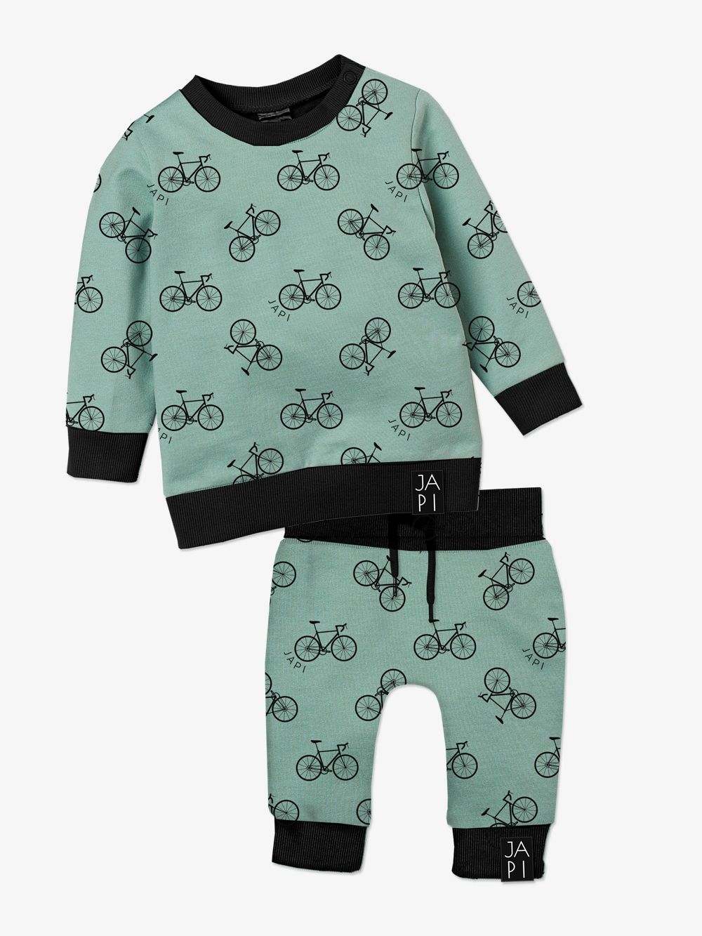 We completed the cotton pleasant material with an all-over bicycle print. The modern cut and pleasant color are suitable for daily wear. You can use it for walks or in nursery school. The combination of green and black in the form of ribbed cuffs and accessories looks very modern.