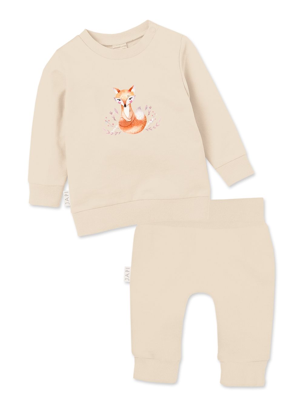This soft baby set with a fox motif includes a sweatshirt and comfy pants, perfect for everyday wear. Made from gentle and breathable cotton, it ensures maximum comfort throughout the day. The sweatshirt features a convenient shoulder snap for easy dressing and undressing. The pants have an elastic waistband and cuffed hems for a snug fit that doesn't restrict movement. A cute print of a sitting fox adds a playful and natural touch that kids will love. Available in beige and pink for easy outfit pairing. This set is a practical and stylish choice for home, stroller rides, and walks.