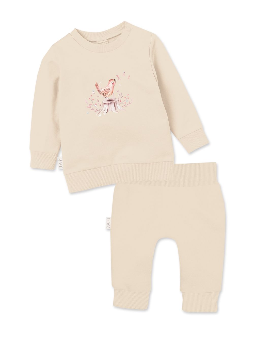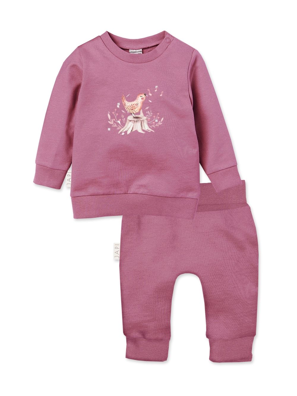 The MUSIC baby set with a singing bird motif is a practical and stylish choice for everyday wear. The set includes a comfortable long-sleeved pullover and soft pants with an elastic waistband and ribbed cuffs, ensuring freedom of movement and all-day comfort. The pullover is decorated with a delicate print of a cheerful bird on a tree stump, adding a playful and adorable touch. Made from soft, skin-friendly fabric, the set is perfect for both home wear and outdoor walks. Available in two lovely colors – soft beige and raspberry pink.
