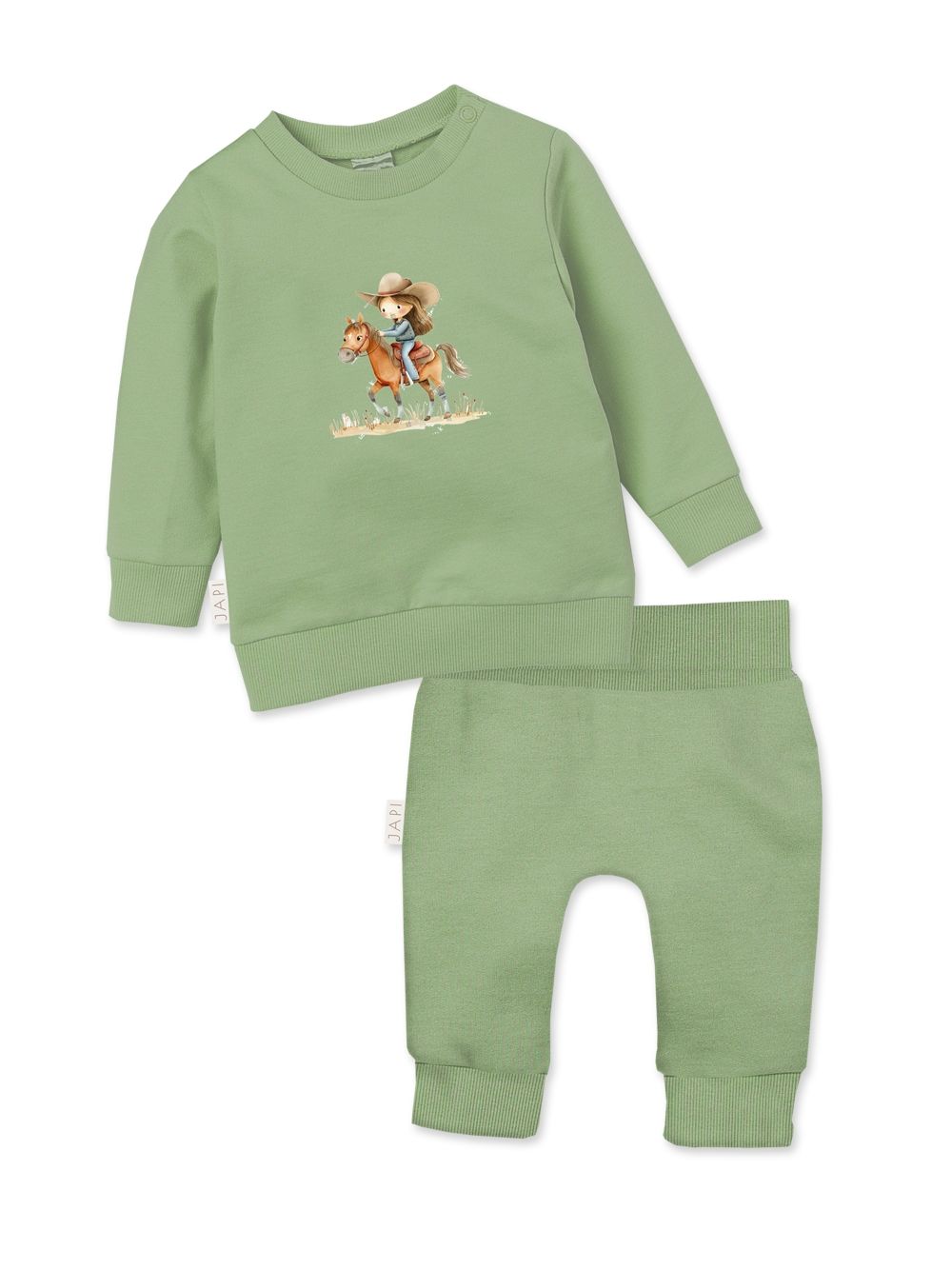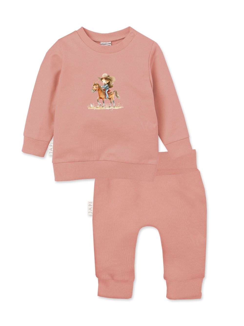 The WESTERN kids’ set is a comfortable and adorable outfit that will delight both children and parents. The set includes a long-sleeved pullover and joggers with a dropped crotch, ensuring freedom of movement and maximum comfort throughout the day. The pullover features a charming illustration of a little cowgirl on a horse, adding a playful western touch. It is finished with ribbed cuffs and hem to keep its shape and has practical shoulder snaps for easier dressing. The joggers have an elastic waistband and ribbed cuffs for a perfect fit. Made from soft and breathable cotton, gentle on children’s skin. Available in three stylish shades – light brown, powder pink, and fresh green – easy to mix and match with other pieces. A perfect choice for everyday wear, kindergarten, playground, or leisure time.