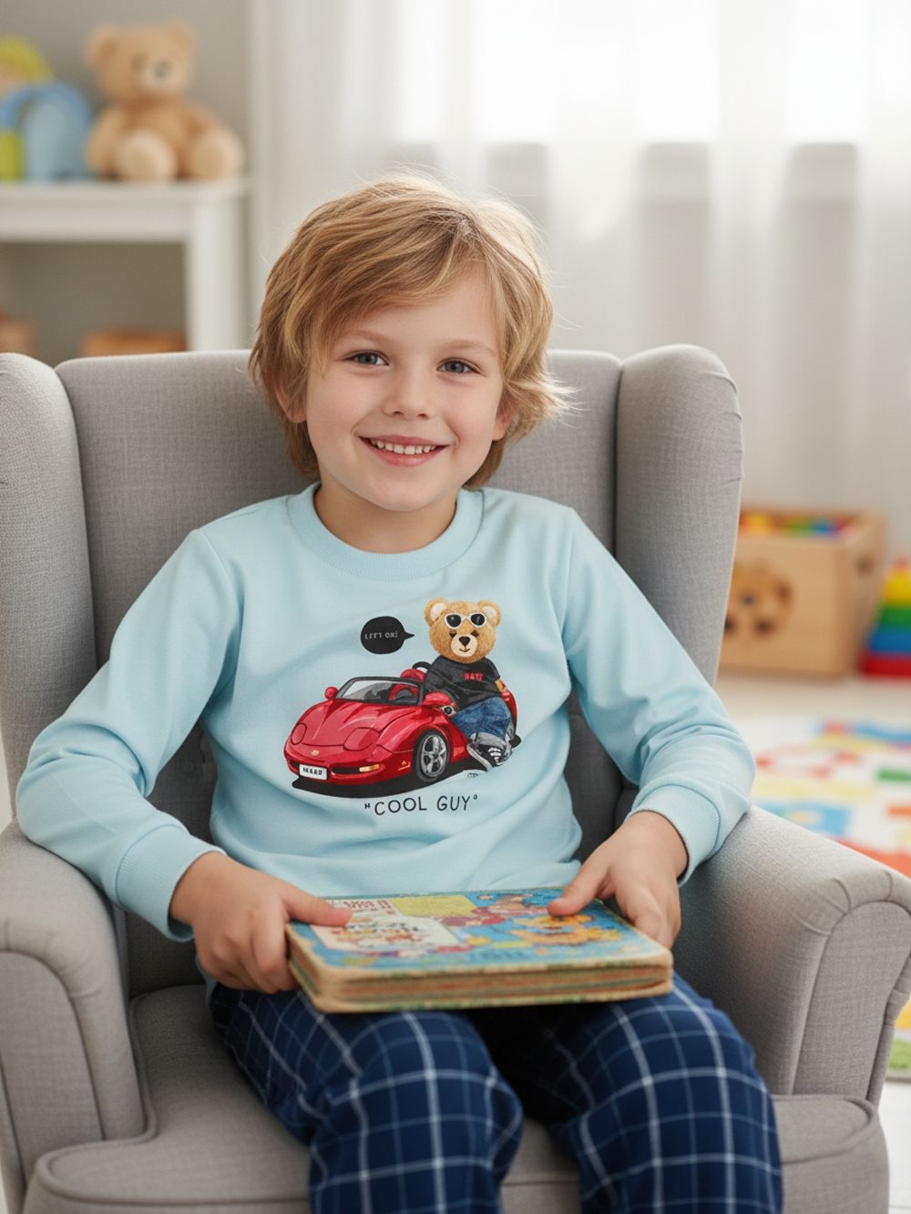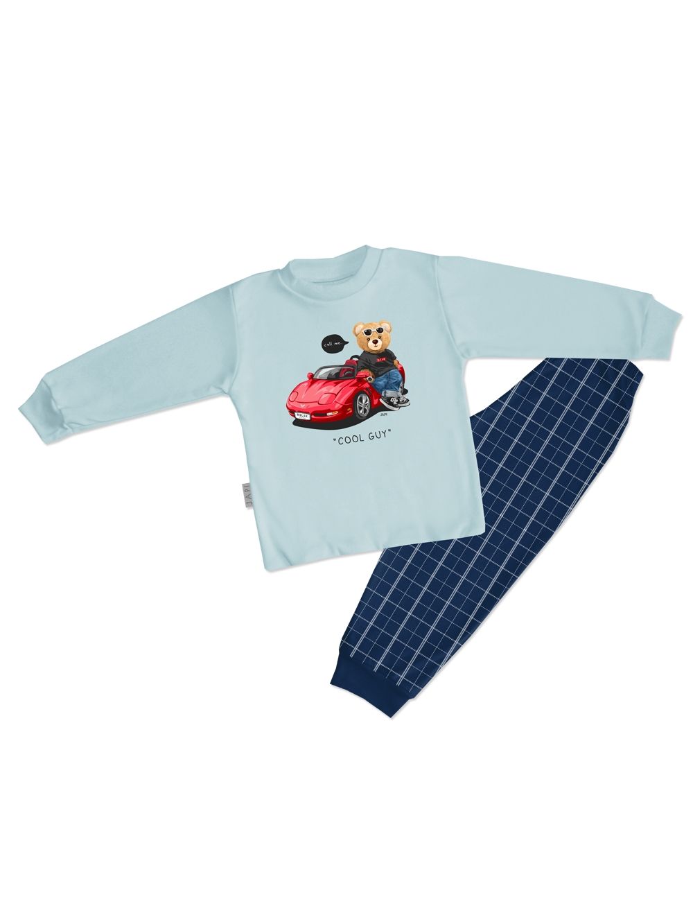 Stylish boys' pyjamas with a red car COOL GUY are perfect for little car lovers. The top features a cheerful illustration of a bear sitting on a sports car with a caption. Made from soft cotton, they offer comfort all night long and are gentle on children's skin. The dark blue trousers with a white checkered print and an elastic waistband ensure freedom of movement and comfortable wear. Boys’ pyjamas have long sleeves and pants, ideal for cooler nights.