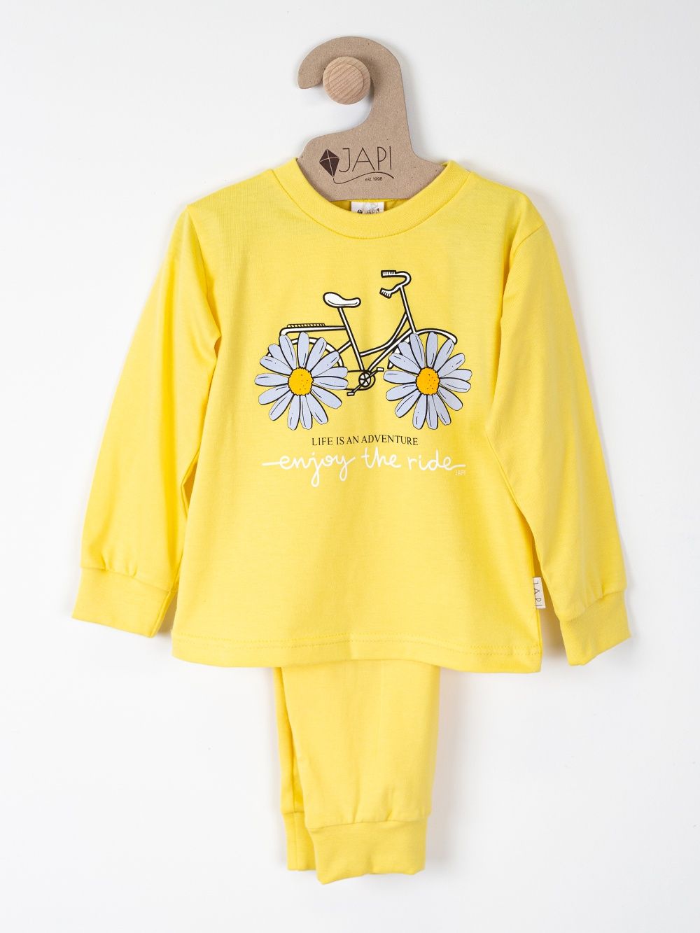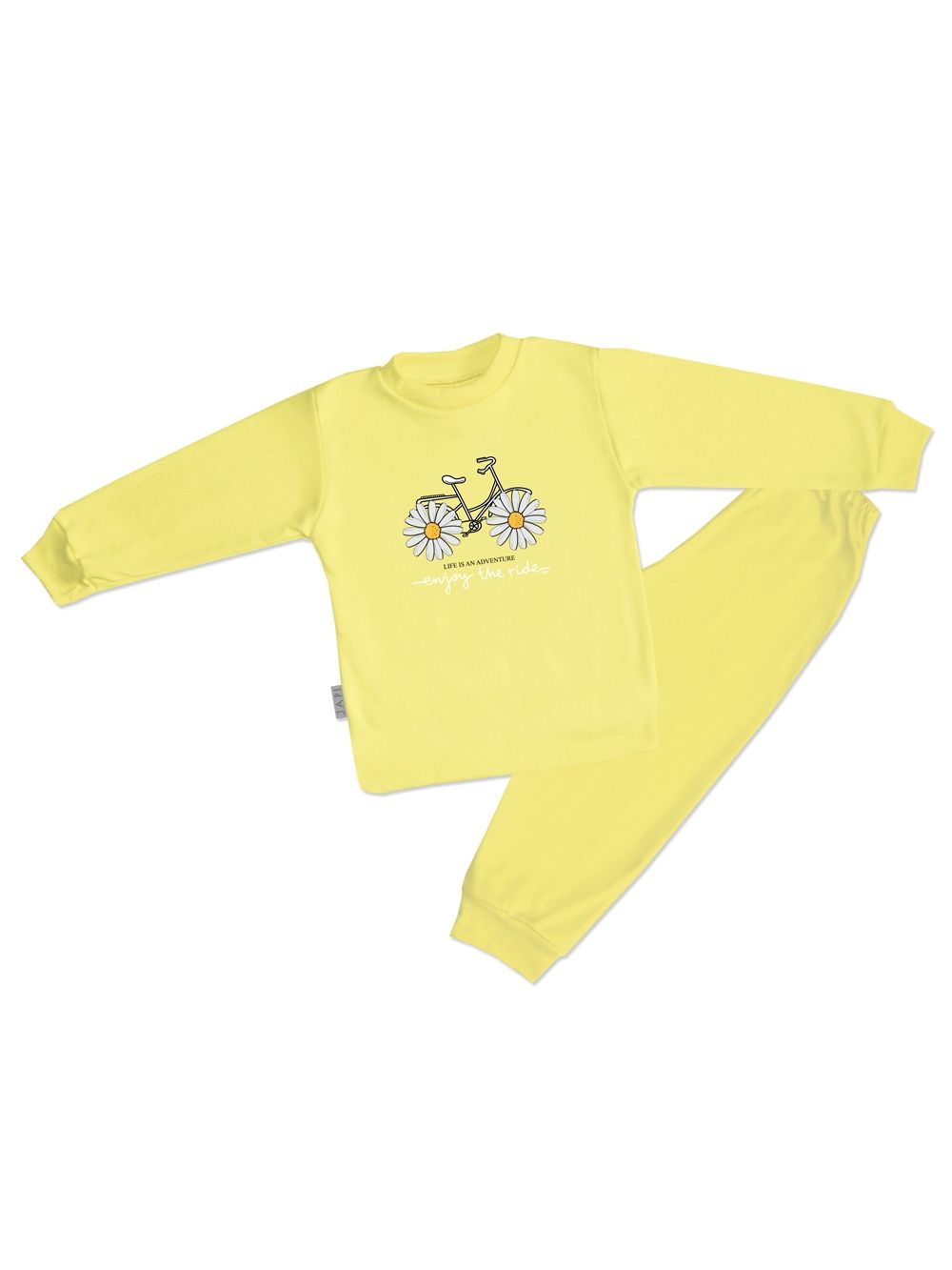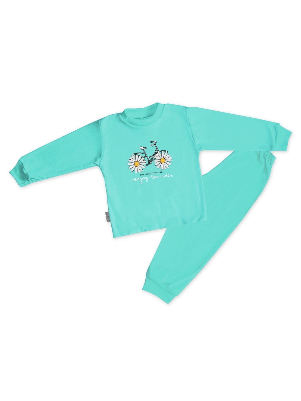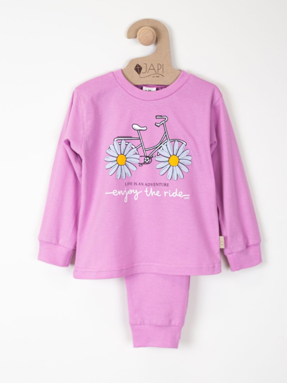 This cute children's pajama is perfect for any child who loves colors and fun. Made from soft and comfortable material, it provides maximum comfort during sleep. The top part of the pajamas features a cheerful picture of a bicycle with daisies instead of wheels and the inscription "Enjoy the ride". Available in four attractive colors: purple, pink, turquoise, and yellow, these pajamas are the perfect choice for every little princess.