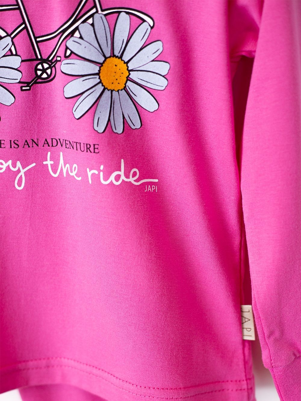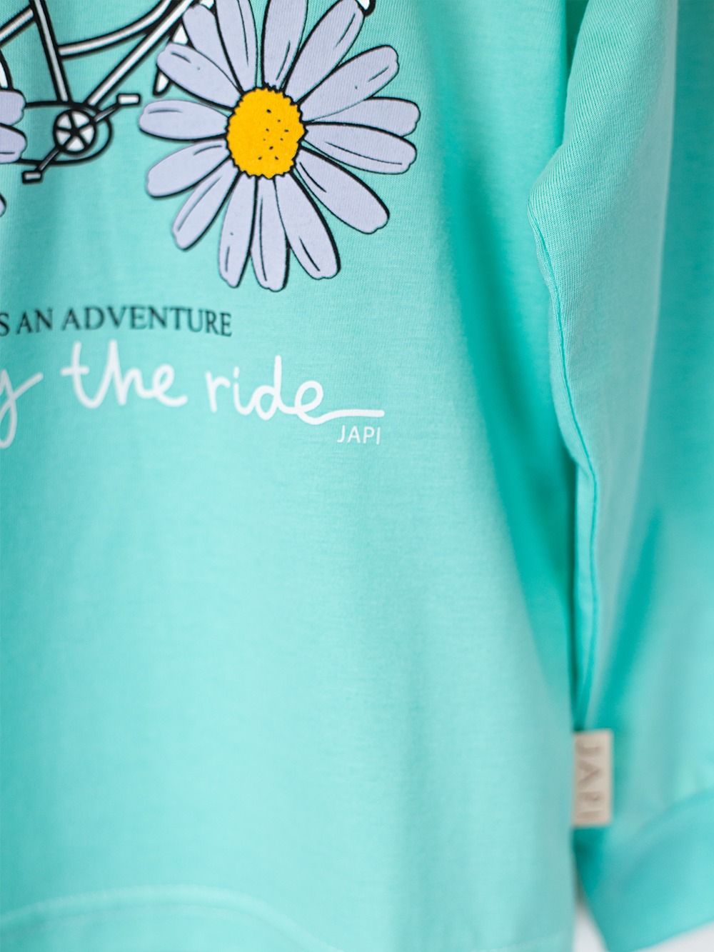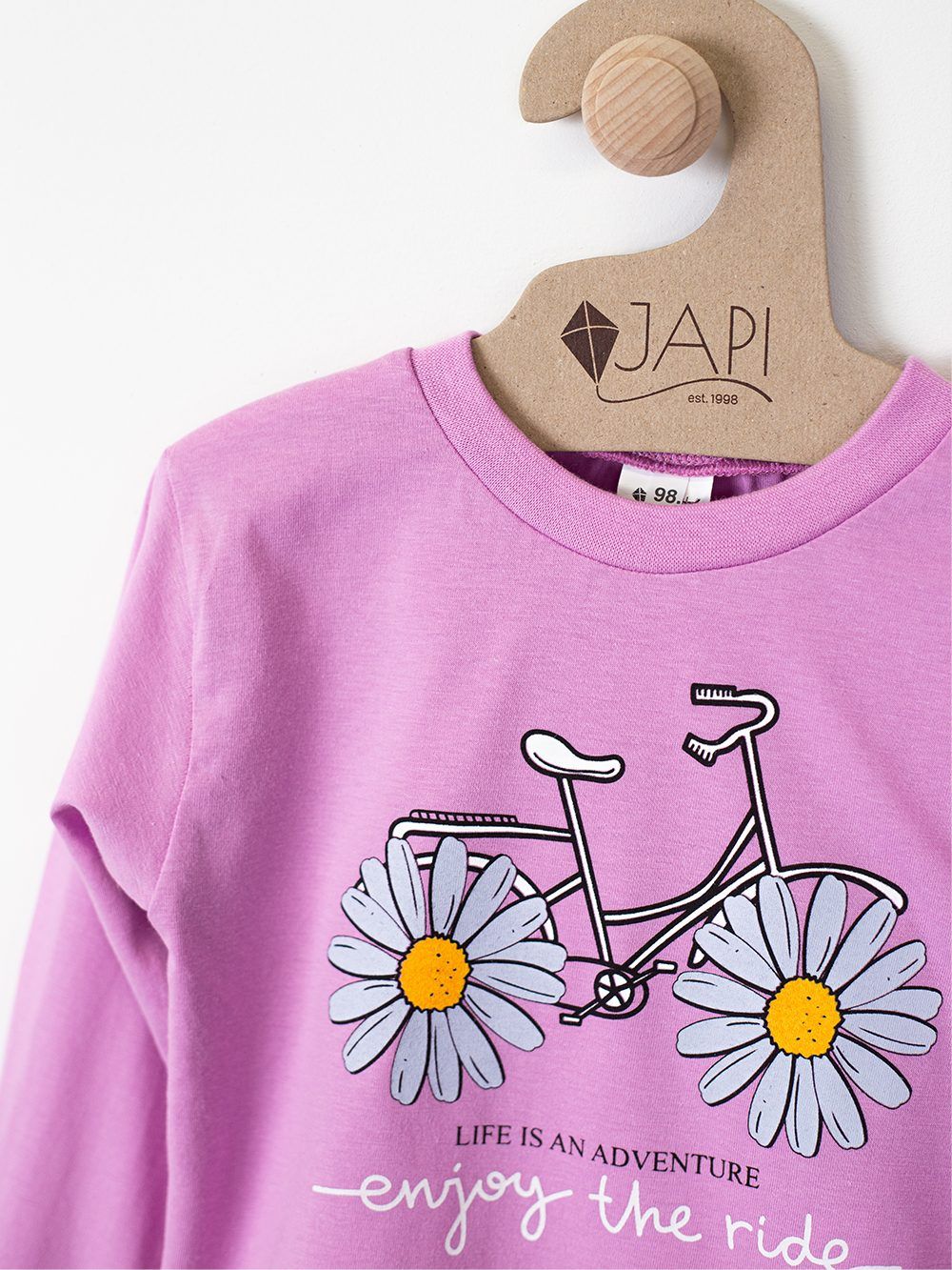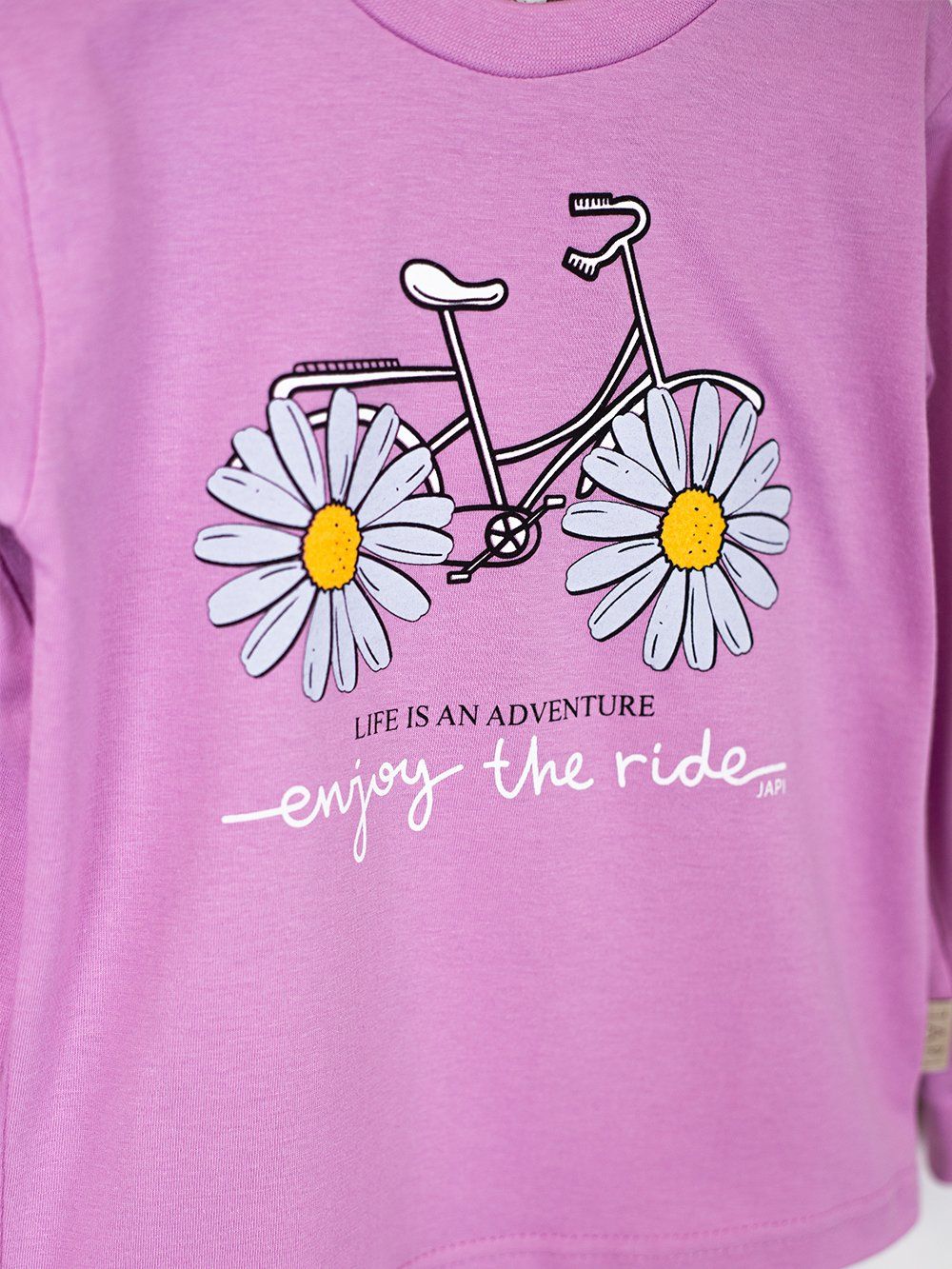 This cute children's pajama is perfect for any child who loves colors and fun. Made from soft and comfortable material, it provides maximum comfort during sleep. The top part of the pajamas features a cheerful picture of a bicycle with daisies instead of wheels and the inscription "Enjoy the ride". Available in four attractive colors: purple, pink, turquoise, and yellow, these pajamas are the perfect choice for every little princess.