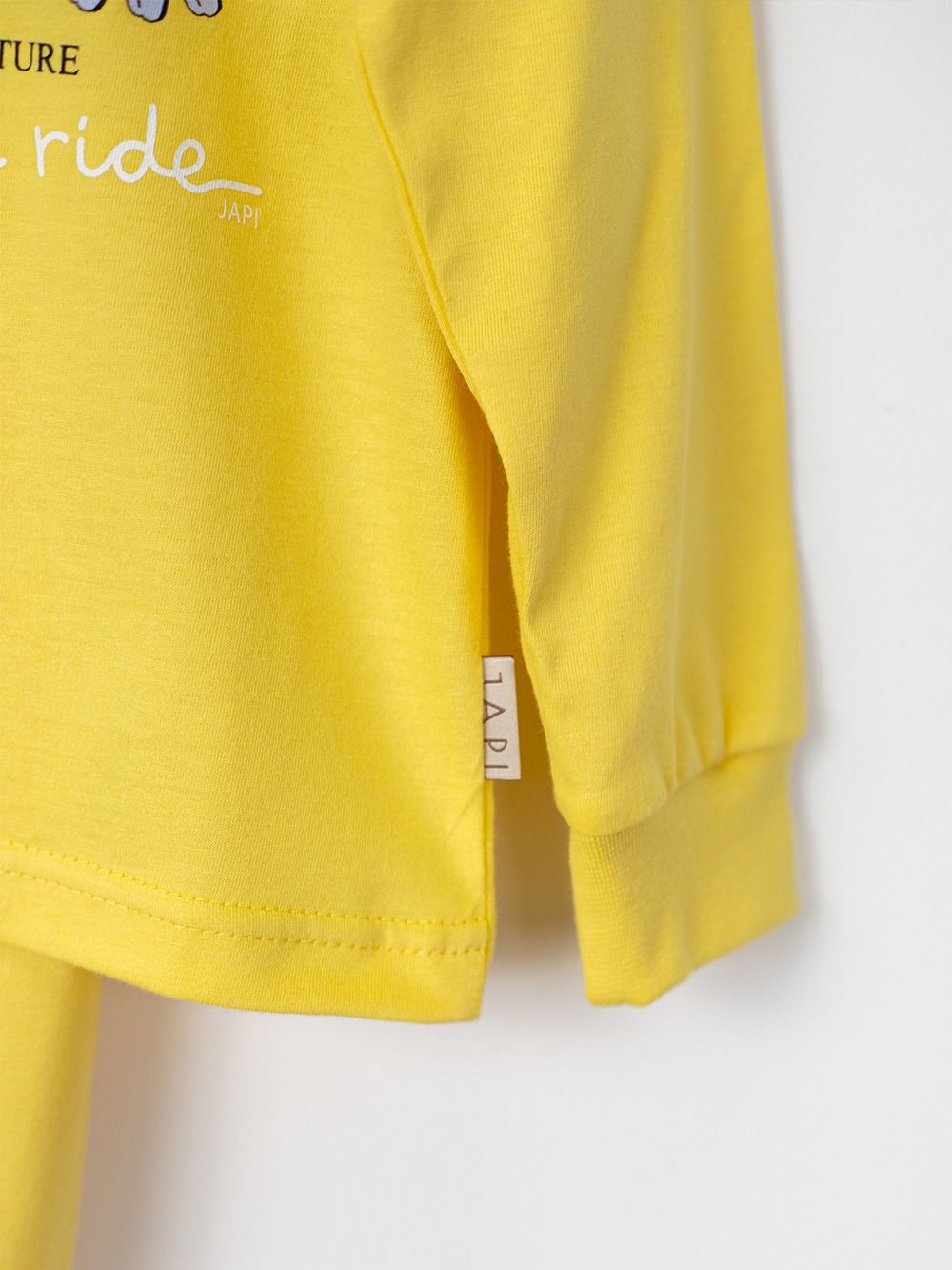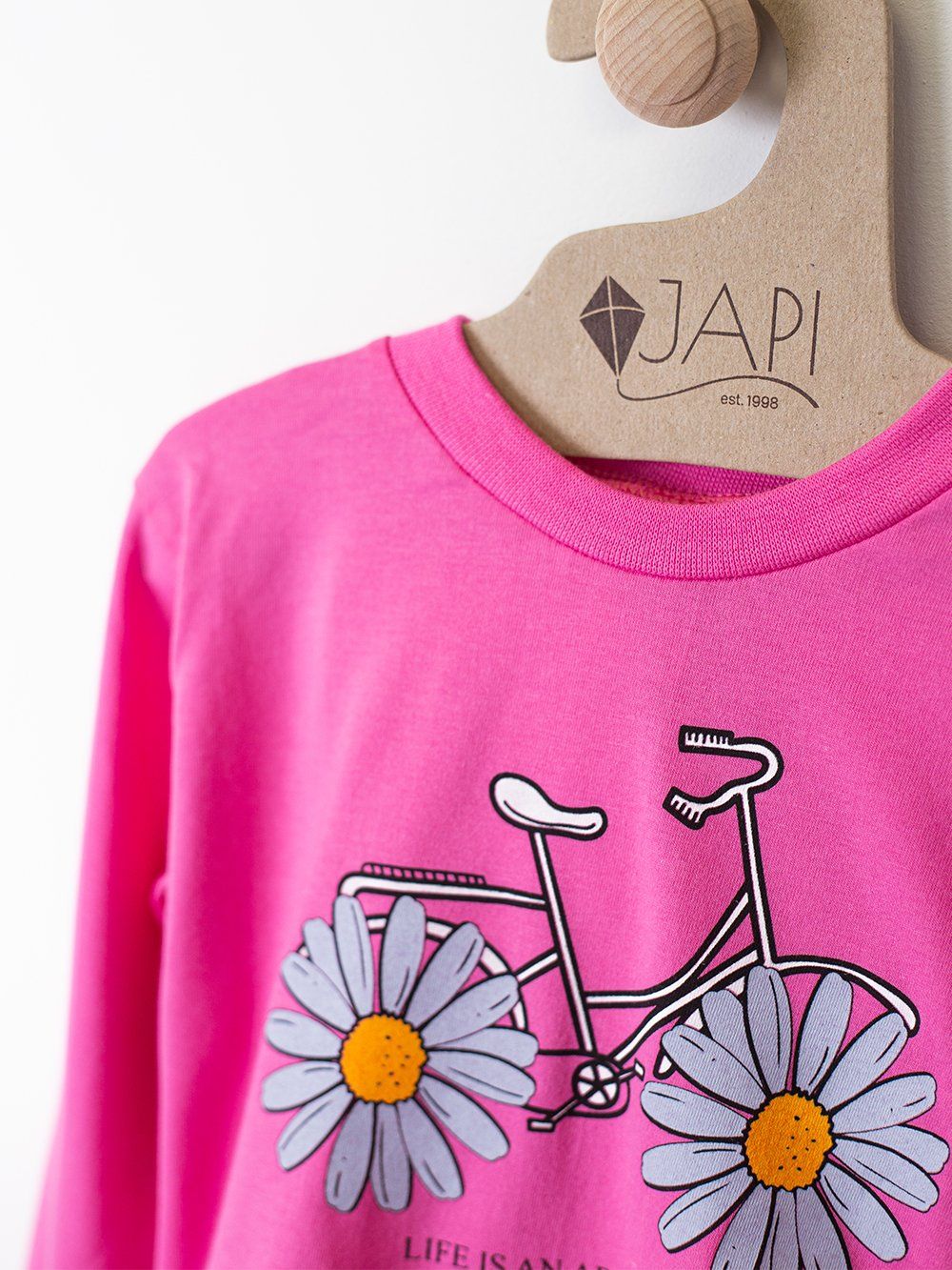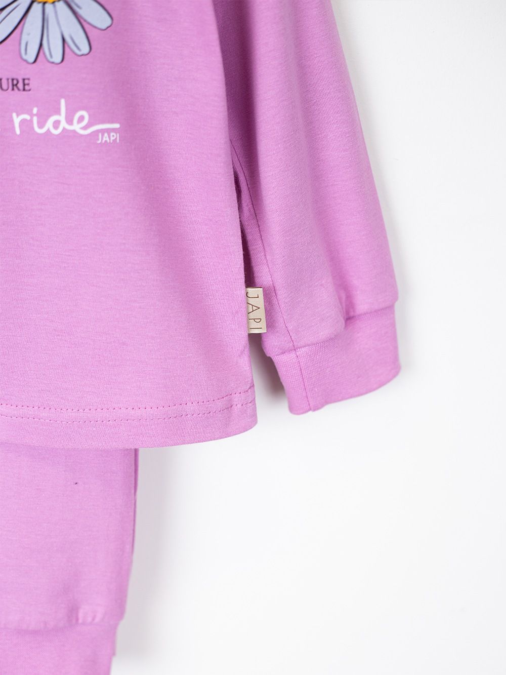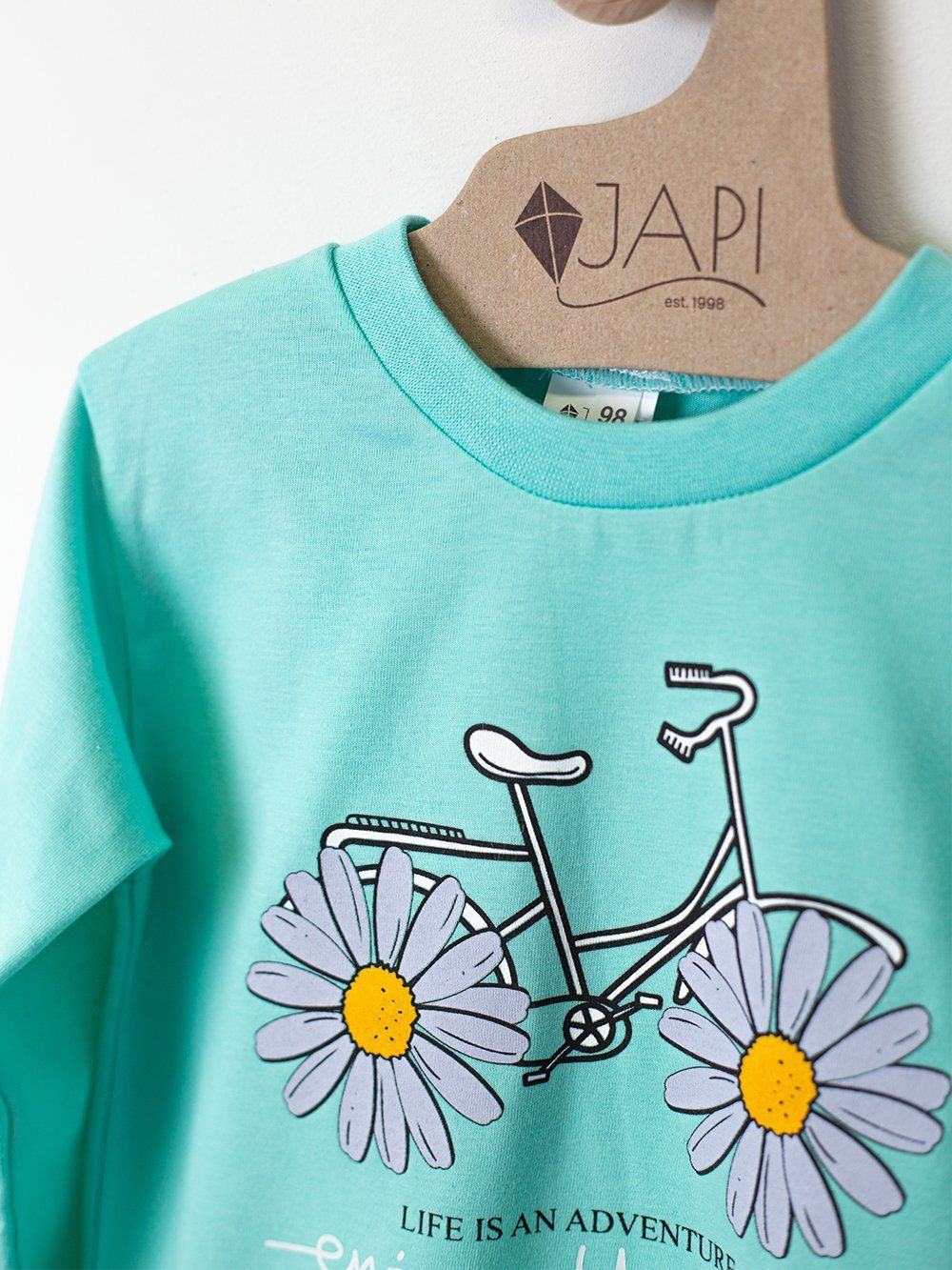 This cute children's pajama is perfect for any child who loves colors and fun. Made from soft and comfortable material, it provides maximum comfort during sleep. The top part of the pajamas features a cheerful picture of a bicycle with daisies instead of wheels and the inscription "Enjoy the ride". Available in four attractive colors: purple, pink, turquoise, and yellow, these pajamas are the perfect choice for every little princess.