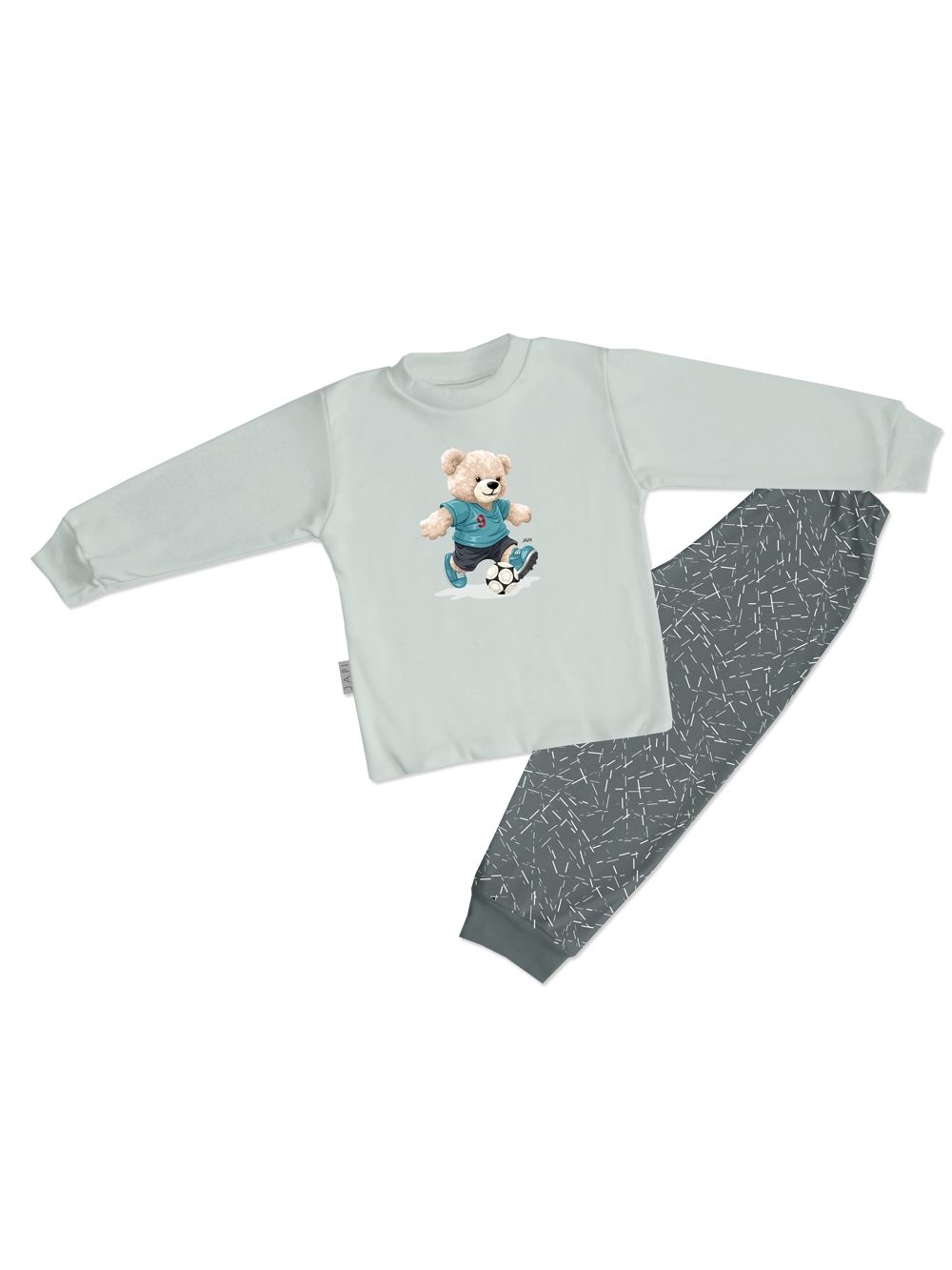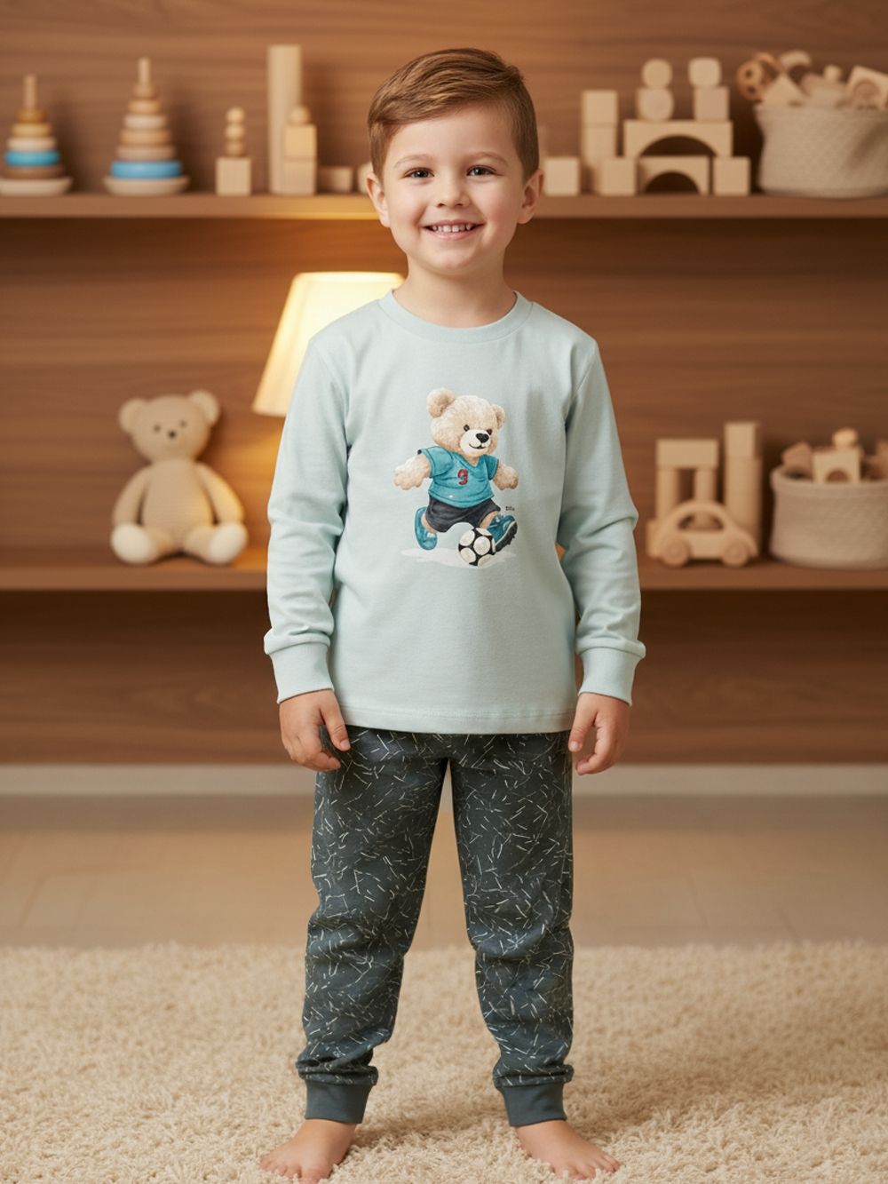 Cheerful boys' pyjamas with a football bear GAME are perfect for little athletes. The top features an illustration of a bear in a sports jersey kicking a ball – a favorite among young football fans. Made from high-quality cotton, it's soft to the touch and ensures comfort throughout the night. The dark grey pants with a subtle pattern and an elastic waistband are both comfortable and well-fitting. Boys’ pyjamas have long sleeves and pants to keep warm on colder nights. The cut is designed to allow free movement and ensure restful sleep.