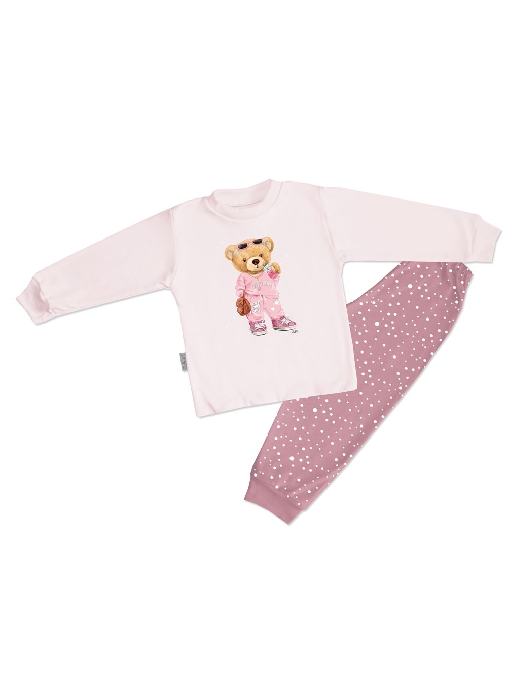 Adorable girls’ pyjamas featuring a stylish teddy will delight every little fashionista who loves style even while sleeping. The top showcases a detailed illustration of a teddy in a pink outfit and sunglasses. Made from soft and breathable cotton, it’s exceptionally comfortable to wear and gentle on children's sensitive skin. The trousers with a white polka-dot pattern and elastic waistband provide comfort and freedom of movement throughout the night. Long sleeves and trousers ensure warmth even on cooler evenings.