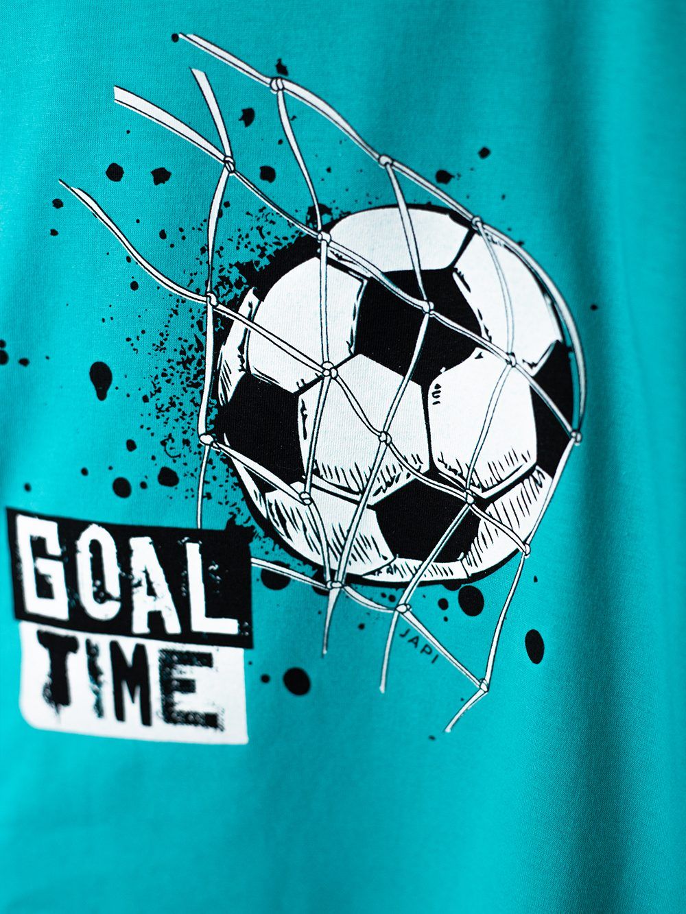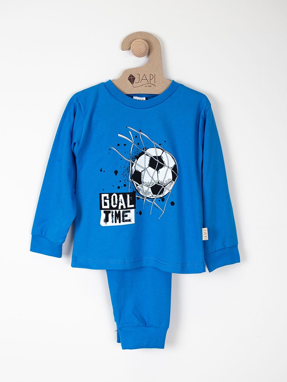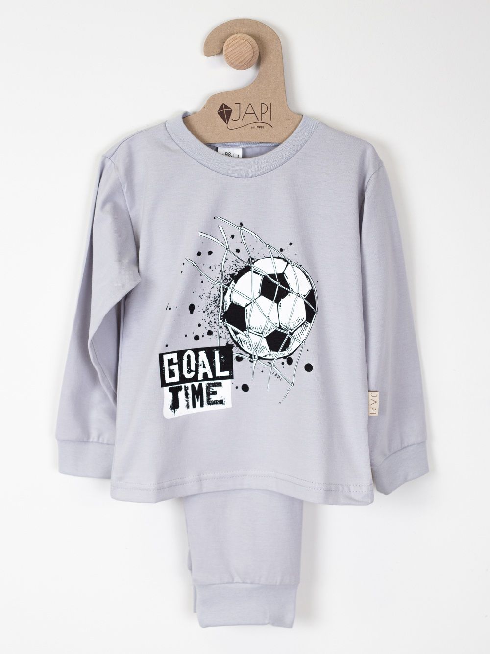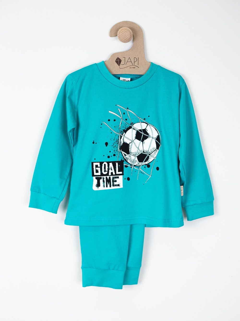 This stylish boys' pajama is designed for all little football players who dream of scoring big goals. Made from high-quality material, it ensures comfort throughout the night. The top part of the pajamas is adorned with a dynamic image of a soccer ball and the inscription "Goal Time". Available in four trendy colors: light blue, blue, gray, and green, these pajamas bring joy and a sporty spirit to every boys' room.