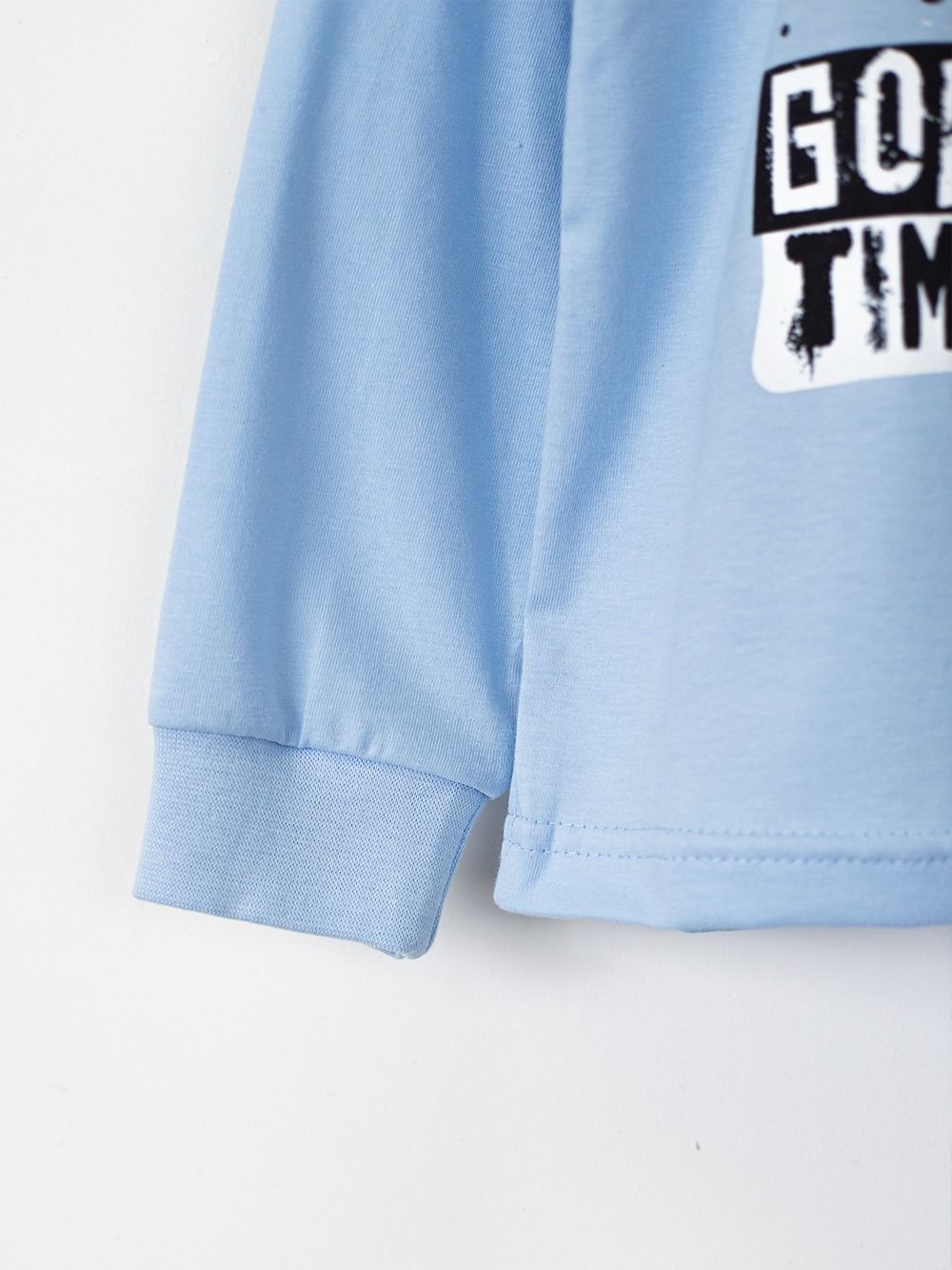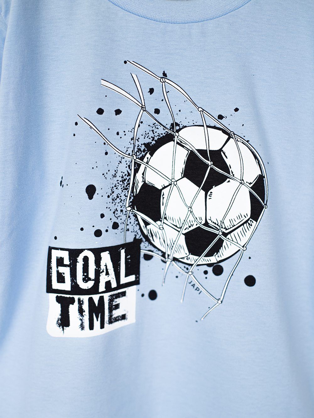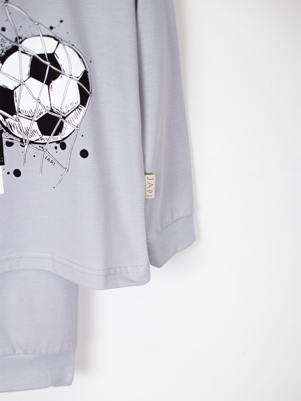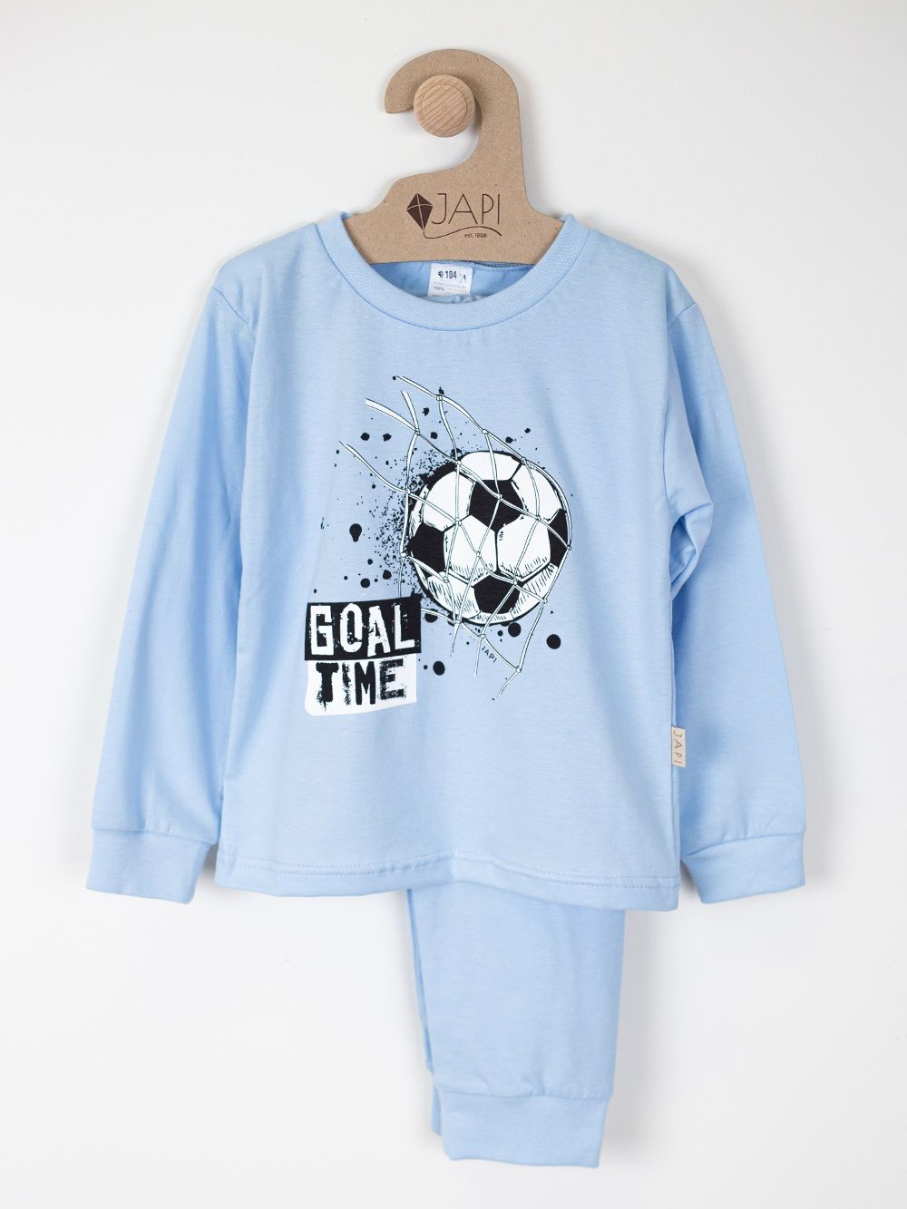 This stylish boys' pajama is designed for all little football players who dream of scoring big goals. Made from high-quality material, it ensures comfort throughout the night. The top part of the pajamas is adorned with a dynamic image of a soccer ball and the inscription "Goal Time". Available in four trendy colors: light blue, blue, gray, and green, these pajamas bring joy and a sporty spirit to every boys' room.