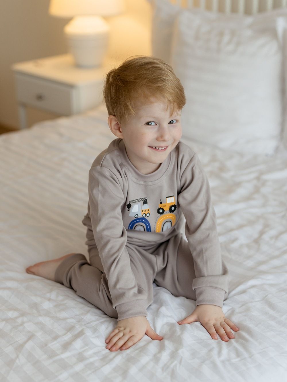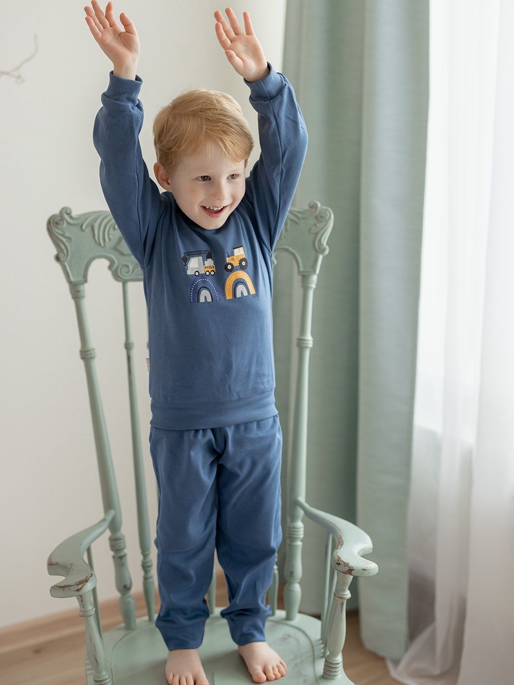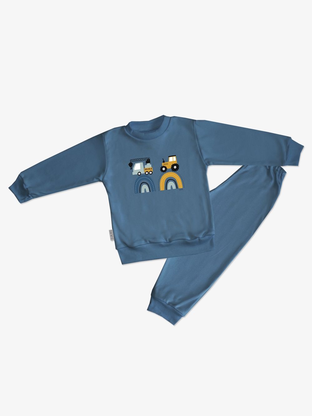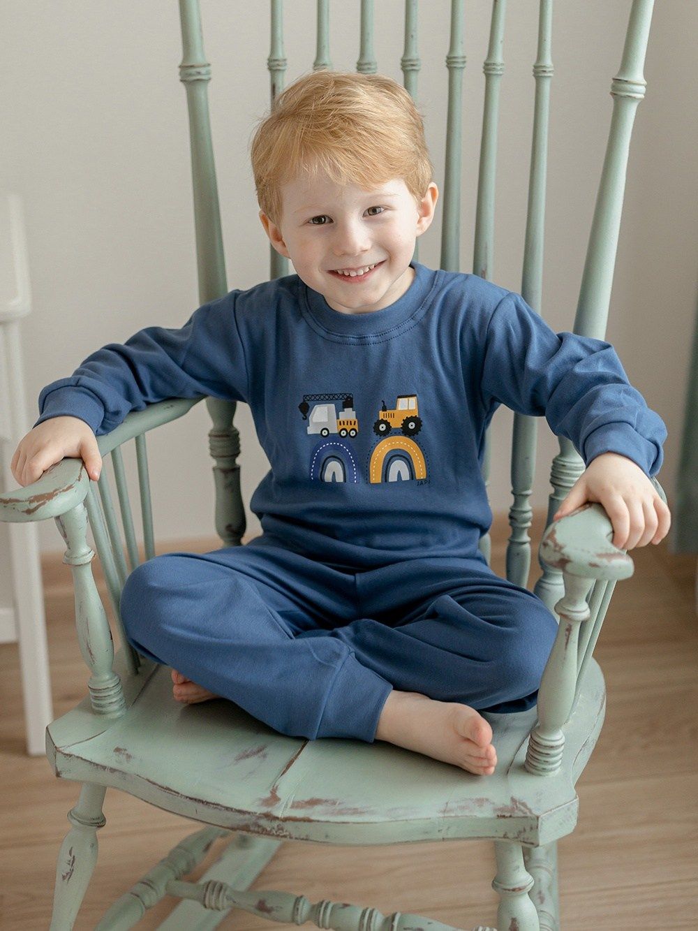 Make your little son happy with this pyjama. If he likes big cars - tractors, excavators, cranes, this pyjama will definitely not disappoint him. The pyjamas are made of 100% certified cotton fabric. It has a comfortable cut and an elastic waistband that does not press. The legs and sleeves have ribbed cuffs that keep the pyjamas in place.