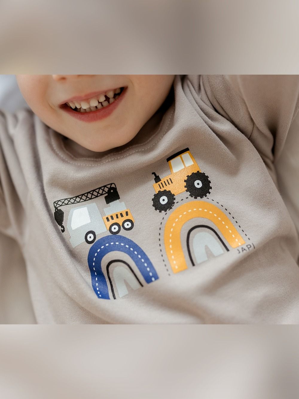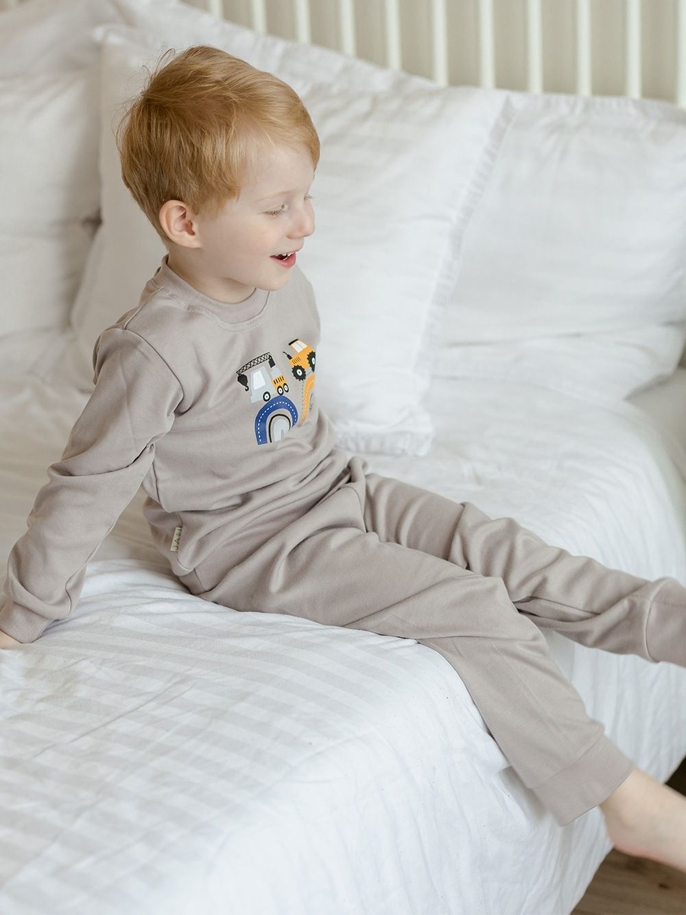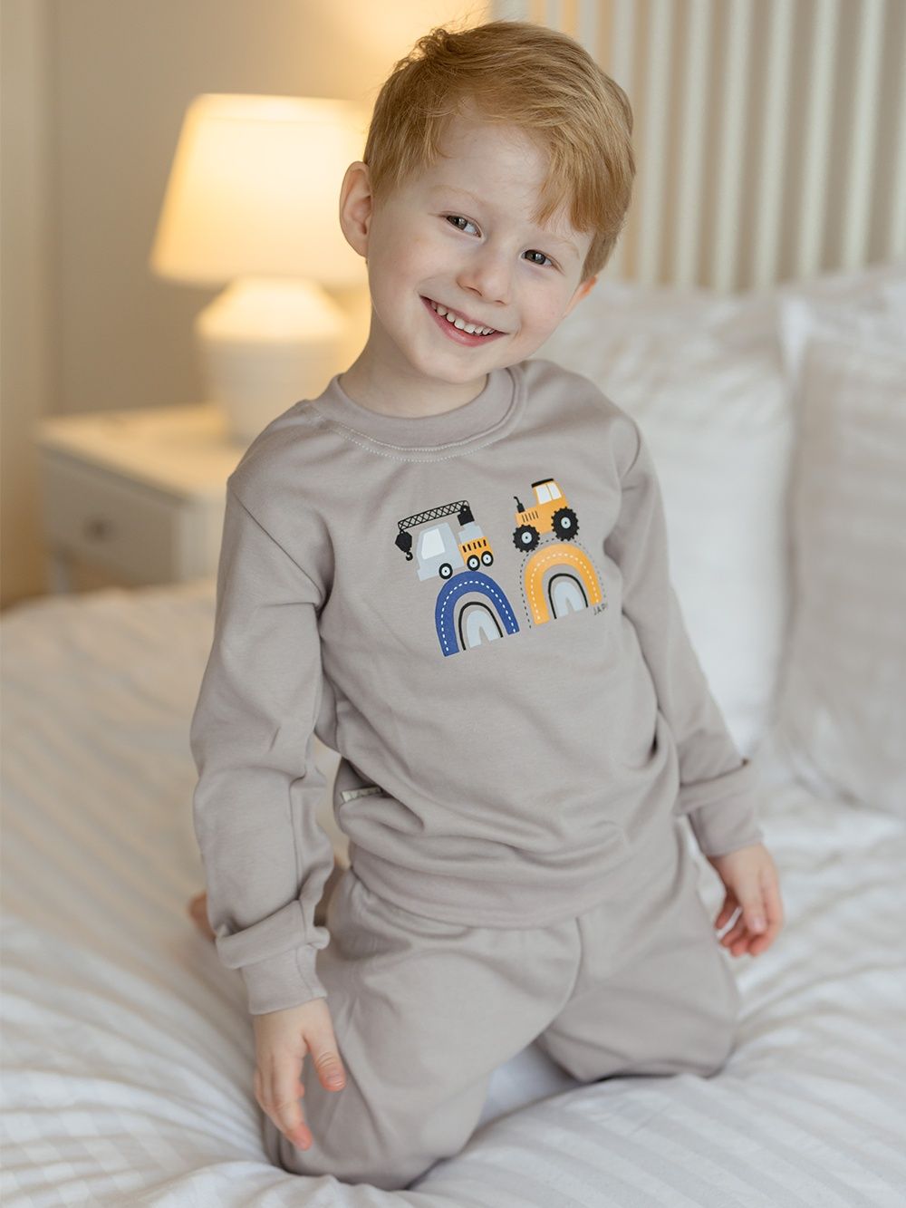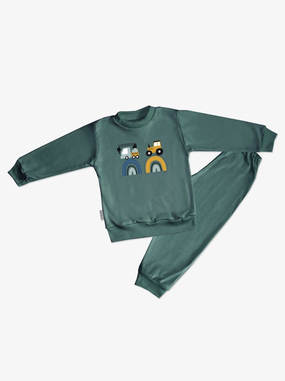 Make your little son happy with this pyjama. If he likes big cars - tractors, excavators, cranes, this pyjama will definitely not disappoint him. The pyjamas are made of 100% certified cotton fabric. It has a comfortable cut and an elastic waistband that does not press. The legs and sleeves have ribbed cuffs that keep the pyjamas in place.