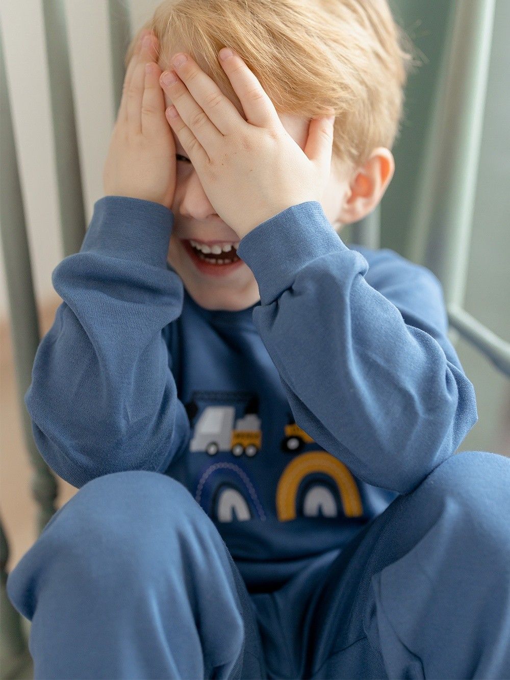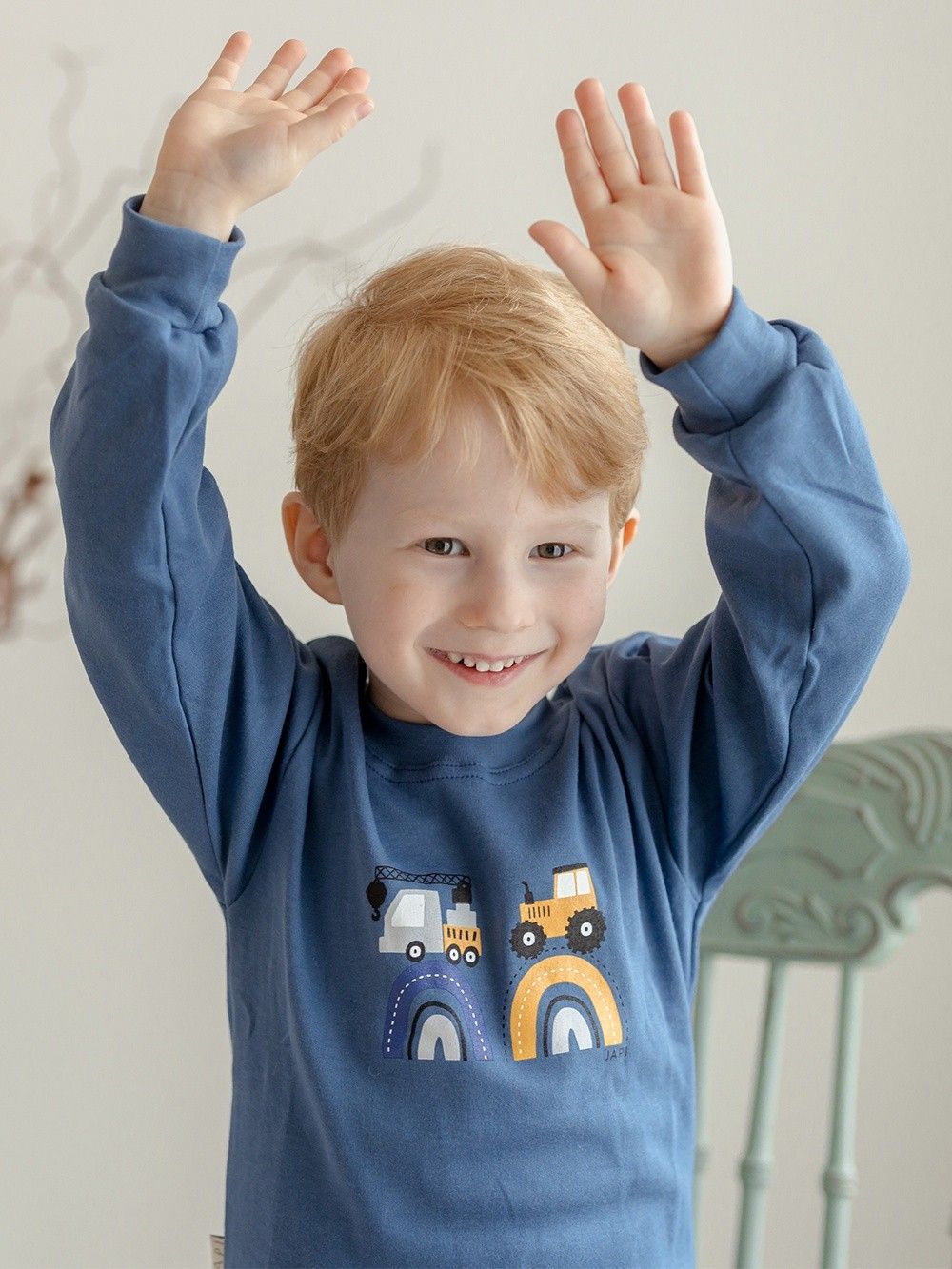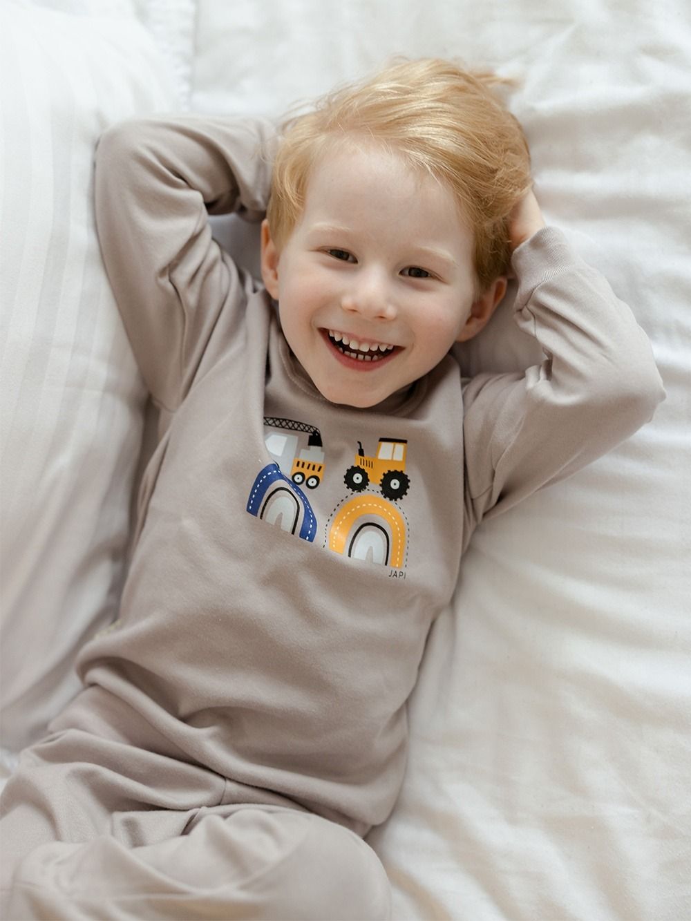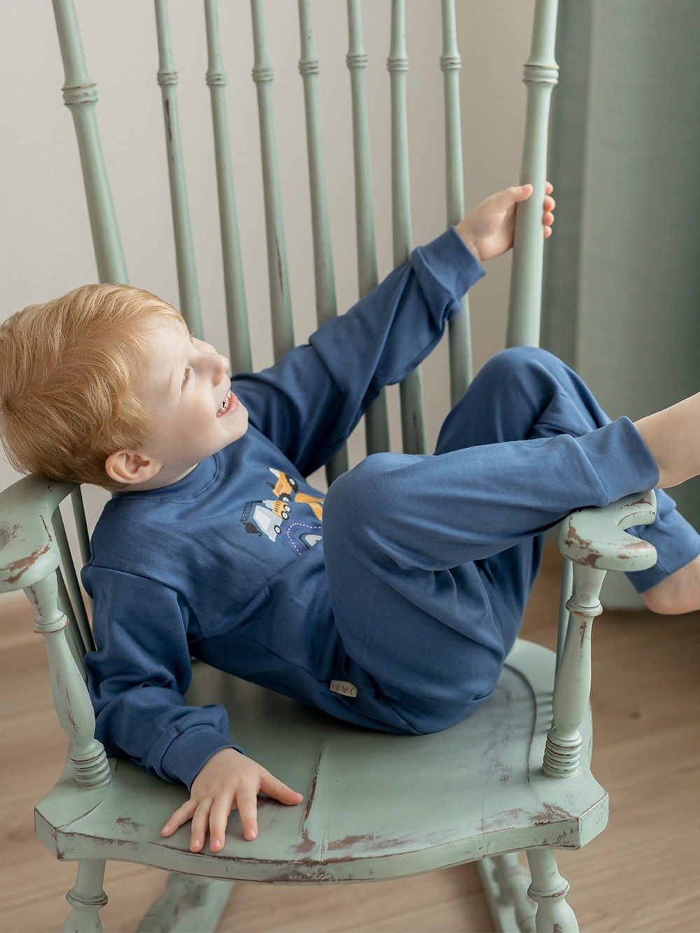 Make your little son happy with this pyjama. If he likes big cars - tractors, excavators, cranes, this pyjama will definitely not disappoint him. The pyjamas are made of 100% certified cotton fabric. It has a comfortable cut and an elastic waistband that does not press. The legs and sleeves have ribbed cuffs that keep the pyjamas in place.