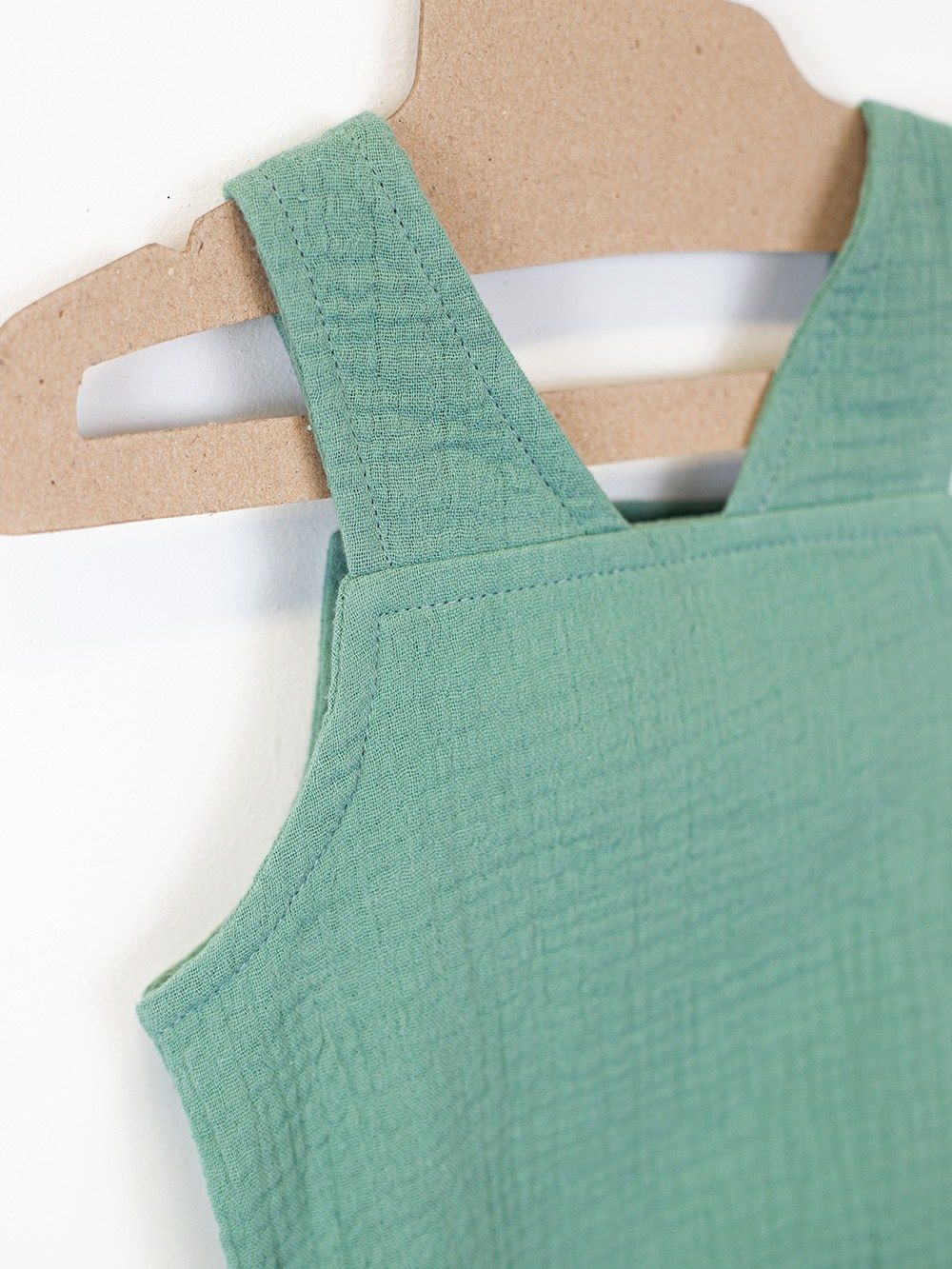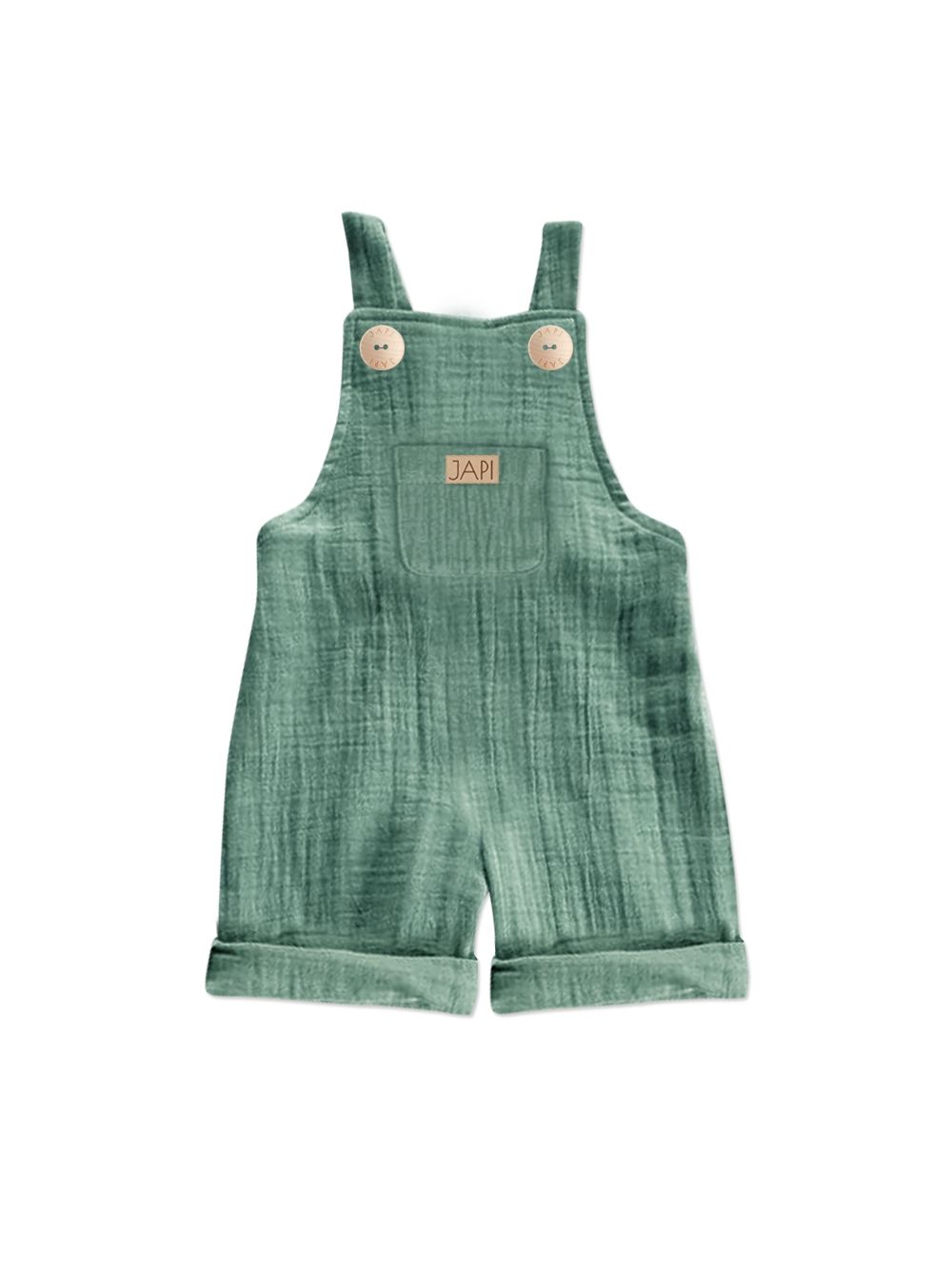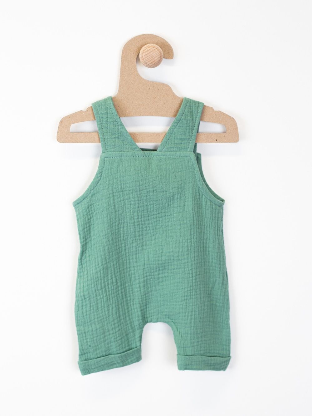 Boy's Muslin Overall ShortsMINERAL. These boy's overall shorts from muslin from the MINERAL collection are an ideal choice for summer. Made from soft and breathable muslin, they are very comfortable. The shorts have adjustable straps and practical pockets. Available in navy blue and light green, they pair well with any shirt or blouse.