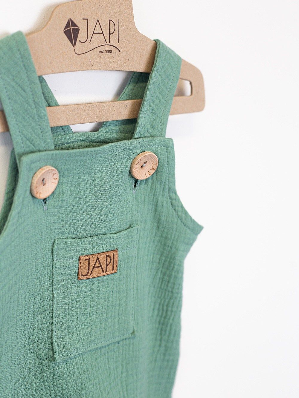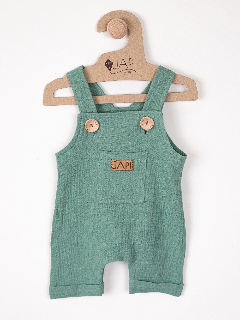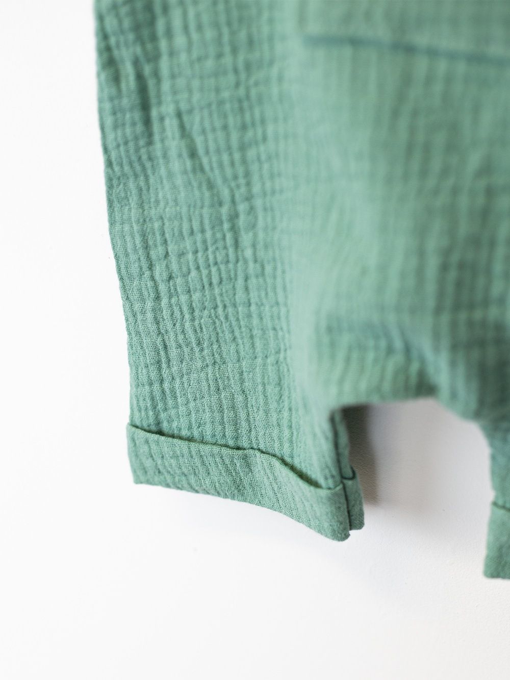 Boy's Muslin Overall ShortsMINERAL. These boy's overall shorts from muslin from the MINERAL collection are an ideal choice for summer. Made from soft and breathable muslin, they are very comfortable. The shorts have adjustable straps and practical pockets. Available in navy blue and light green, they pair well with any shirt or blouse.